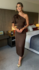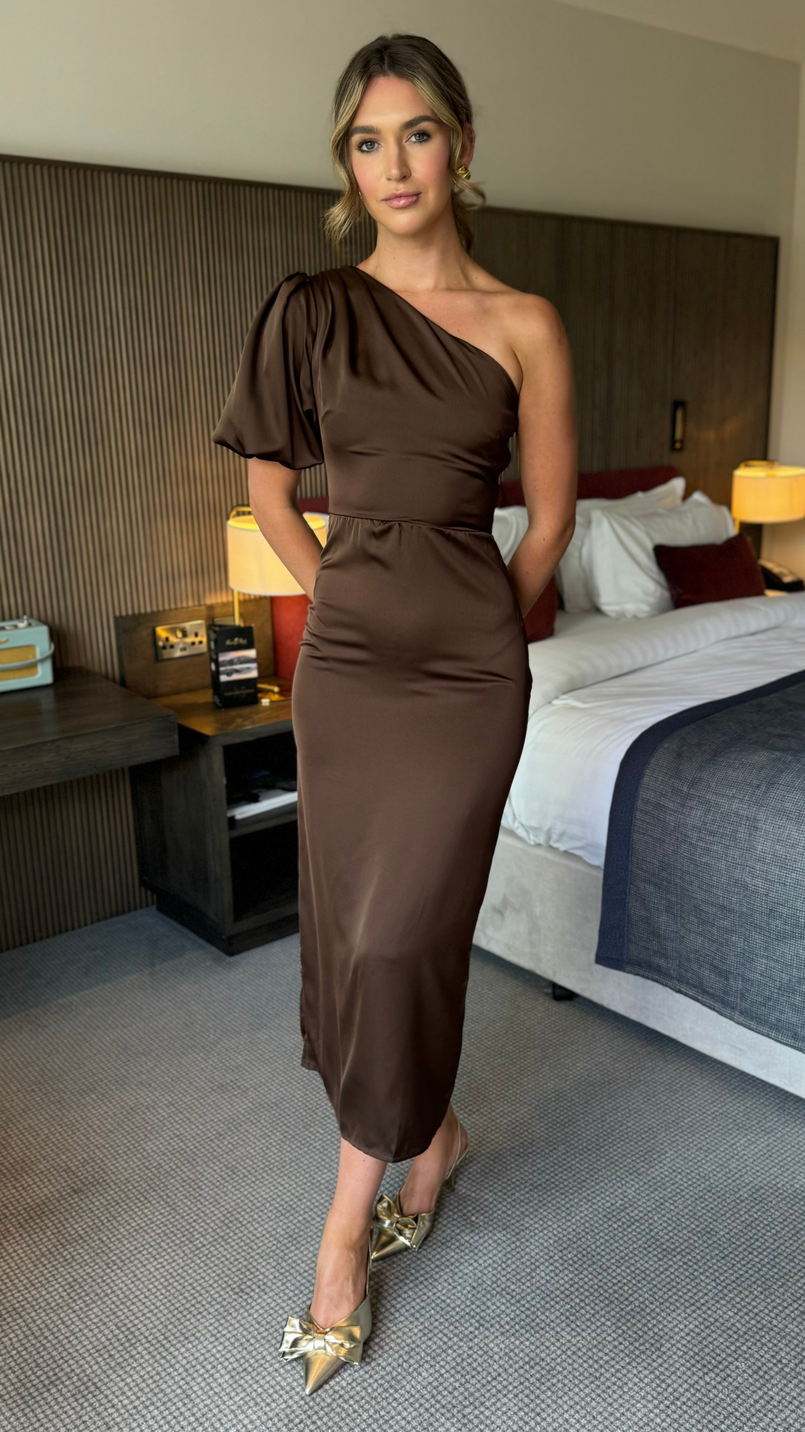 Amaya Brown One Shoulder Satin Finish Midi Dress