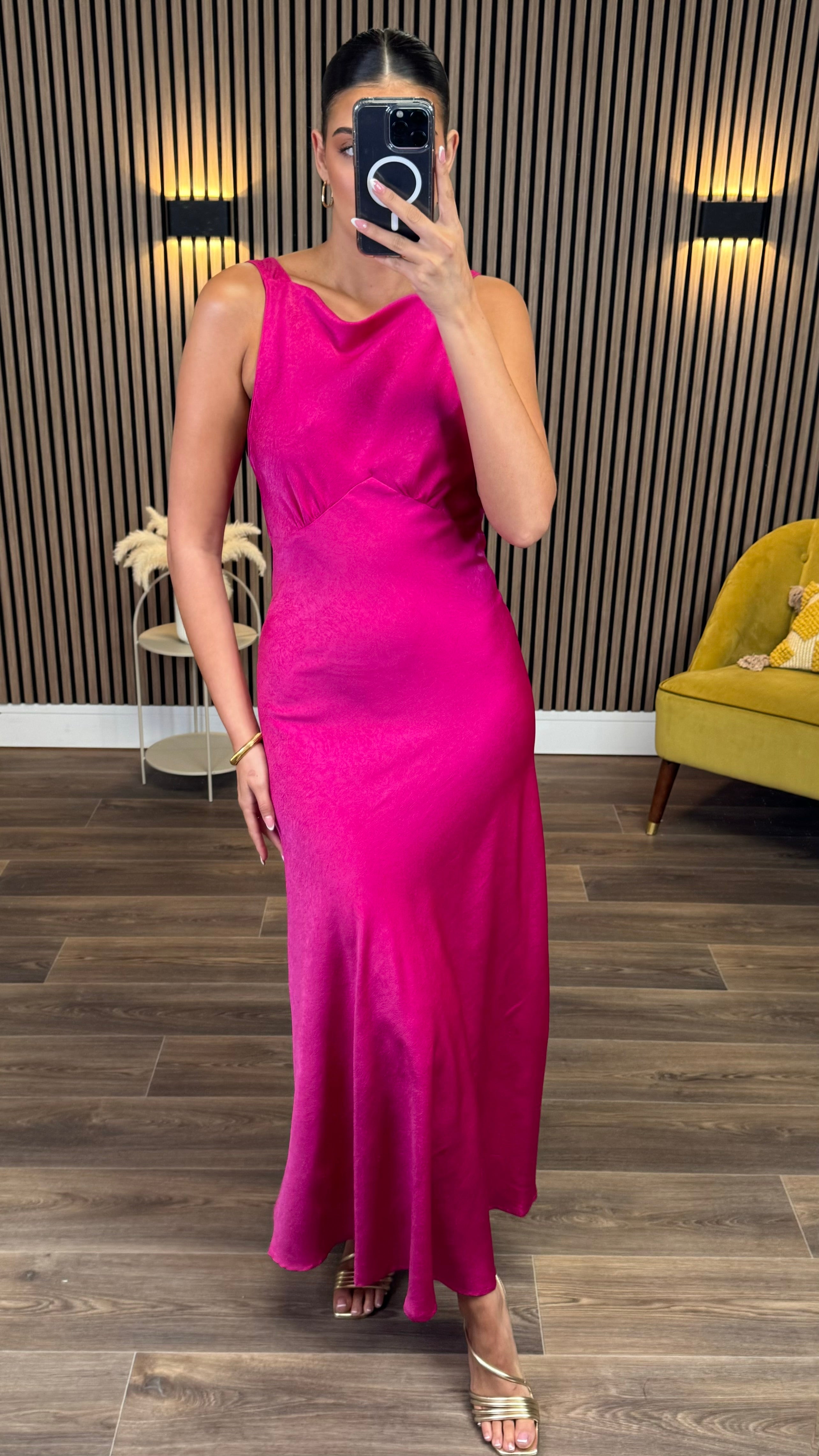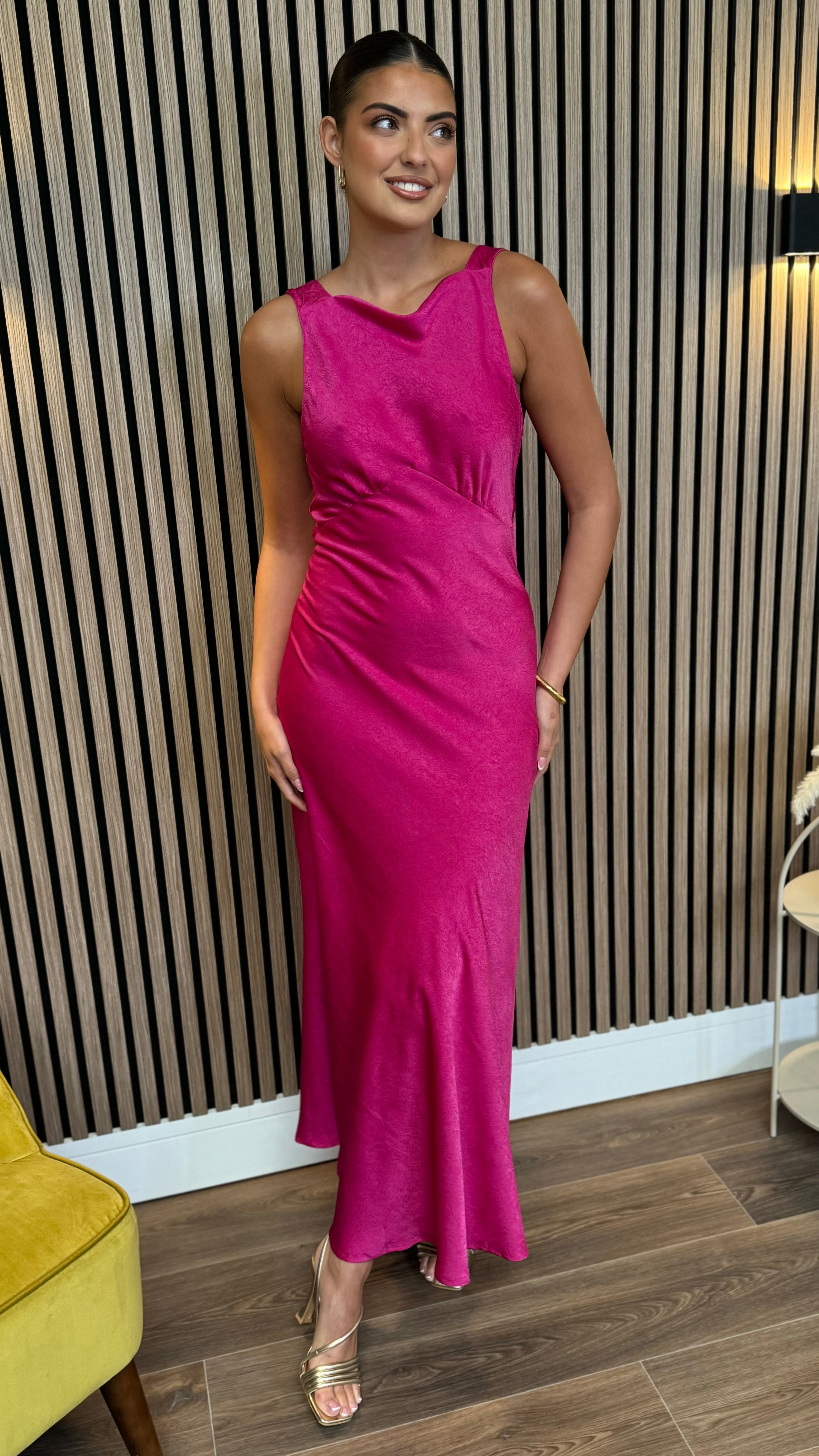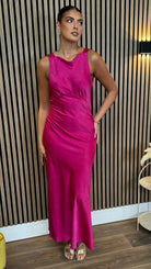 This refined Amber Fuchsia midi dress presents a classic round neckline complemented by an elegant V-back design. The vibrant hue and flattering silhouette make it an impeccable choice for special occasions, from formal gatherings to celebratory events.