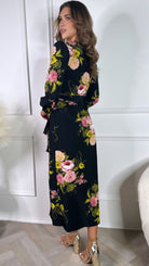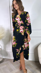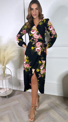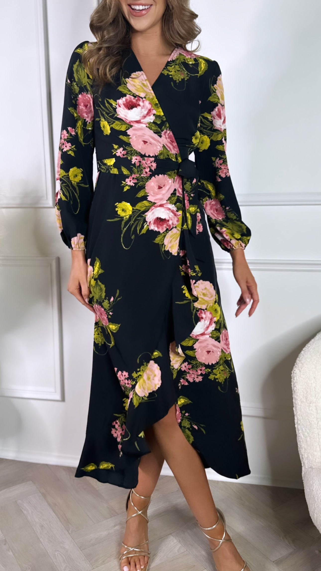 Antonio Black Floral Long Sleeve Wrap Midi Dress