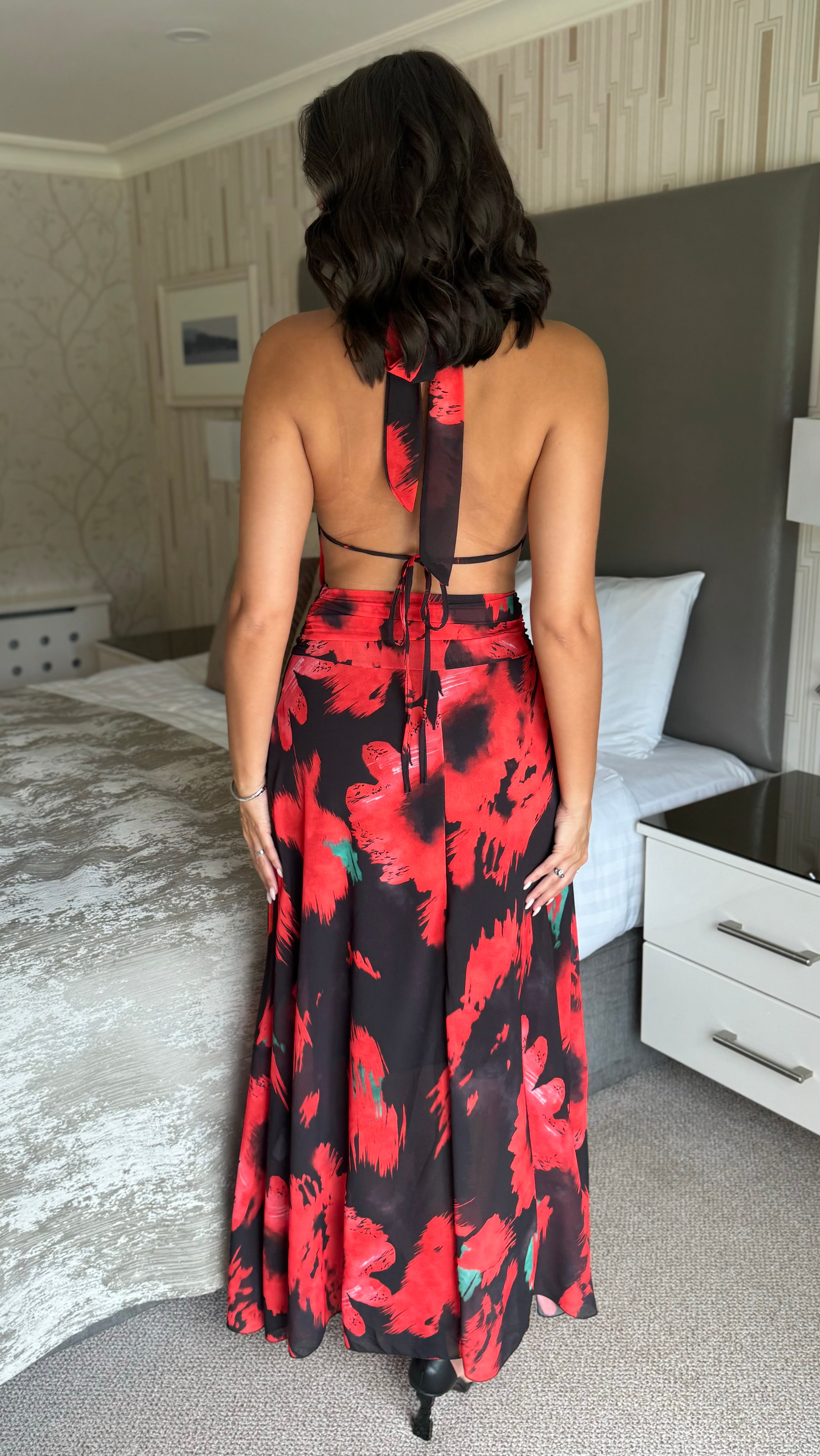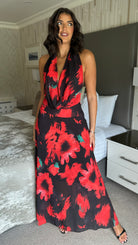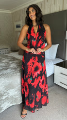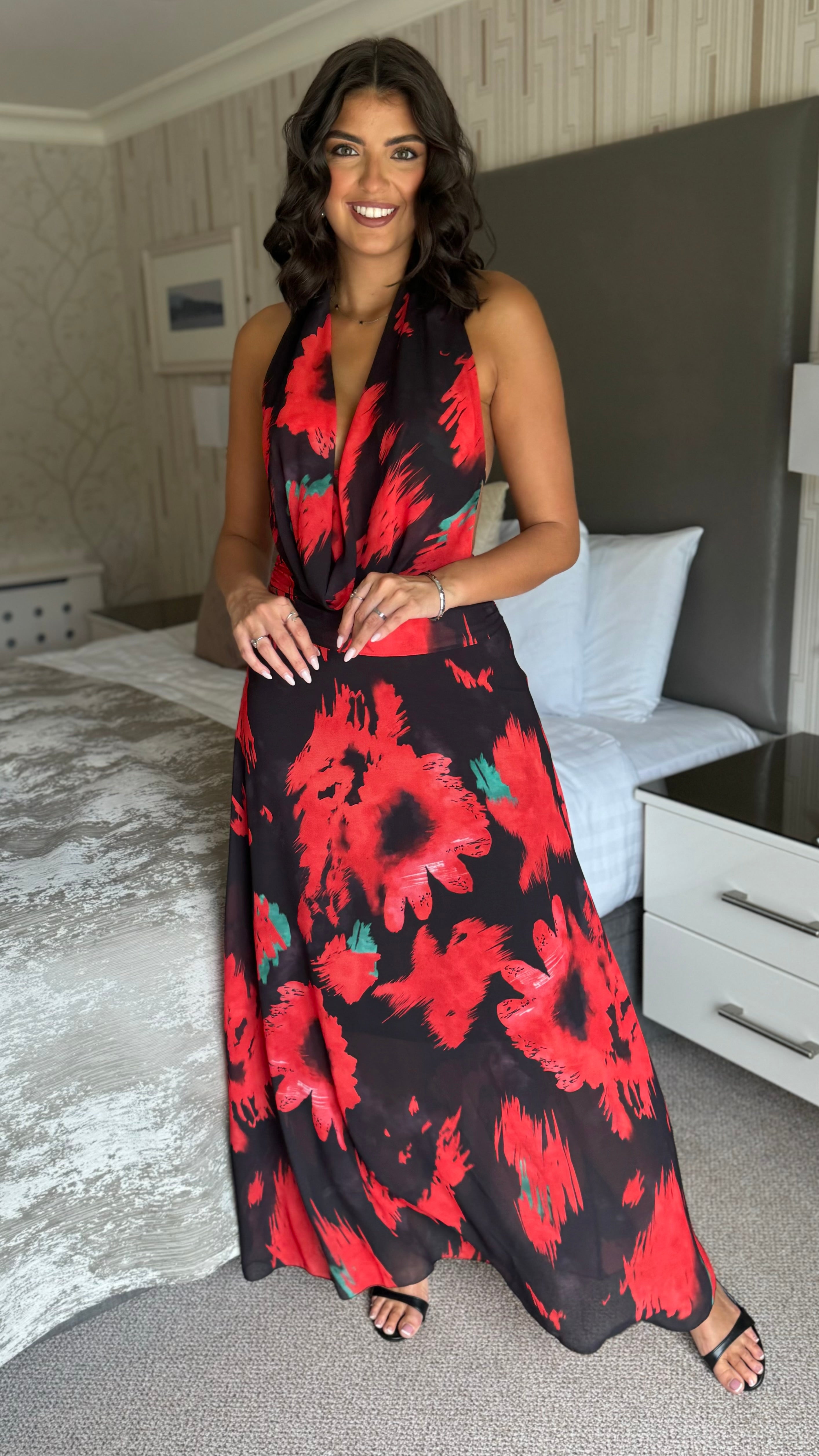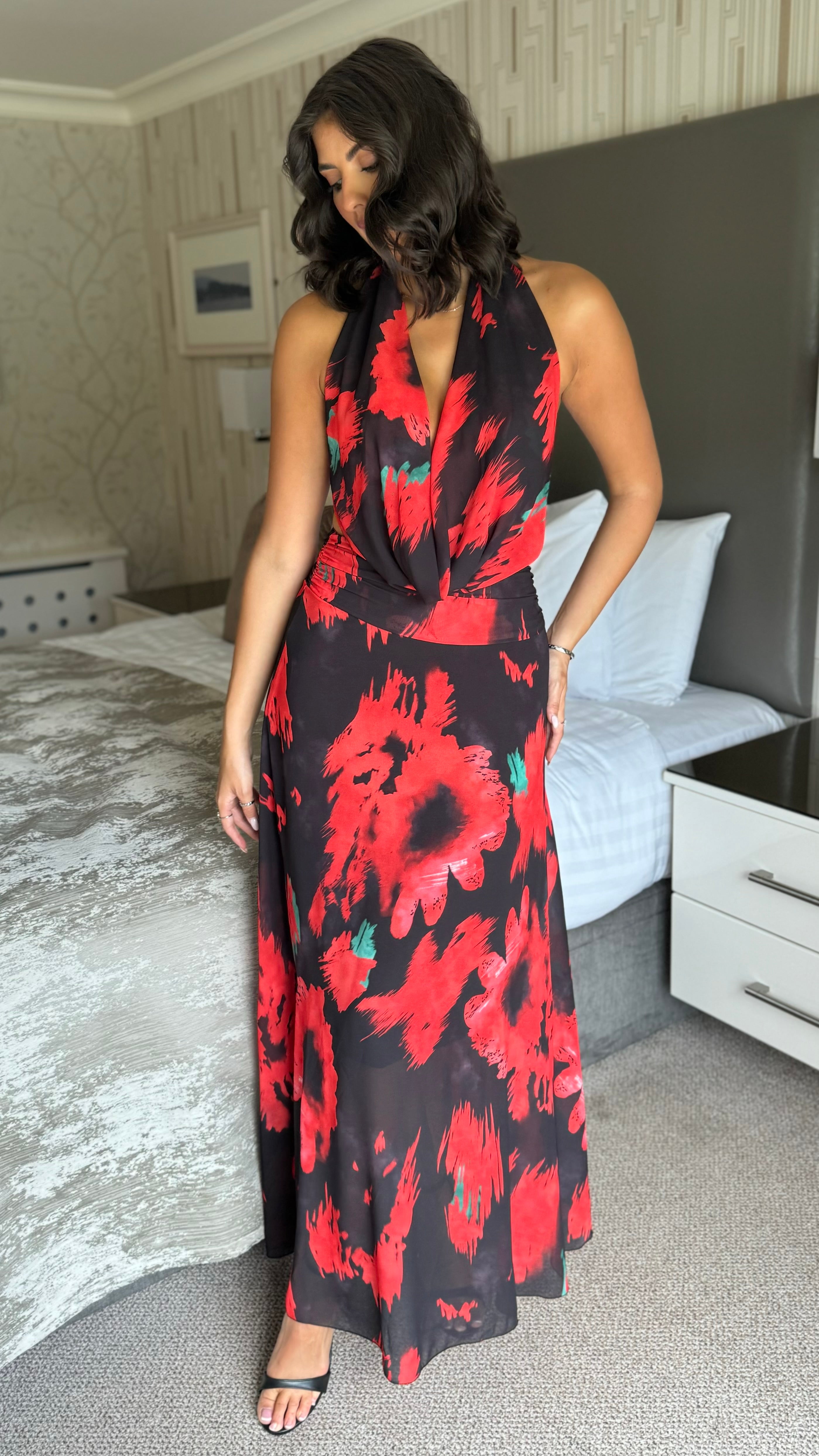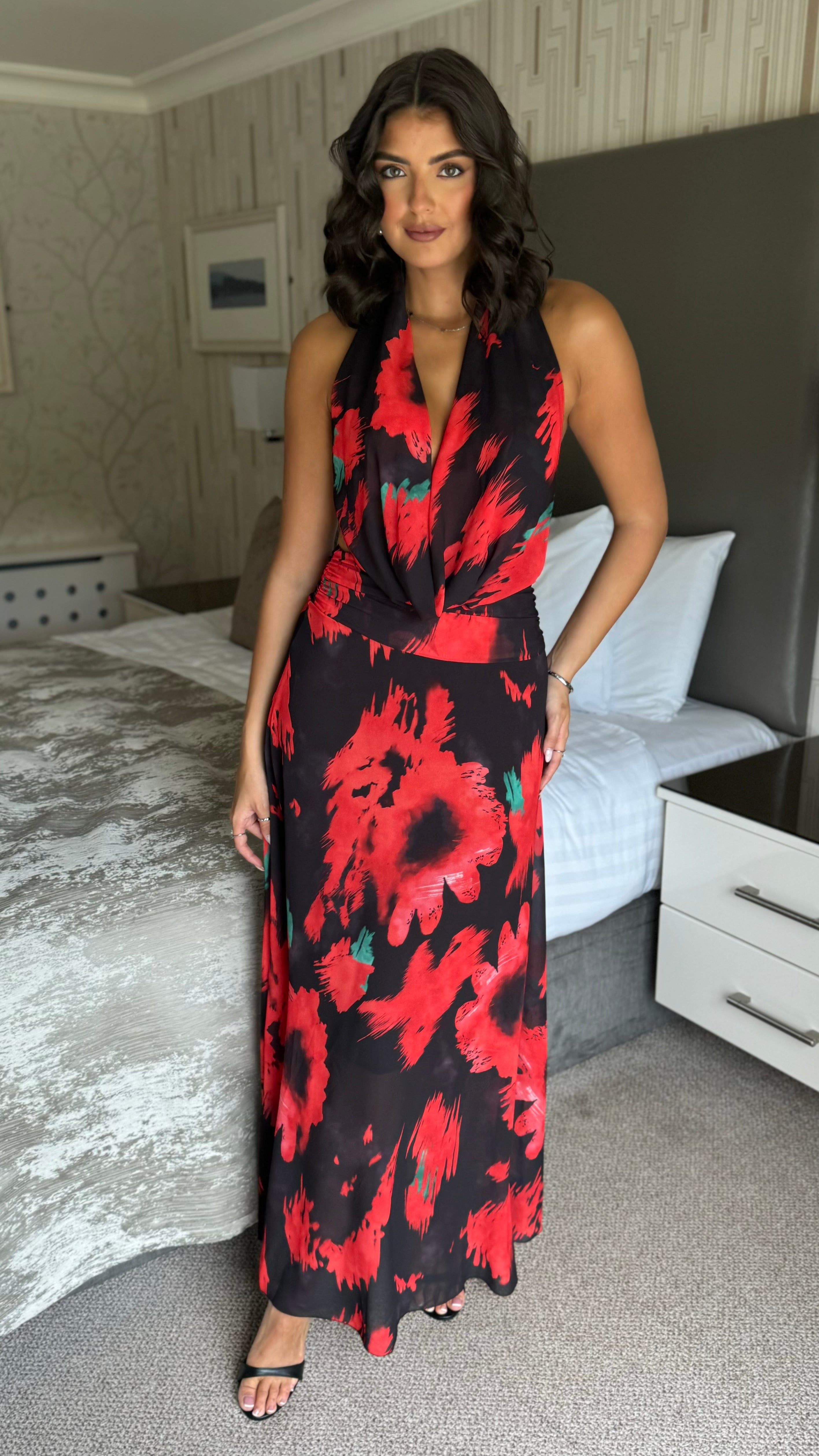 Ari Black & Red Floral Zip Detail Cowl Halterneck Midi Dress