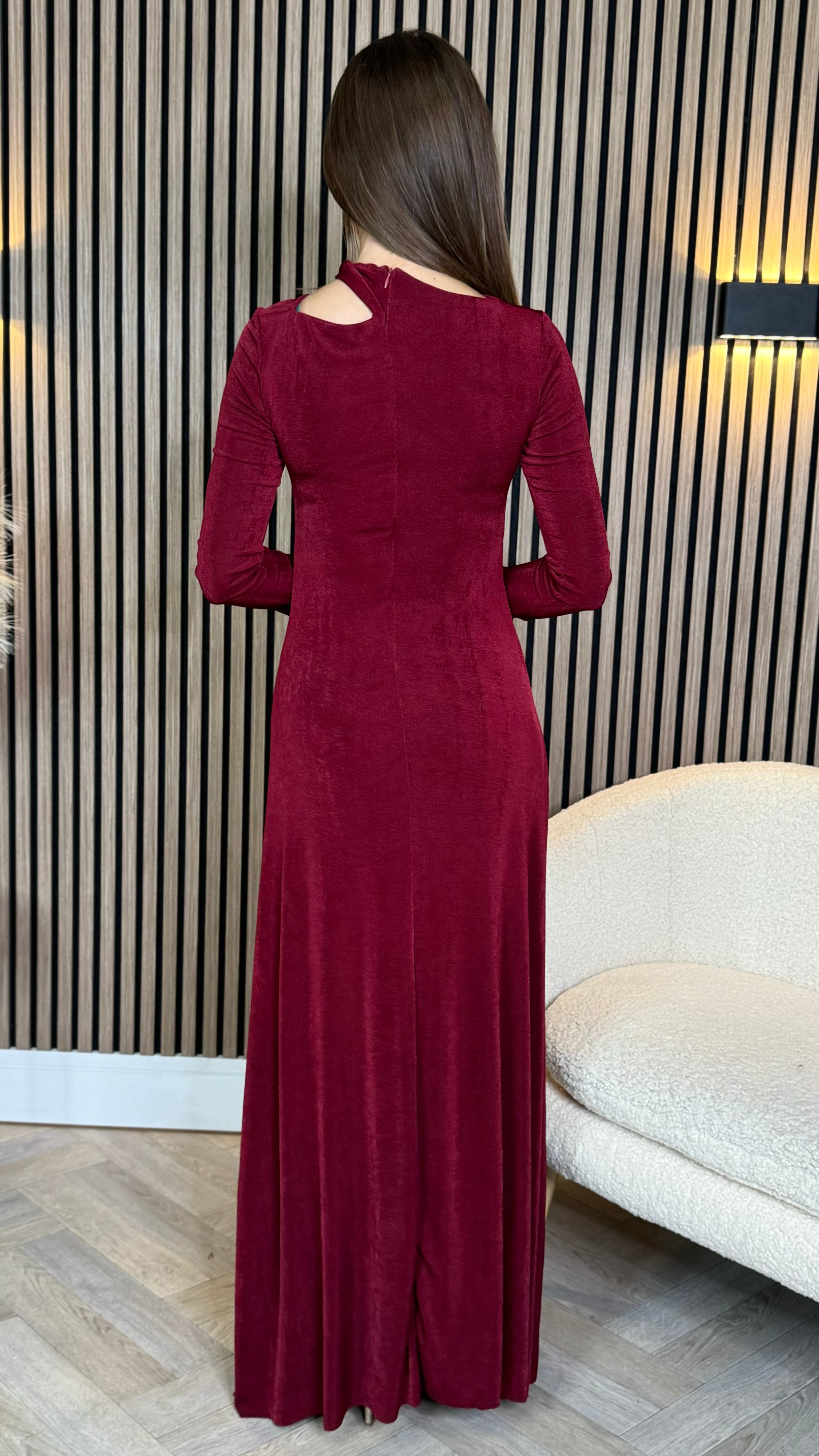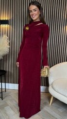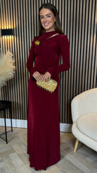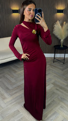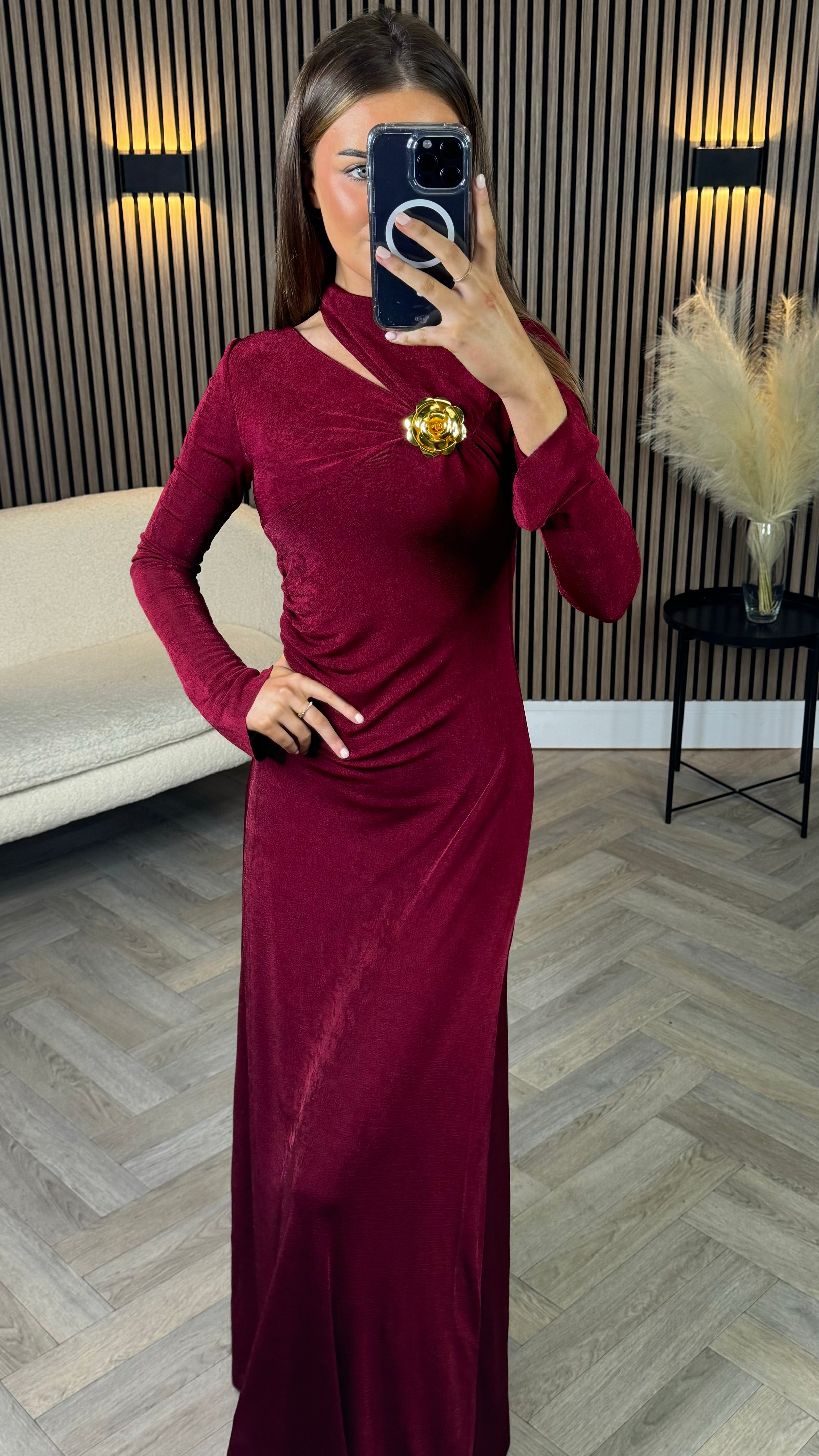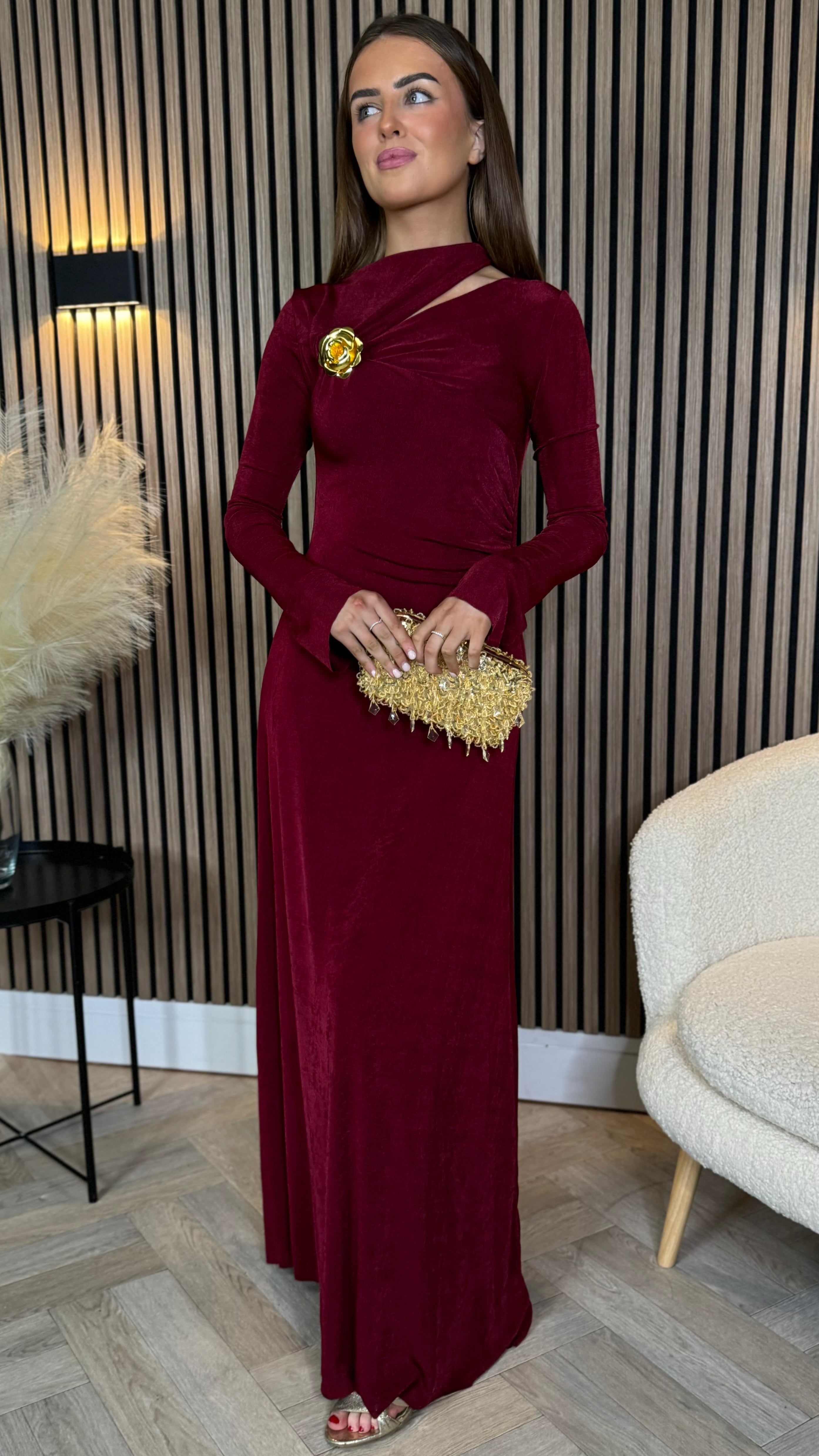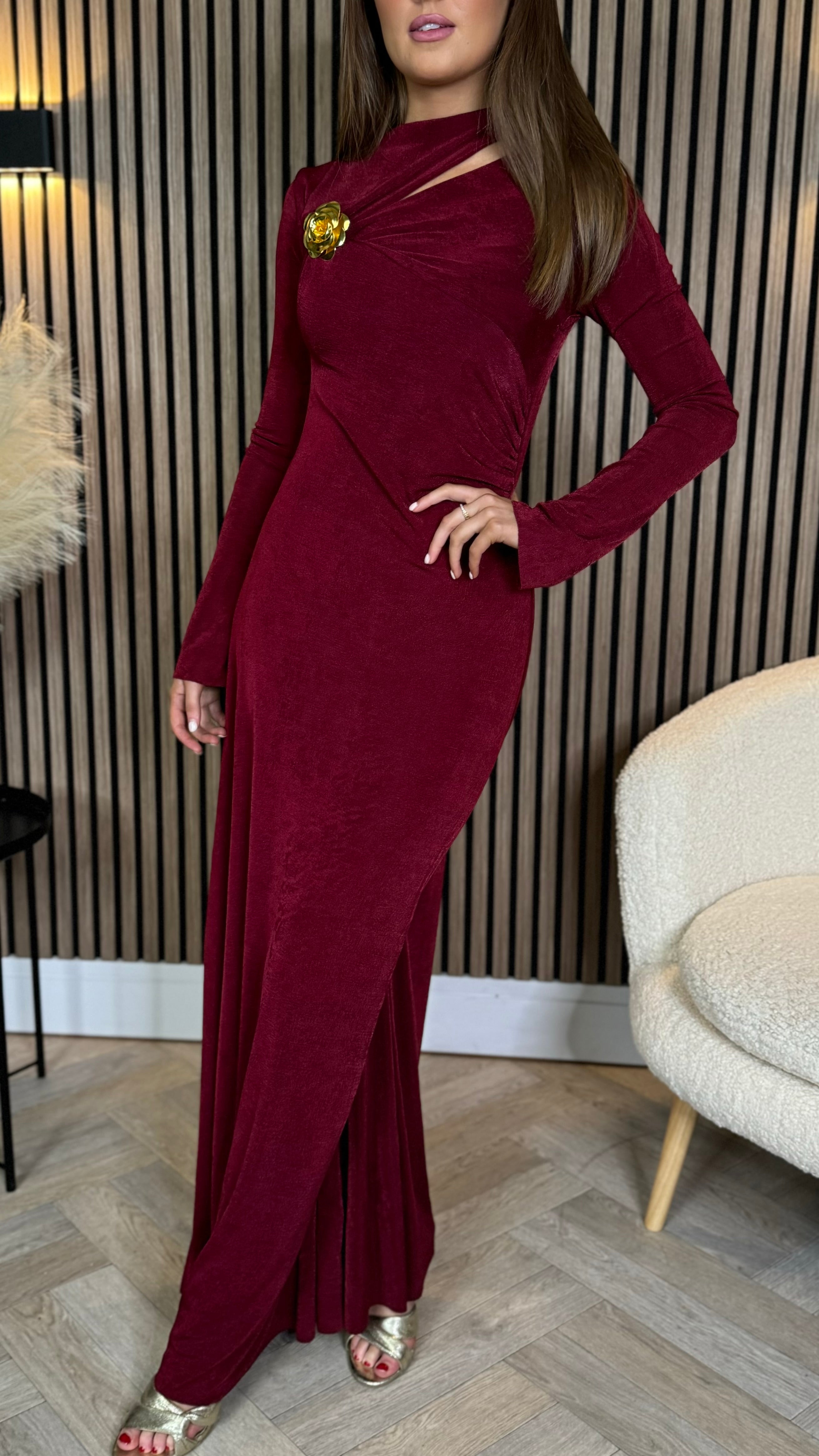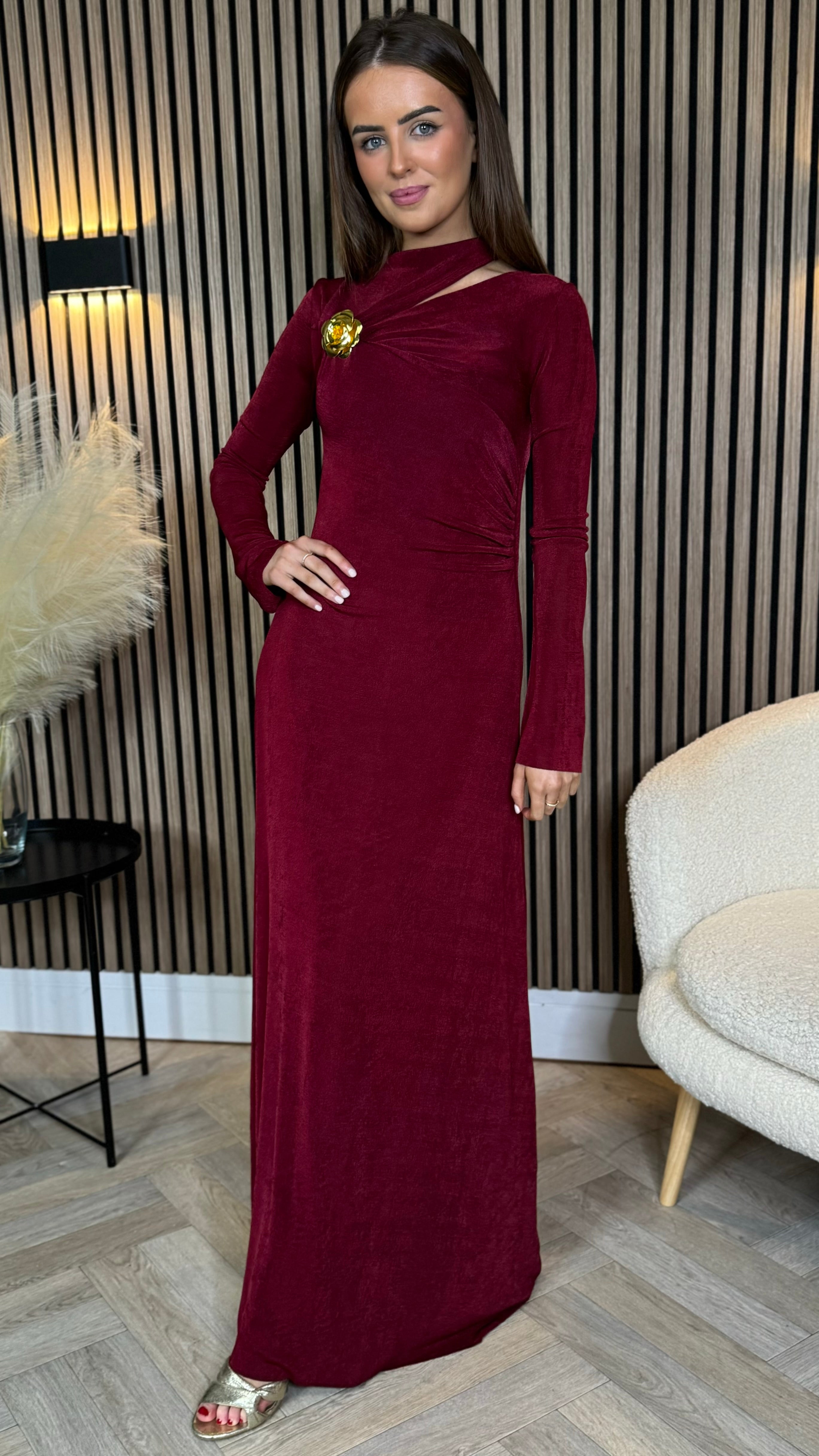 Ayda Burgundy Split Neckline Brooch Detail Maxi Dress