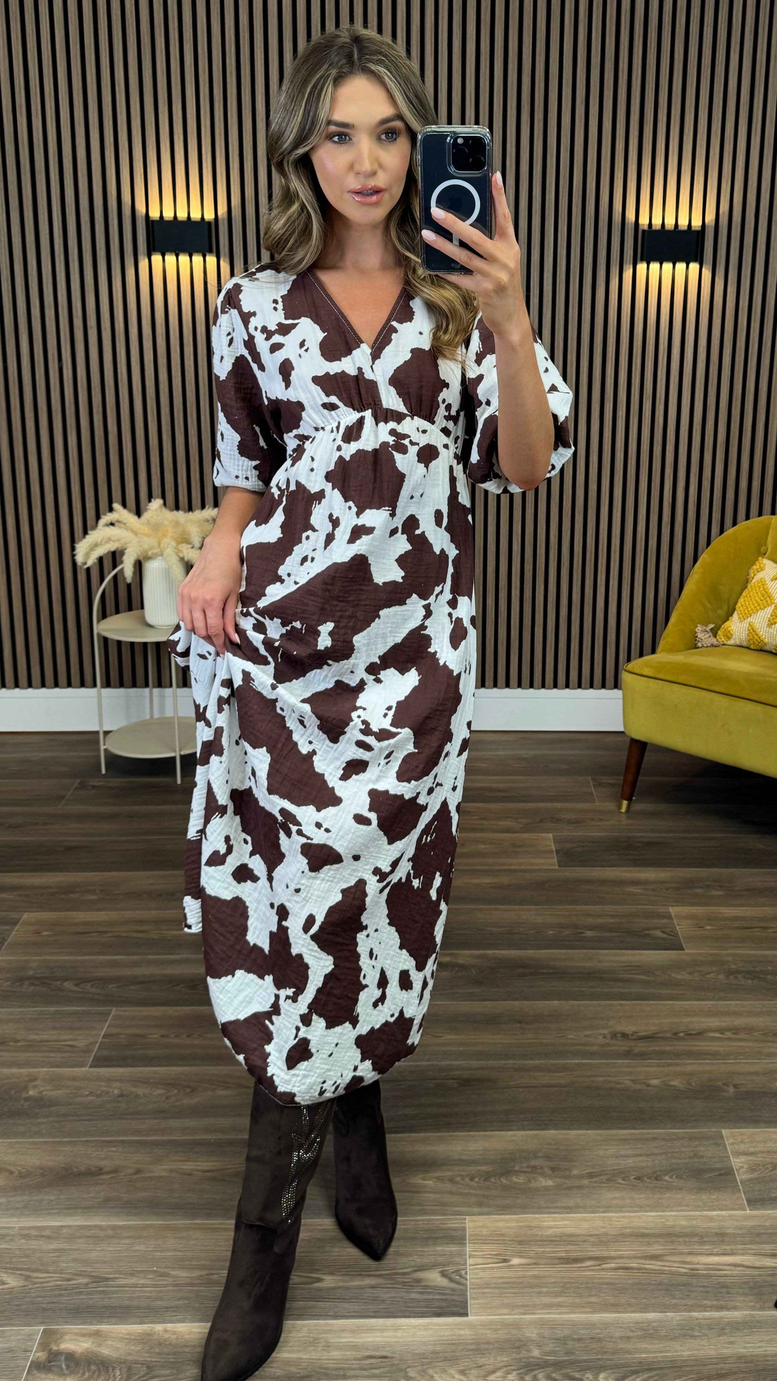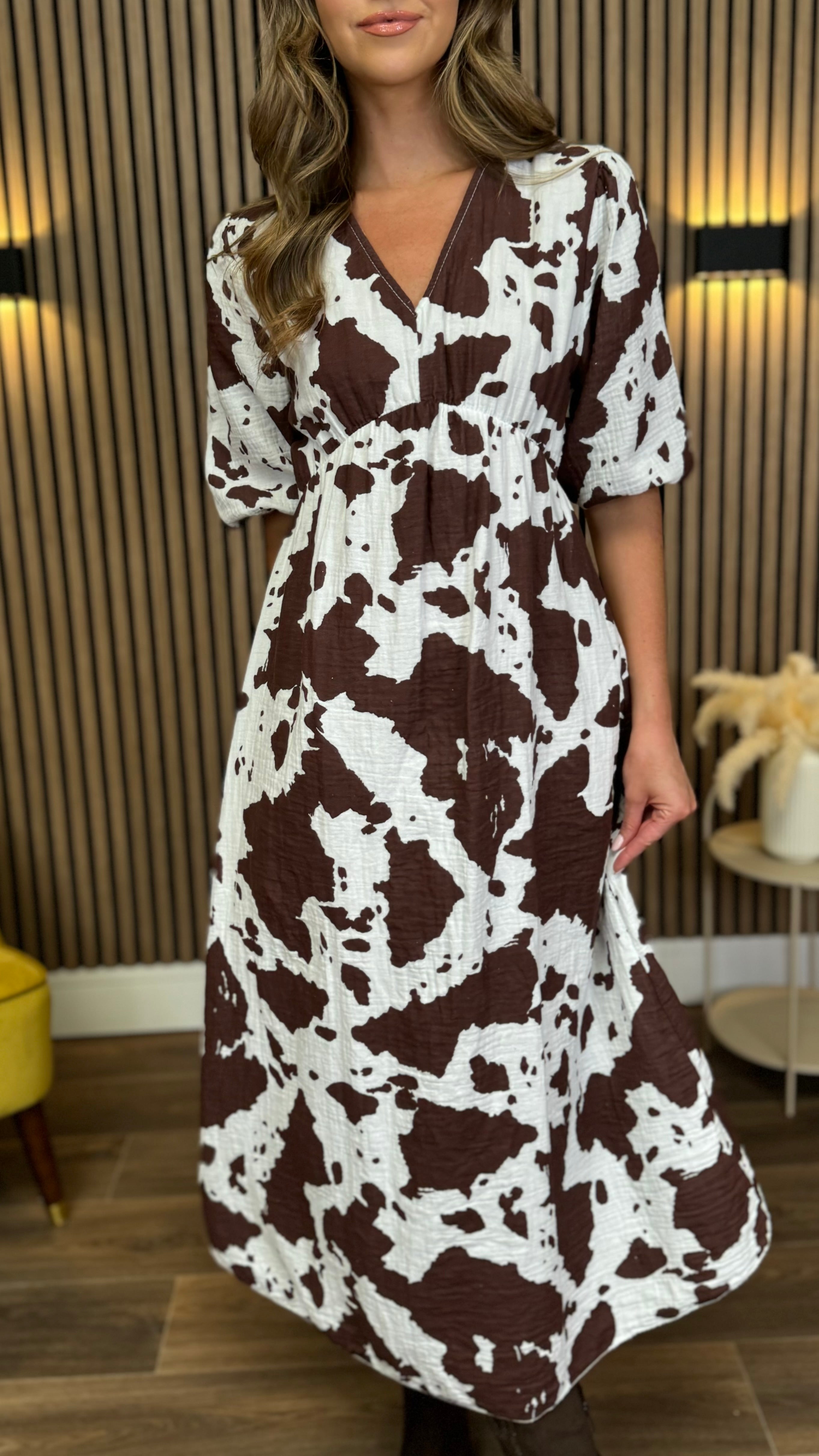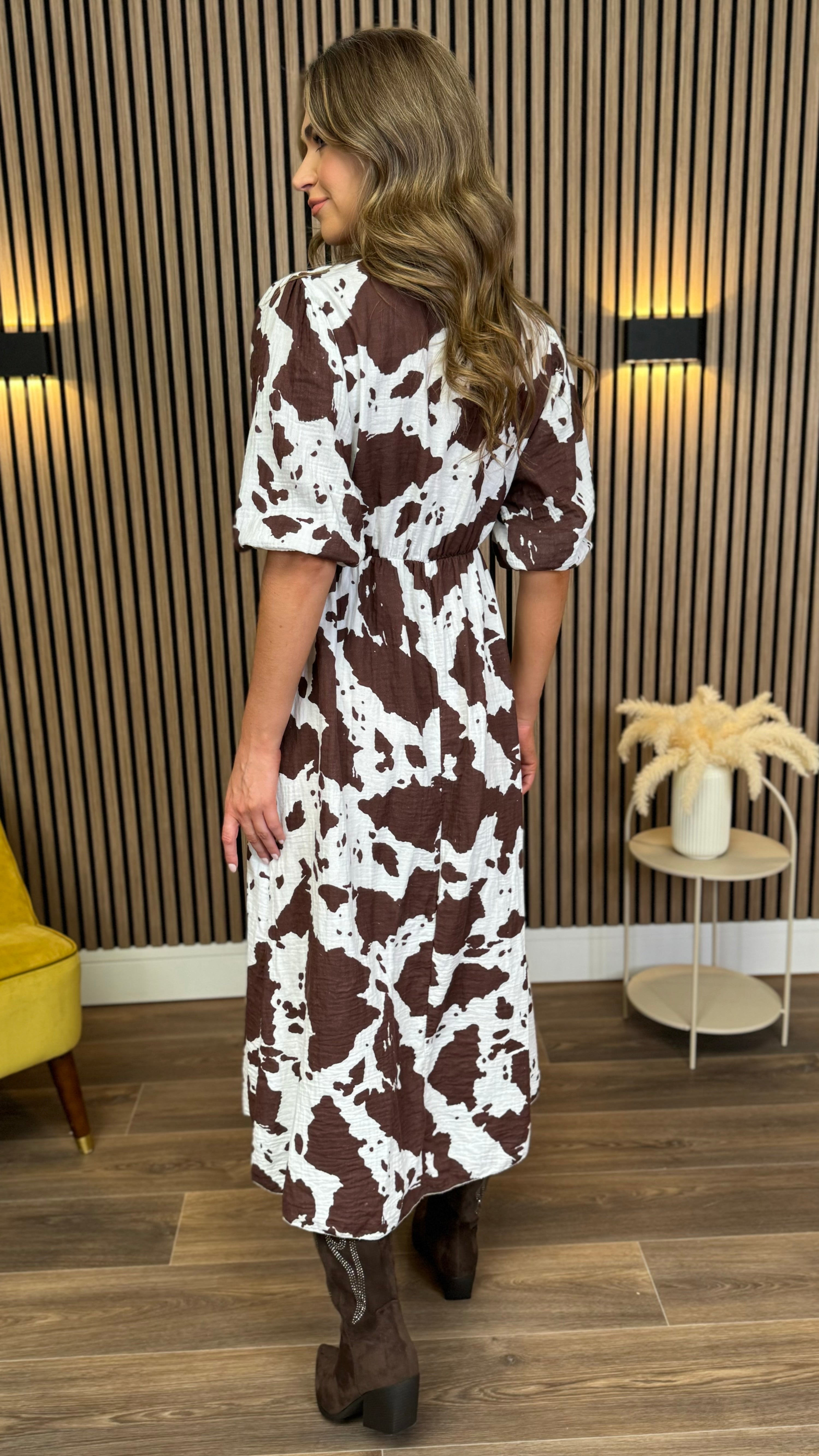 Beaux Brown & White Cow Print Cuffed Sleeve Waffle Detail Midi Dress