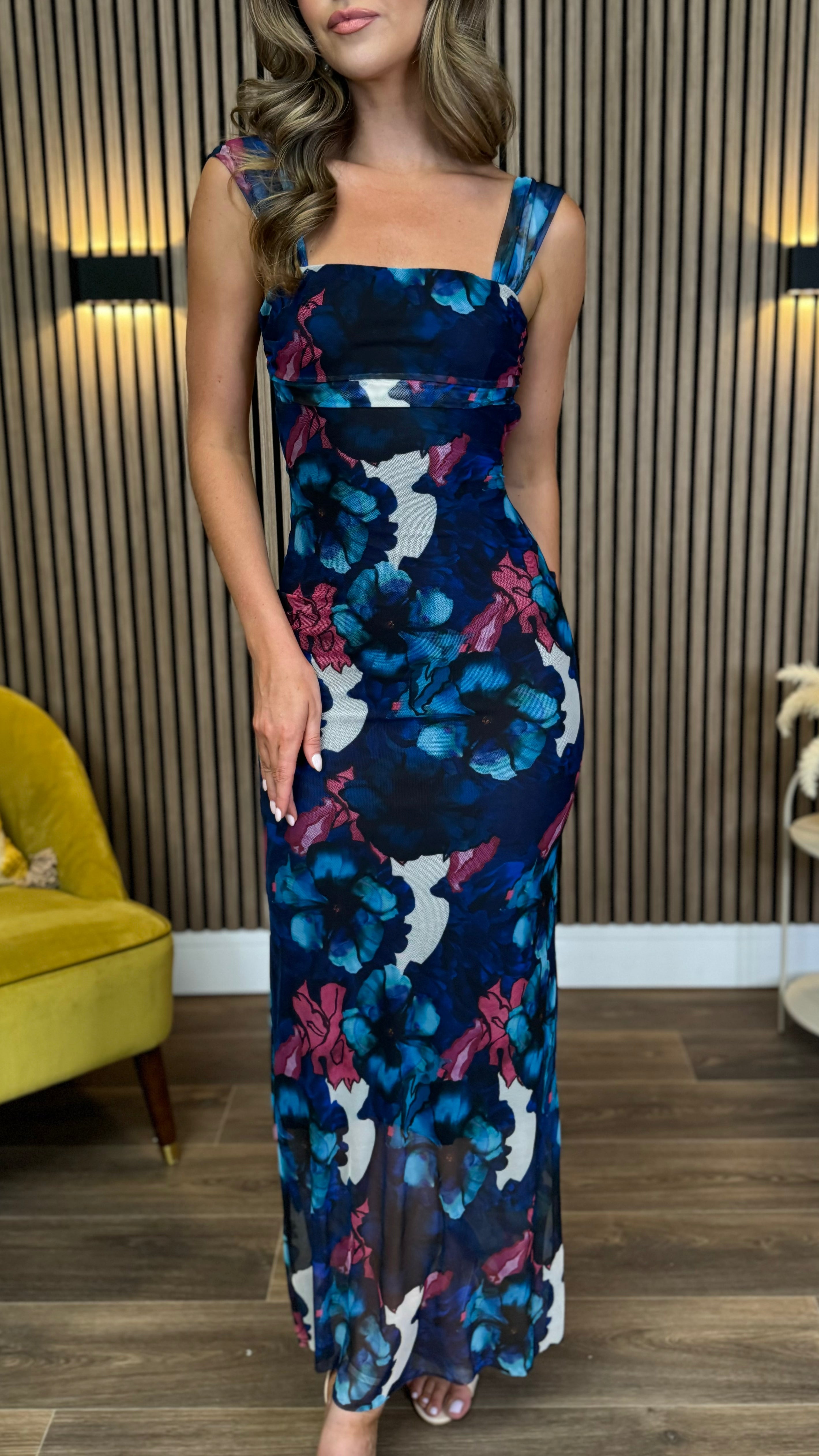 Bianca Blue Floral Backless Tie Detail Midi Dress