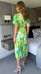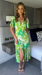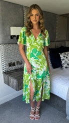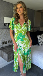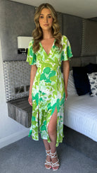 Elevate your style with the Bridgeen Green Leaf Angel Sleeve Split Leg Midi Dress. This statement piece features a plunging neckline, side splits, and a vibrant print. The elegant angel sleeve adds a touch of sophistication. Perfect for a lunch date or a night out, pair it with your favourite heels and handbag.