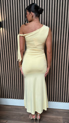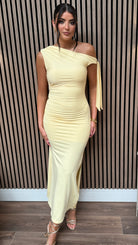 Get ready to turn heads in the Britney Yellow Tie Detail Ruched Midi Dress! This dress features a unique one shoulder design with a playful tie detail, perfect for a fun and flirty look. The ruched fabric adds texture and a figure-flattering effect, while the side split adds a touch of playful elegance. 😍👗 #StunInStyle
