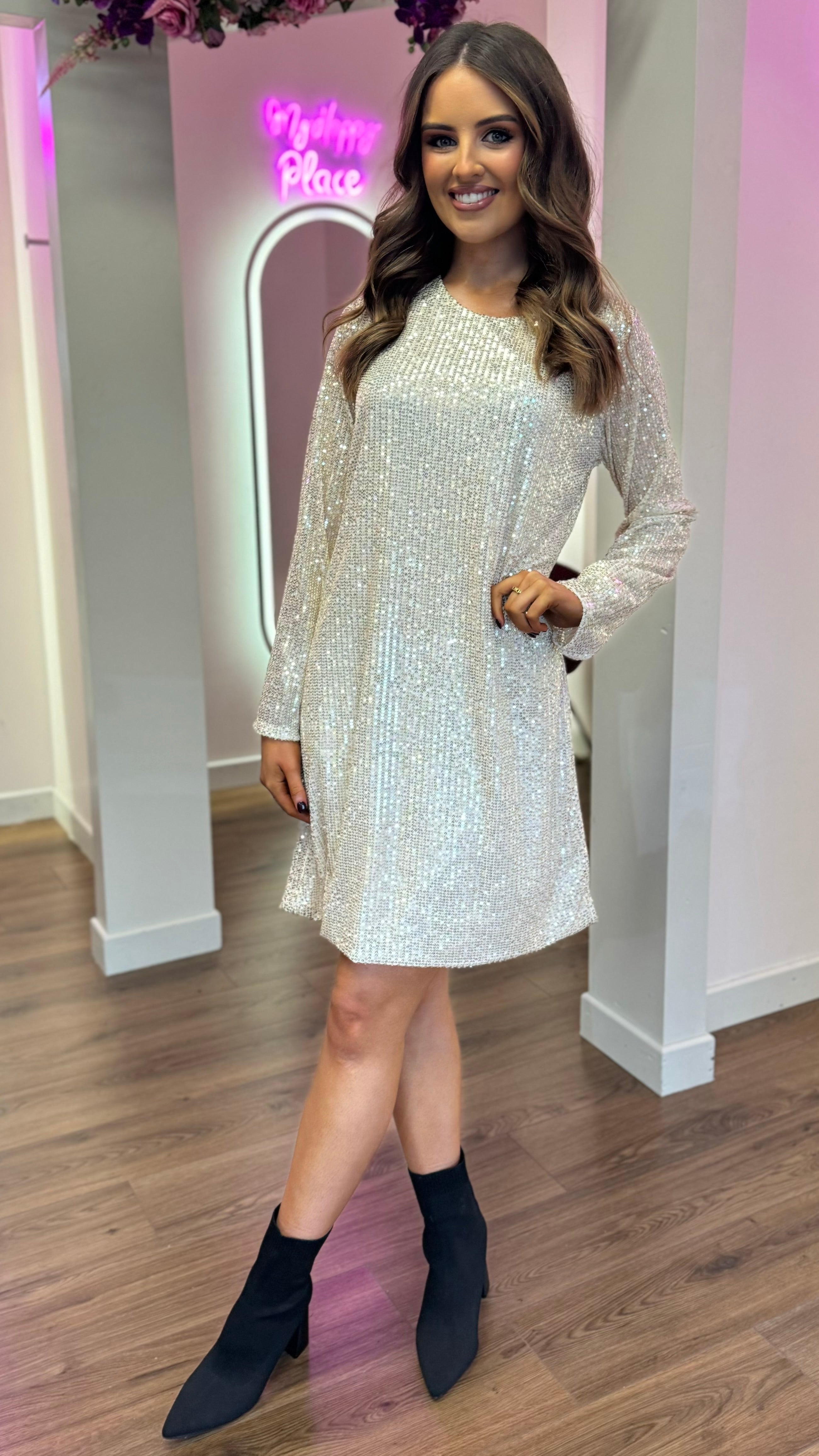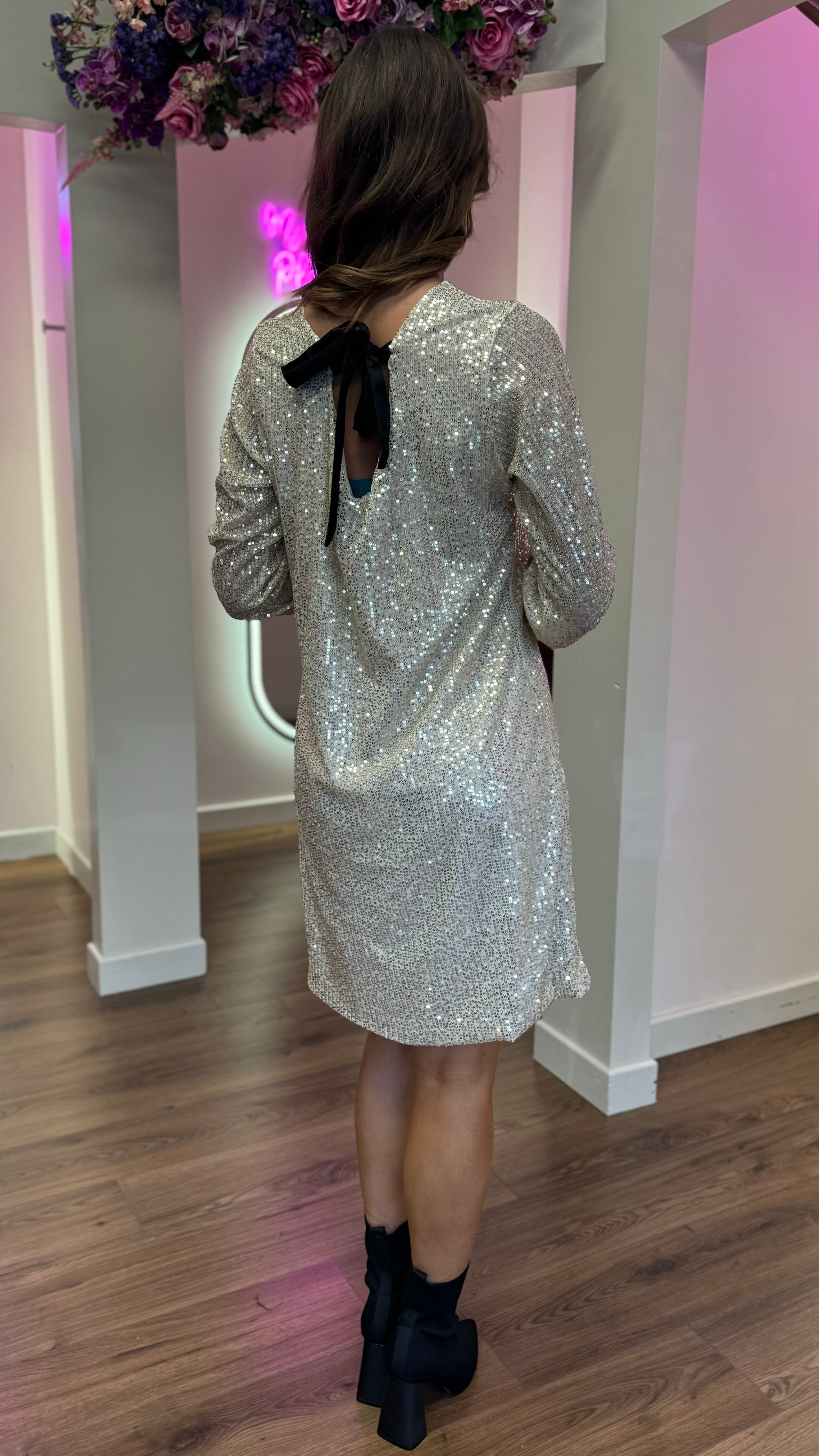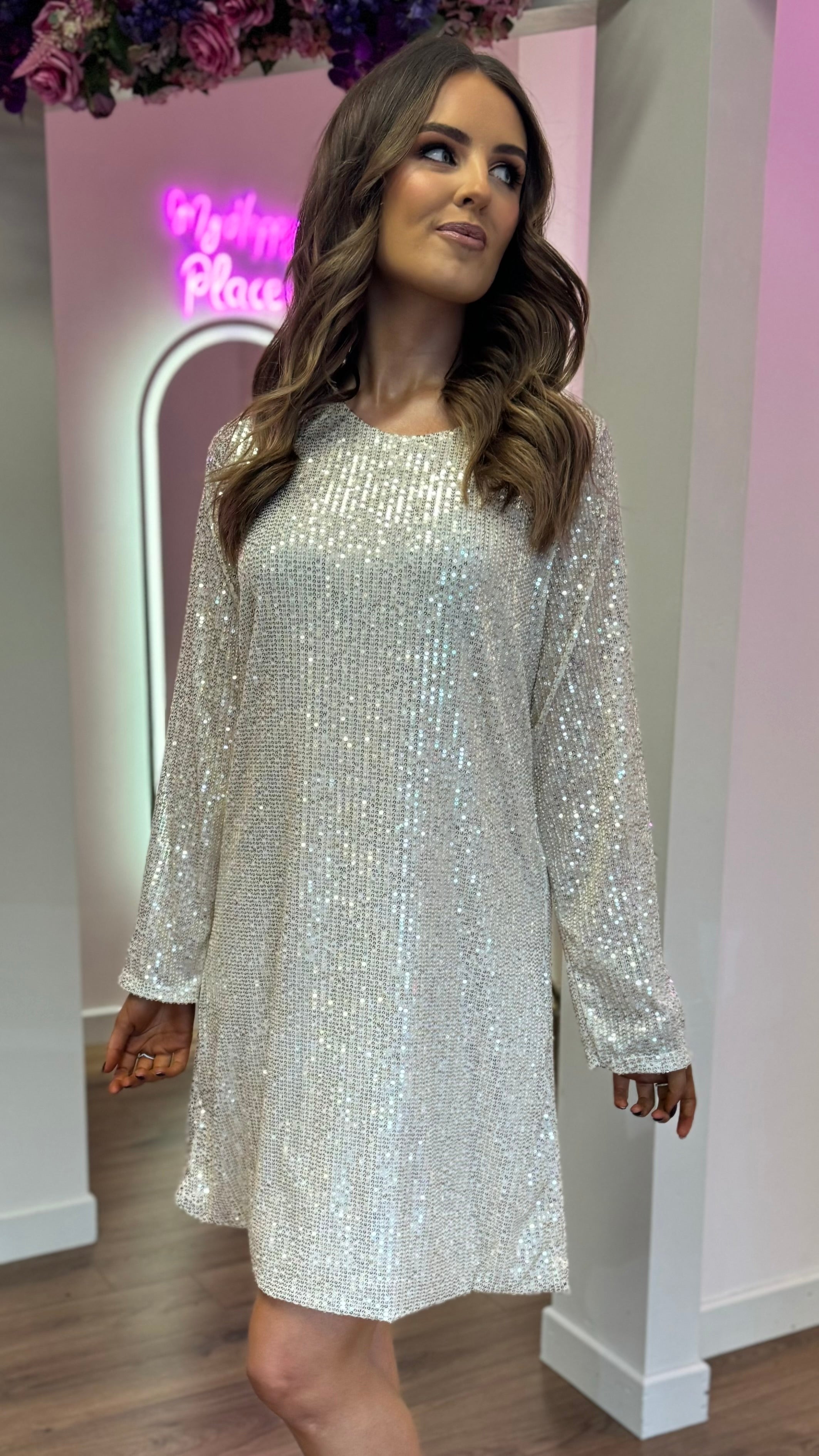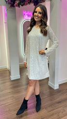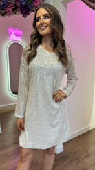 Shine and sparkle in the Brogan Champagne Sequin Mini Dress! This playful dress features a charming bow detail at the back, adding a unique touch to your look. With its slightly wide cuff and round neckline, this dress is perfect for any occasion. Get ready to turn heads and have some fun in this dazzling dress!