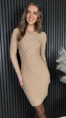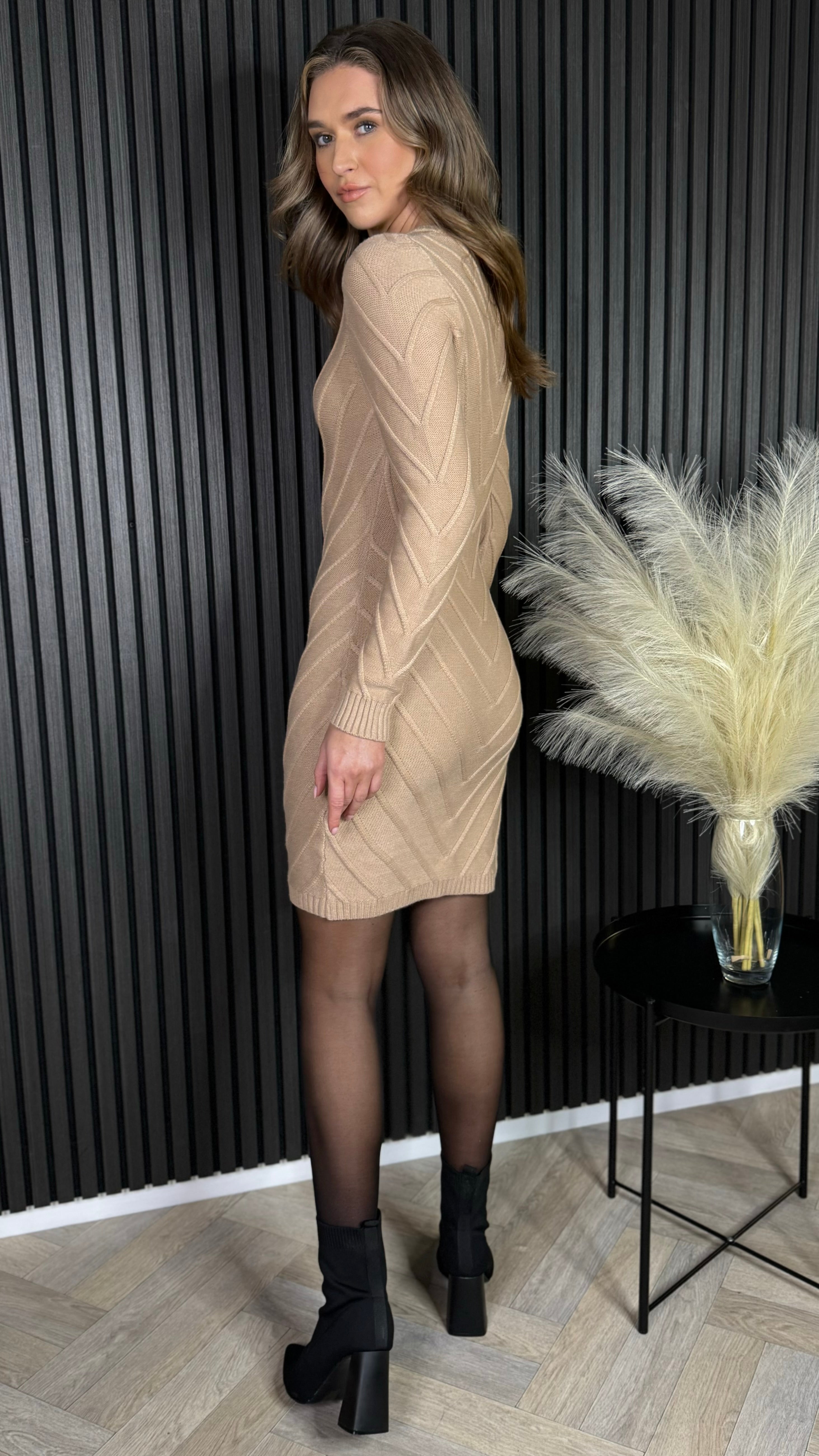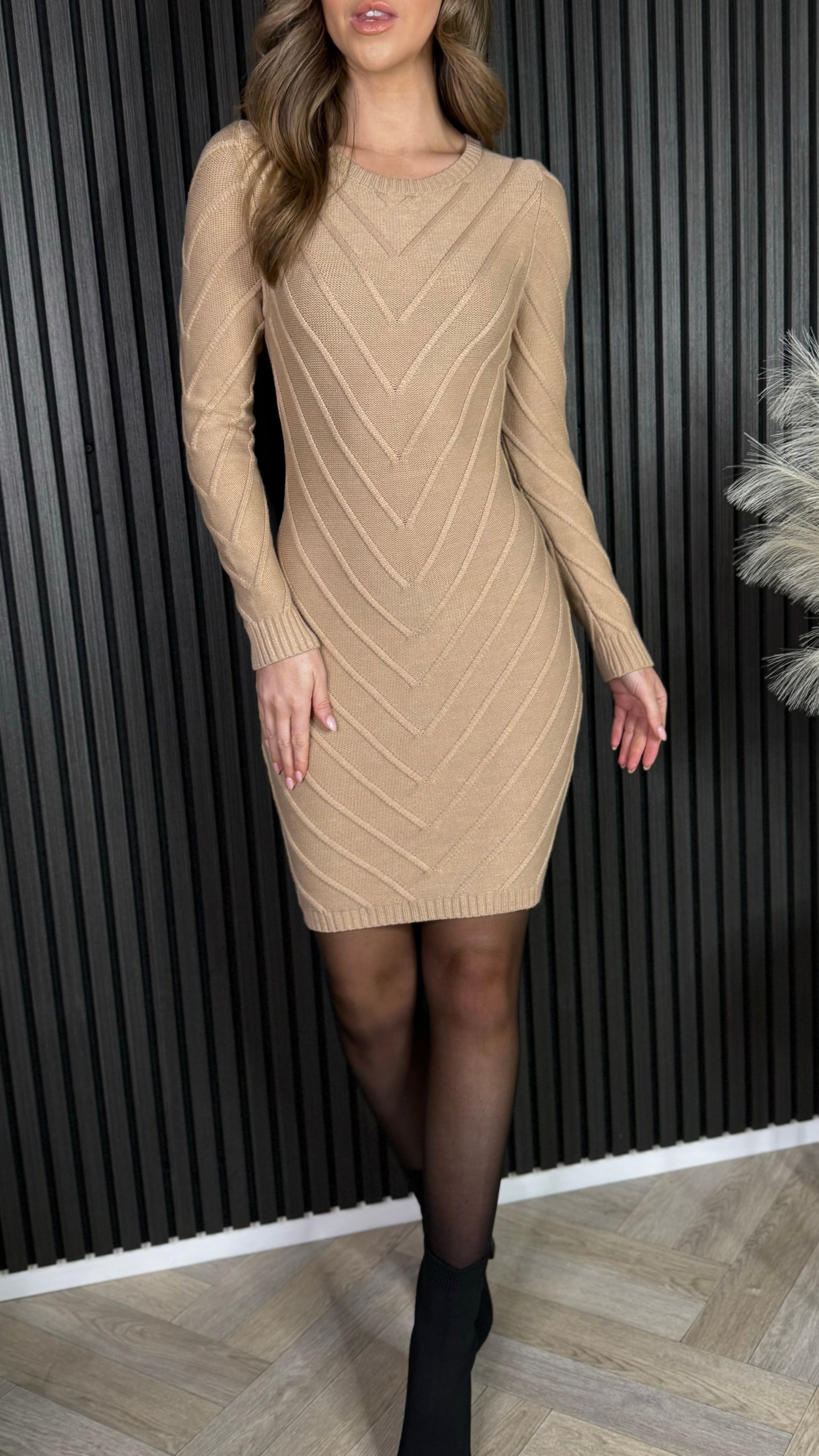 Snuggle up in style with our Byrne Camel Ribbed Detail Jumper Dress! This dress features long sleeves and a cozy round neckline, perfect for keeping you warm and stylish all day long. Made with ribbed detailing, this dress adds dimension and texture to your outfit. Perfect for any occasion, this dress is a must-have for your wardrobe!