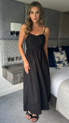 Elevate your wardrobe with the Cassidy Black Cami Strap Midi Dress, featuring elegant ruched detailing and a delicate tie-back design. This sophisticated piece offers a flattering silhouette that effortlessly transitions from day to night, combining timeless style with modern charm. Perfect for special occasions or refined everyday wear.