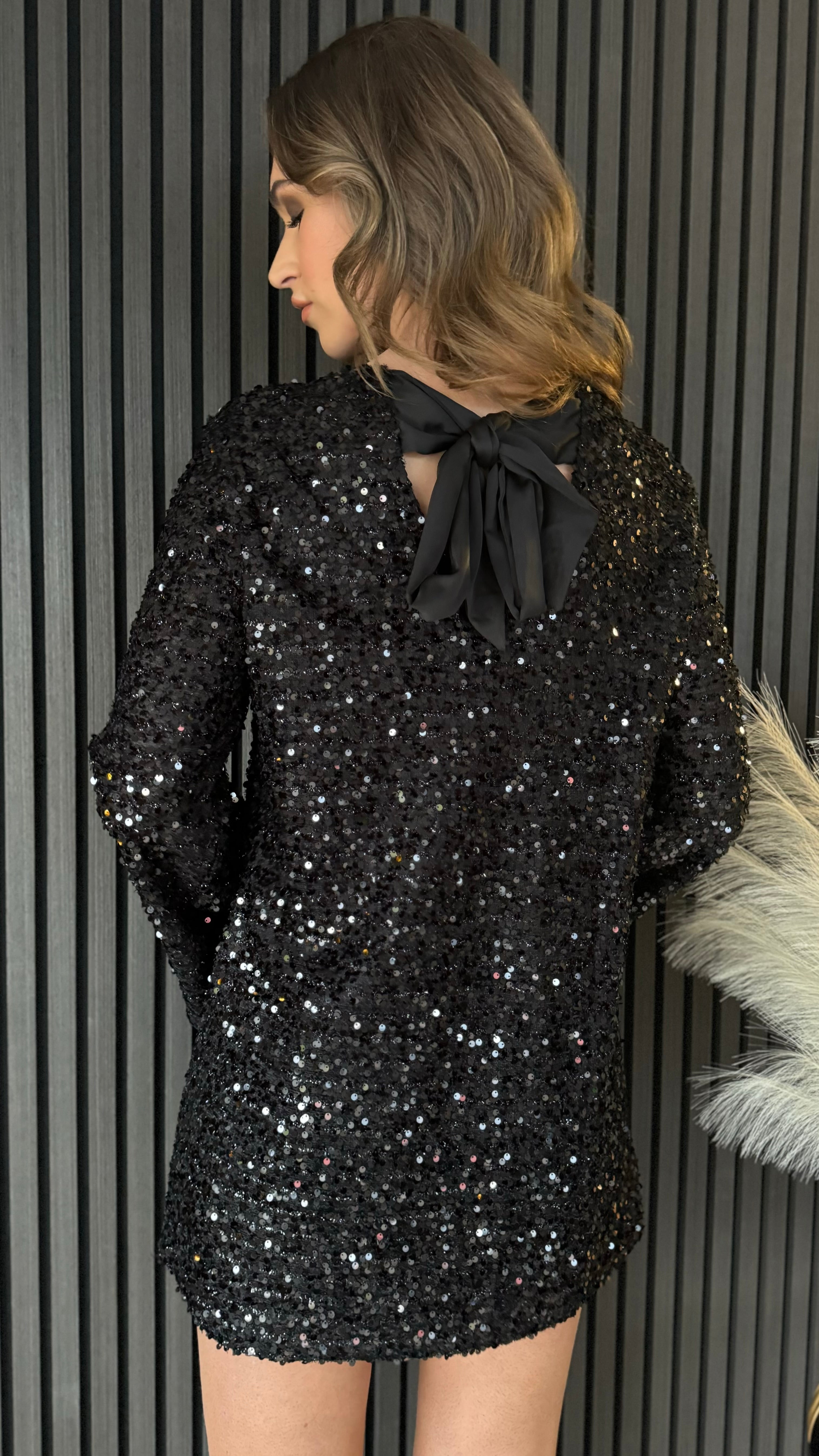 Cerys Black Sequin Back Bow Detail Mini Dress