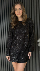 Get ready to turn heads and steal the show in the Cerys Black Sequin Back Bow Detail Mini Dress. With its eye-catching back bow detail, wide bell sleeves, and chic round neckline, this dress is perfect for any special occasion. The sequin embellishments add a touch of fun and sparkle to your look. Be the life of the party in this unique and stylish dress!