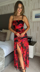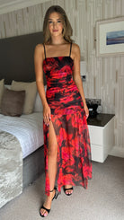 Cheryl Black & Red Printed Cami Strap Ruched Detail Cupped Midaxi Dress