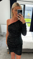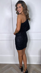 Make a statement in this dazzling Cheyene Black dress - featuring faux-wrap ruching, sequin sparkles, and a one-sleeve design for the ultimate mix of glam-meets-sexy! Ready for a night out? This dress is your new BFF. 💃