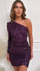 Make a statement in this dazzling Cheyene Purple dress - featuring faux-wrap ruching, sequin sparkles, and a one-sleeve design for the ultimate mix of glam-meets-sexy! Ready for a night out? This dress is your new BFF. 💃