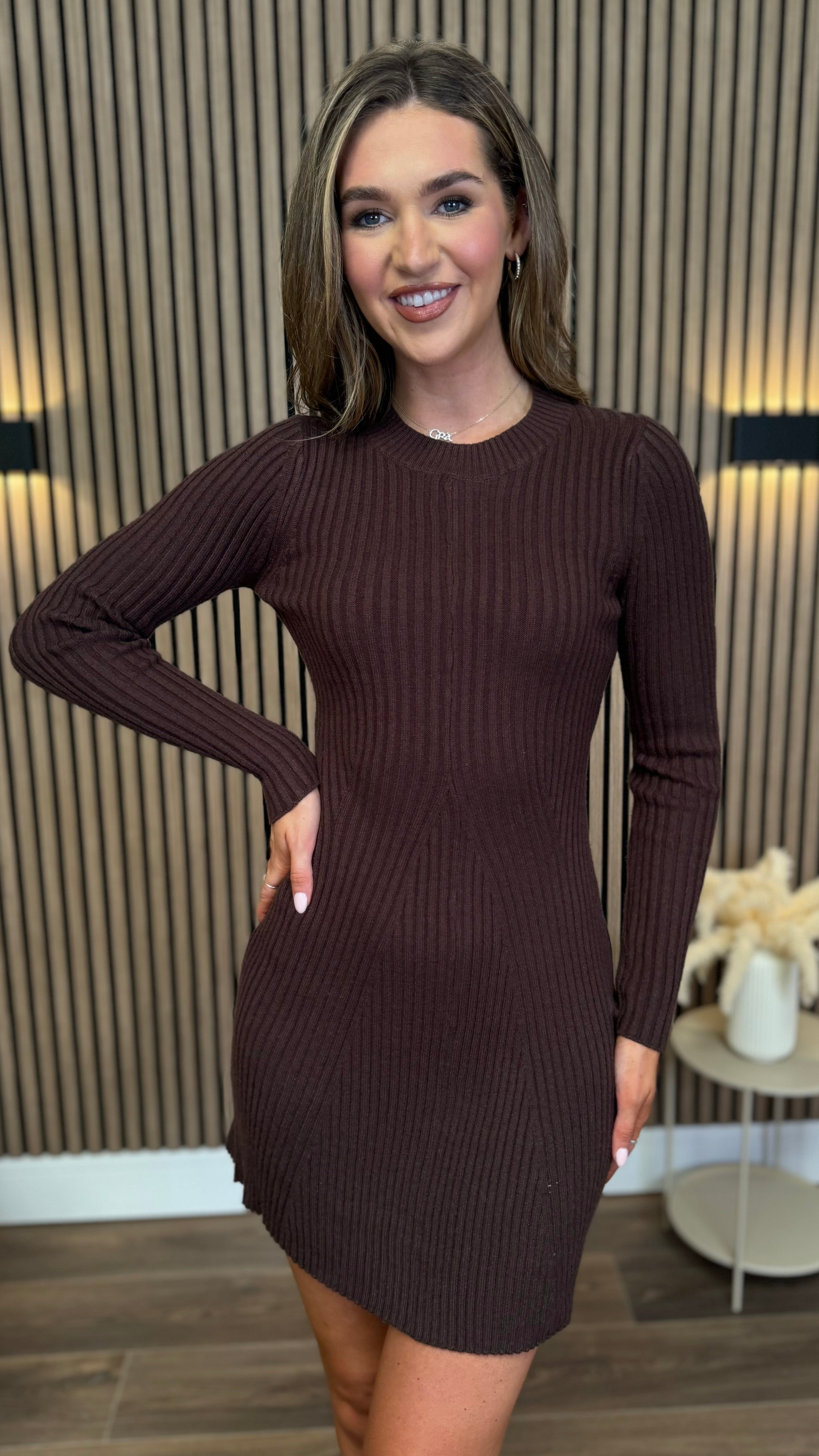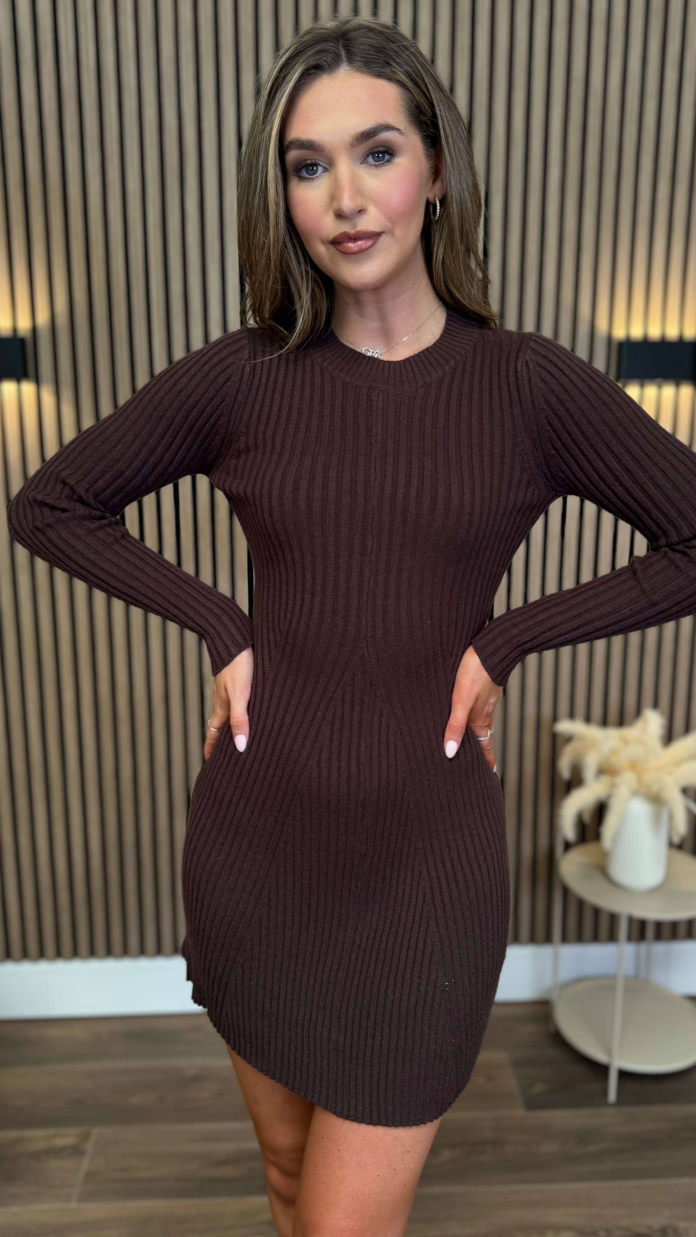 Chicago Brown Ribbed Long Sleeve Mini Dress