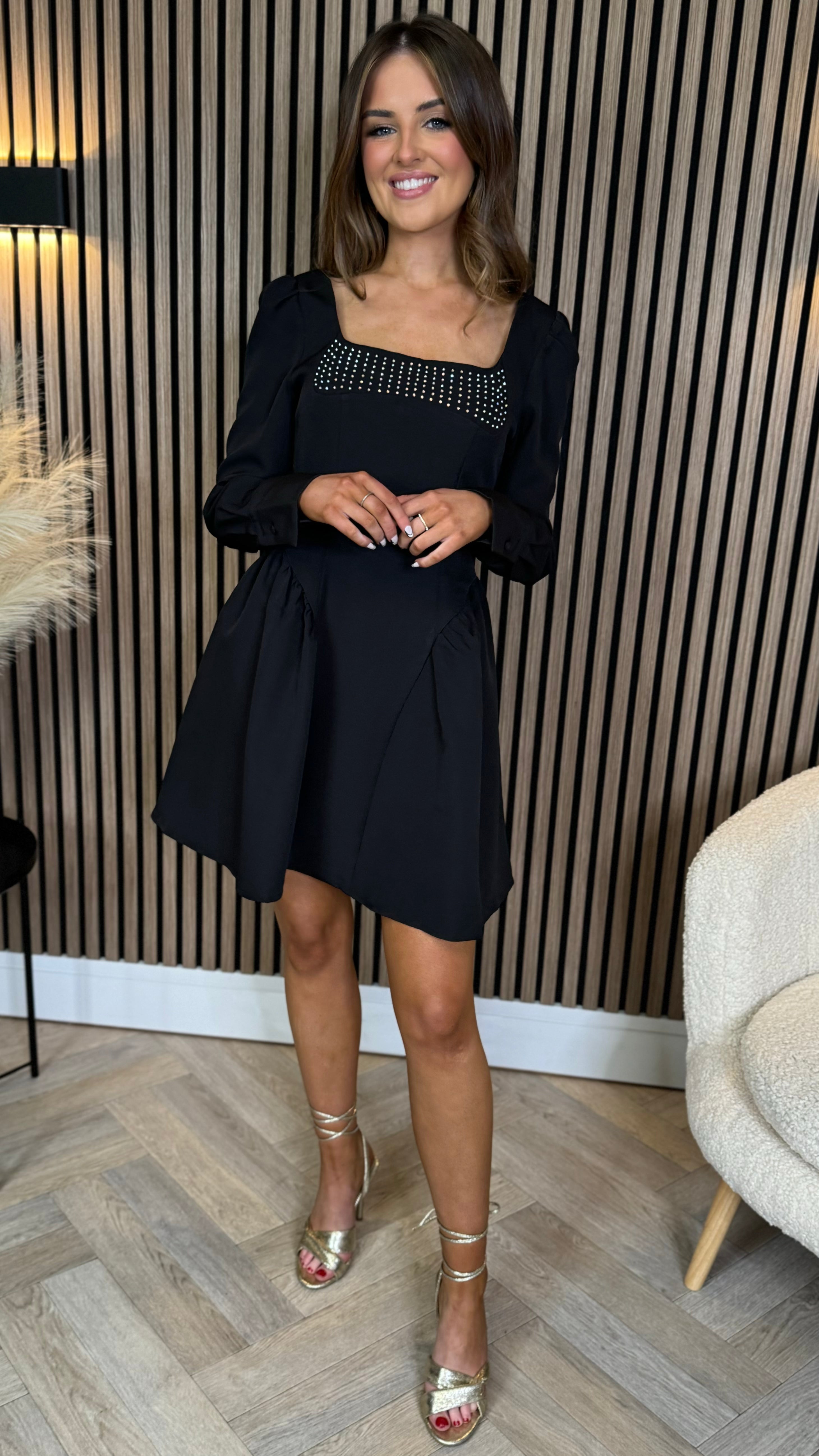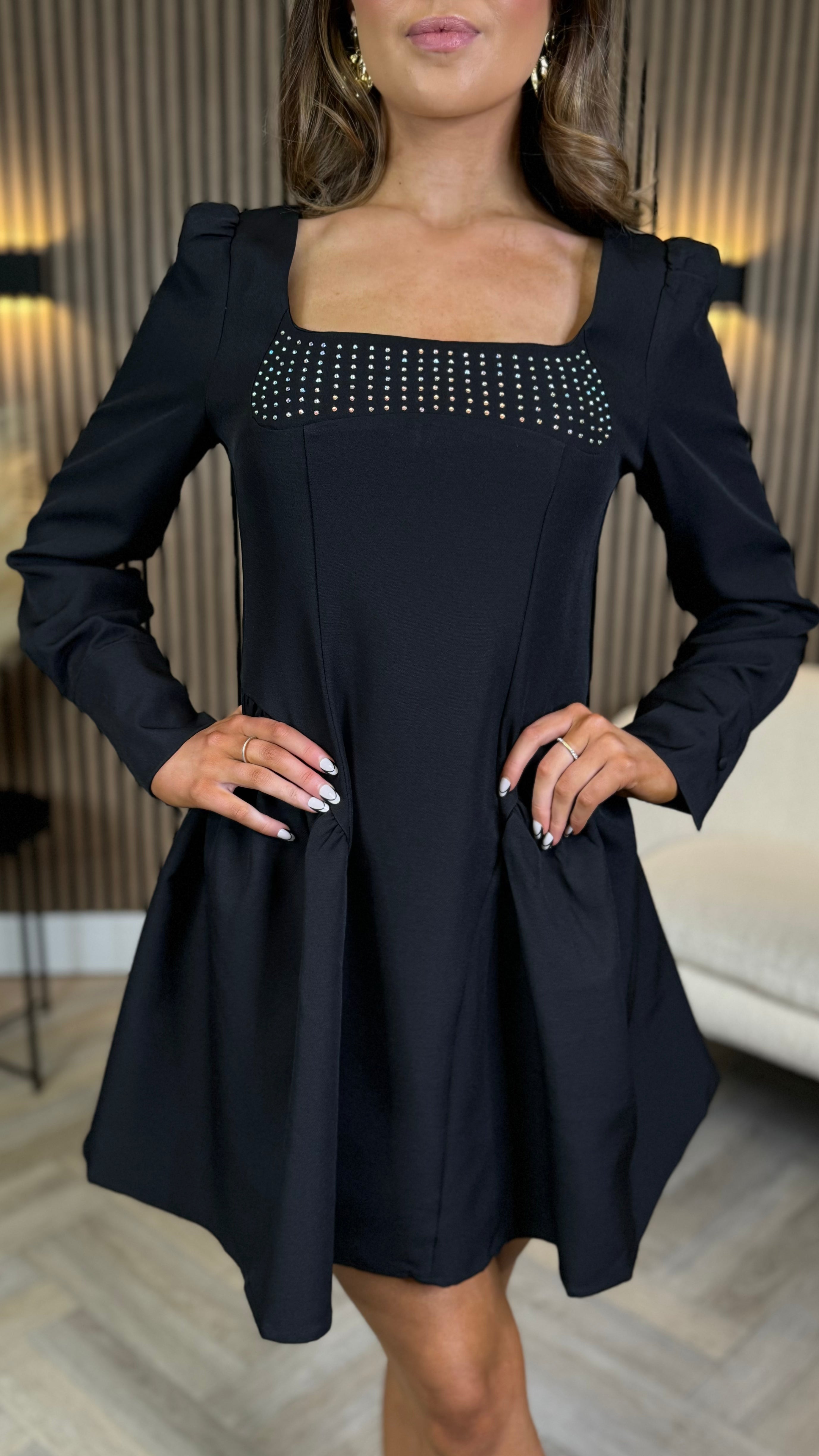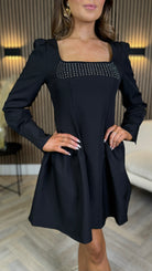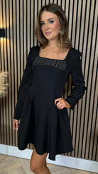 Clora Black Square Neck Embellished Detail Mini Skater Dress