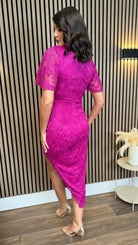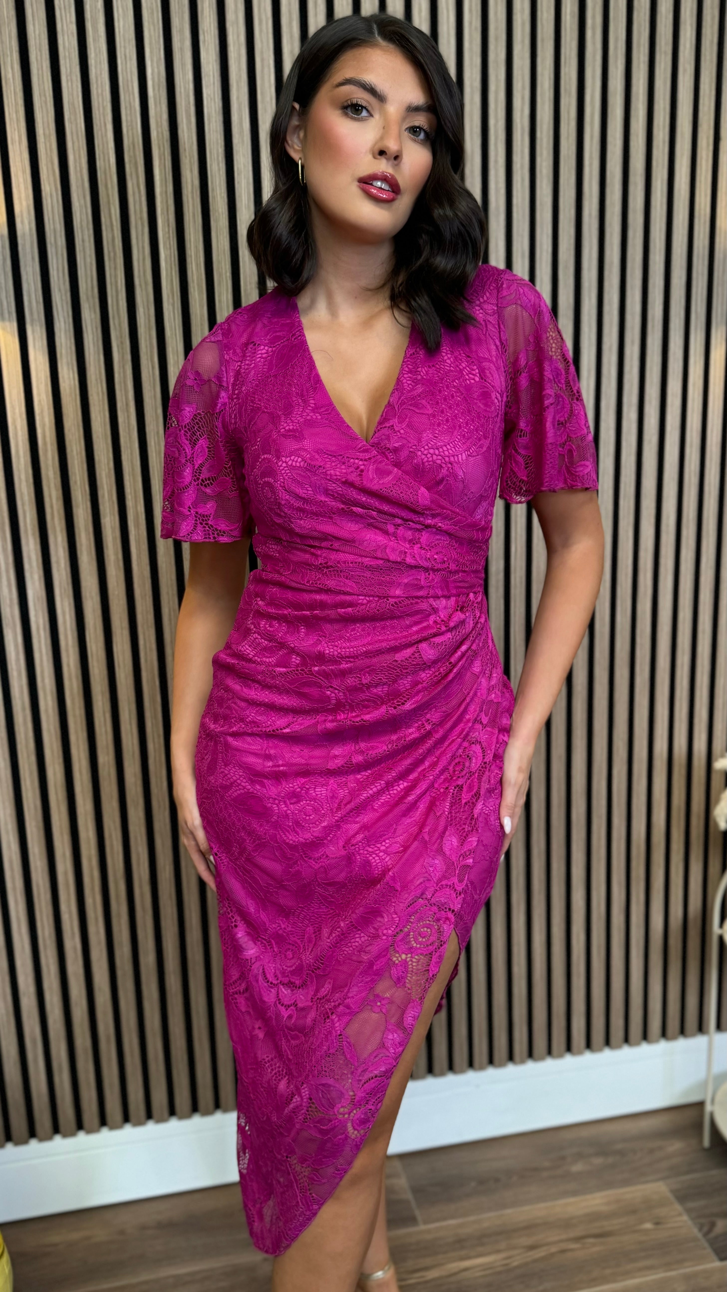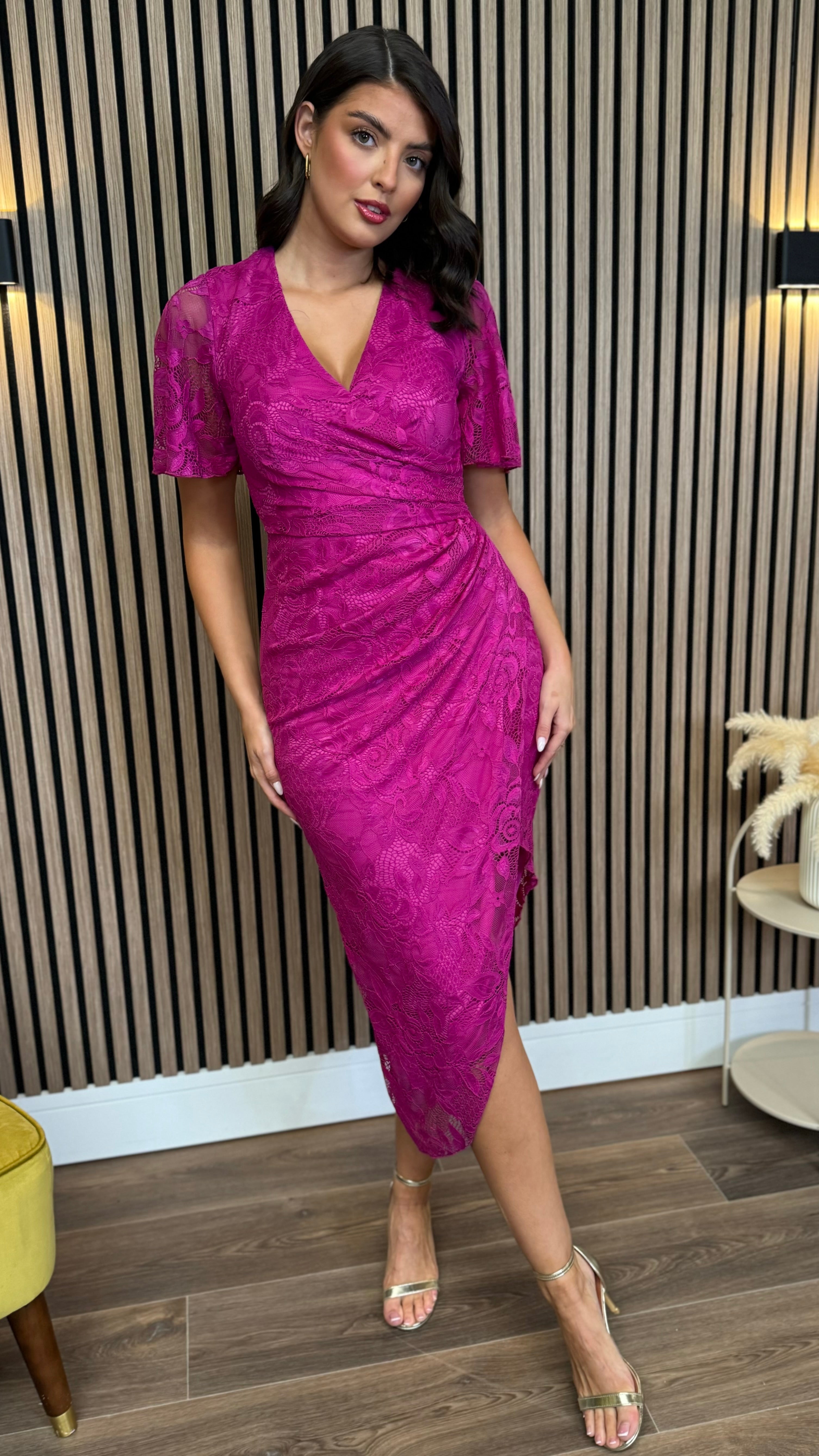 Collins Dark Fuchsia Floral Lace Detail Ruched Midi Dress