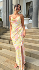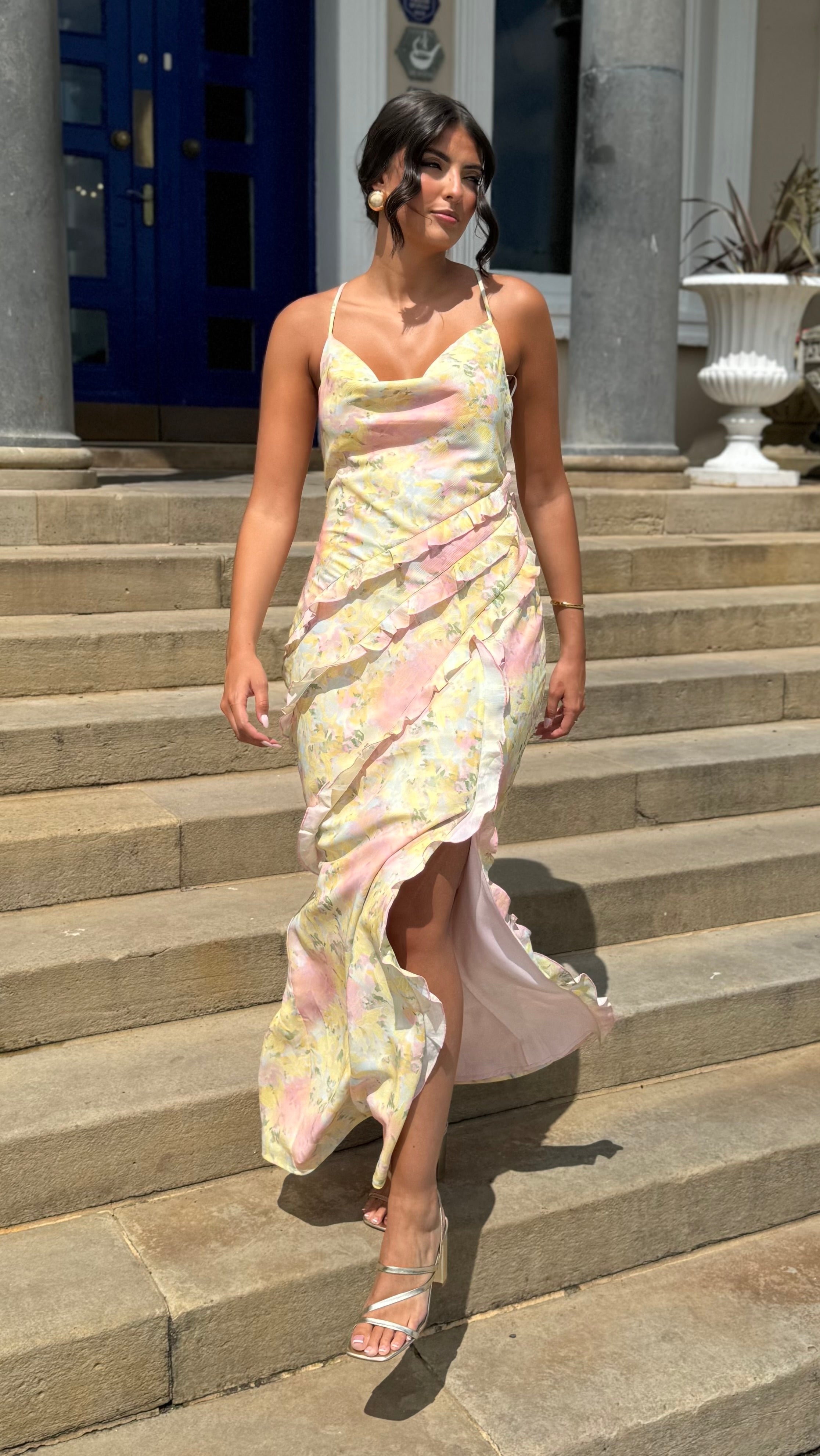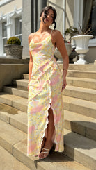 Constance Yellow Floral Asymmetrical Ruffle Maxi Dress