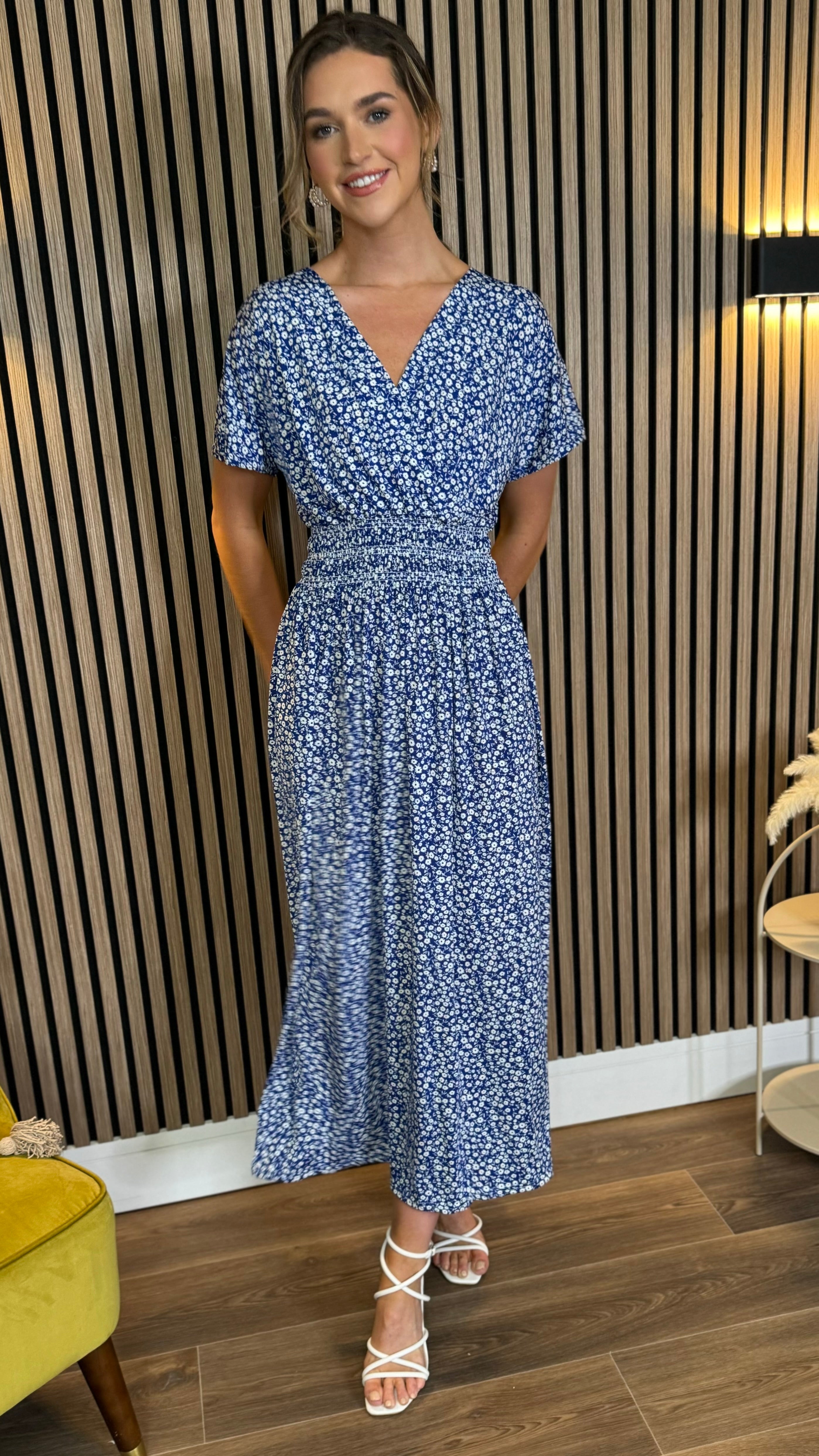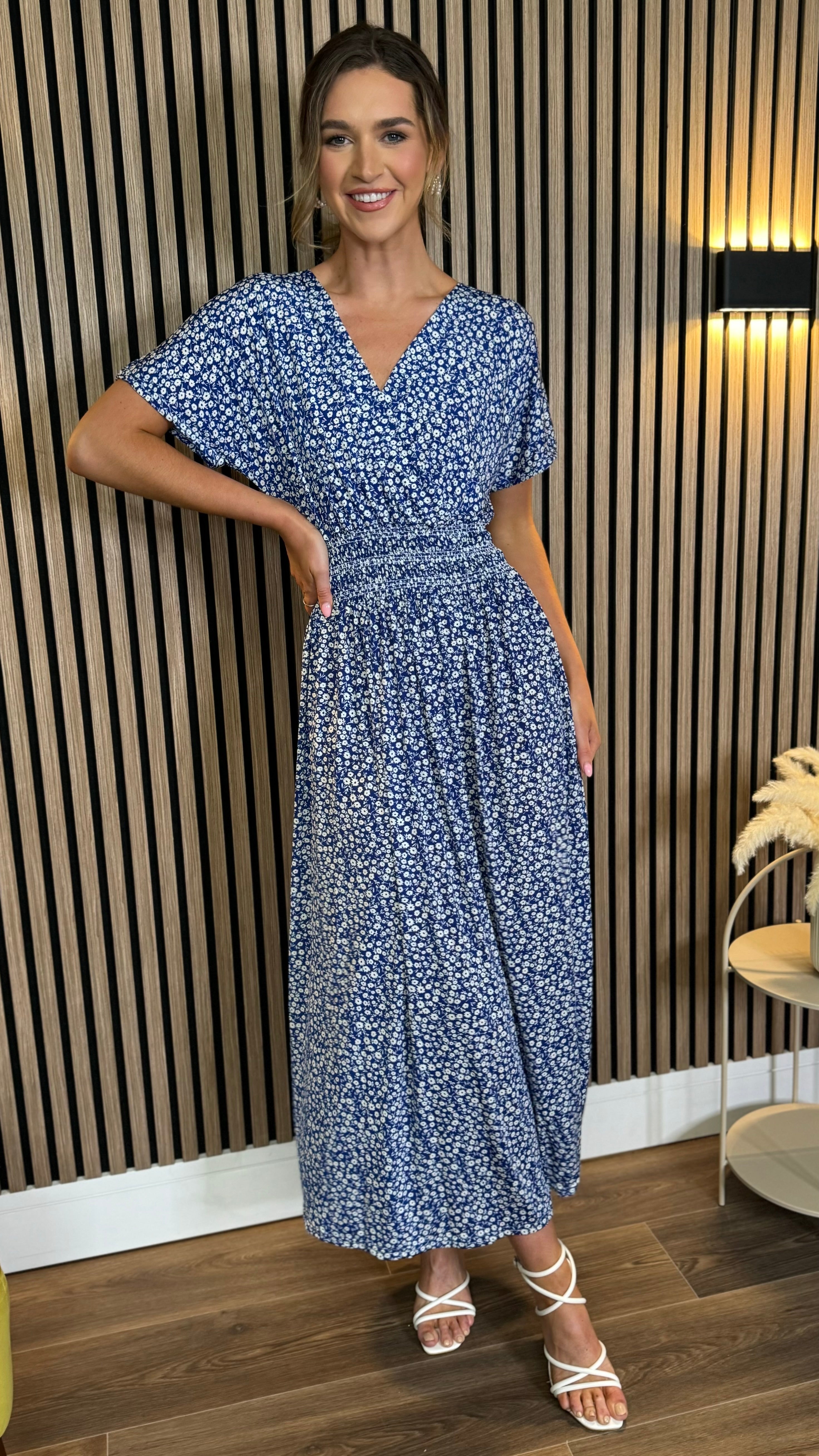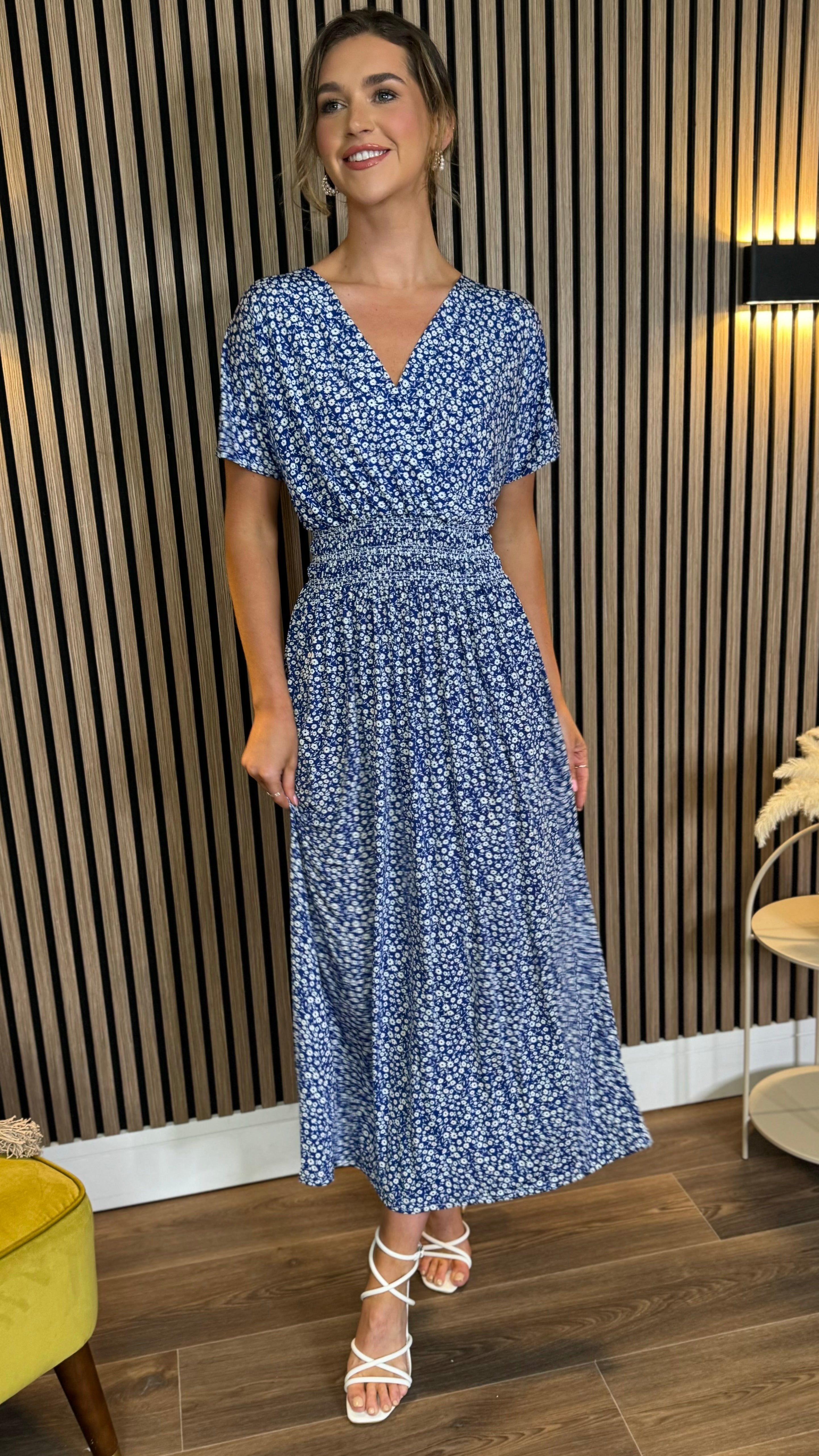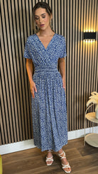 Elowyn Blue & White Floral Wrap Top Cap Sleeve Midi Dress