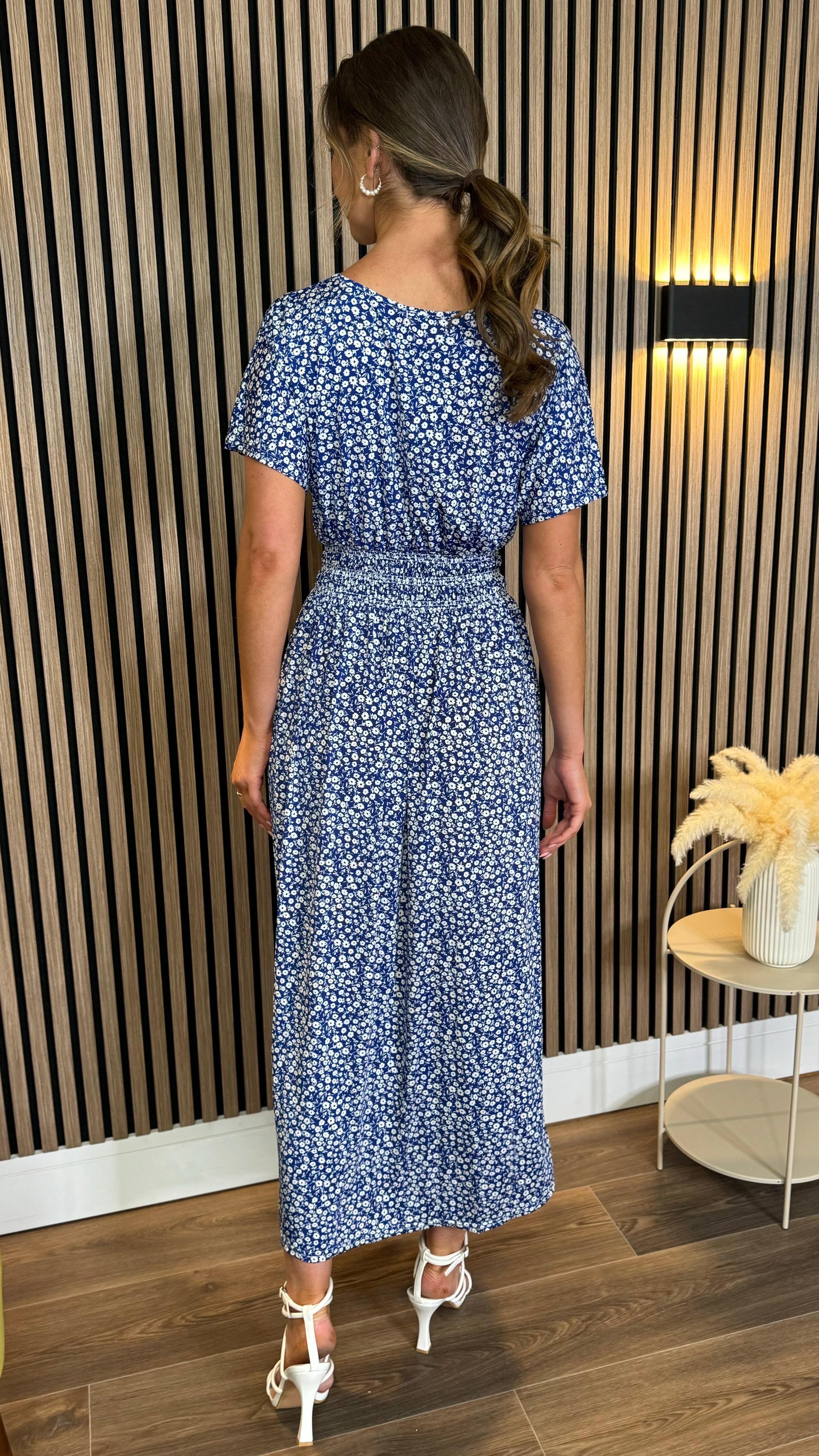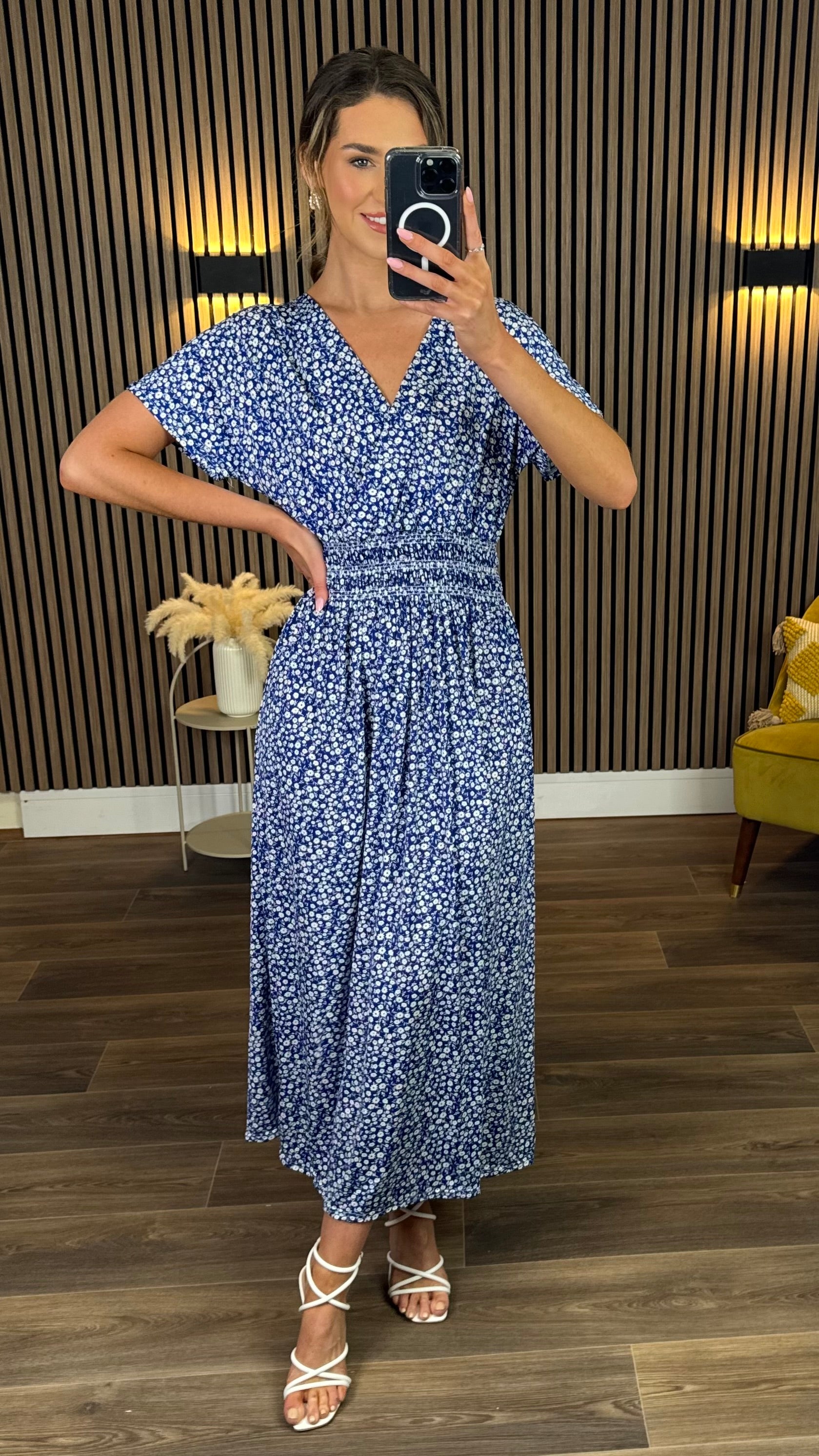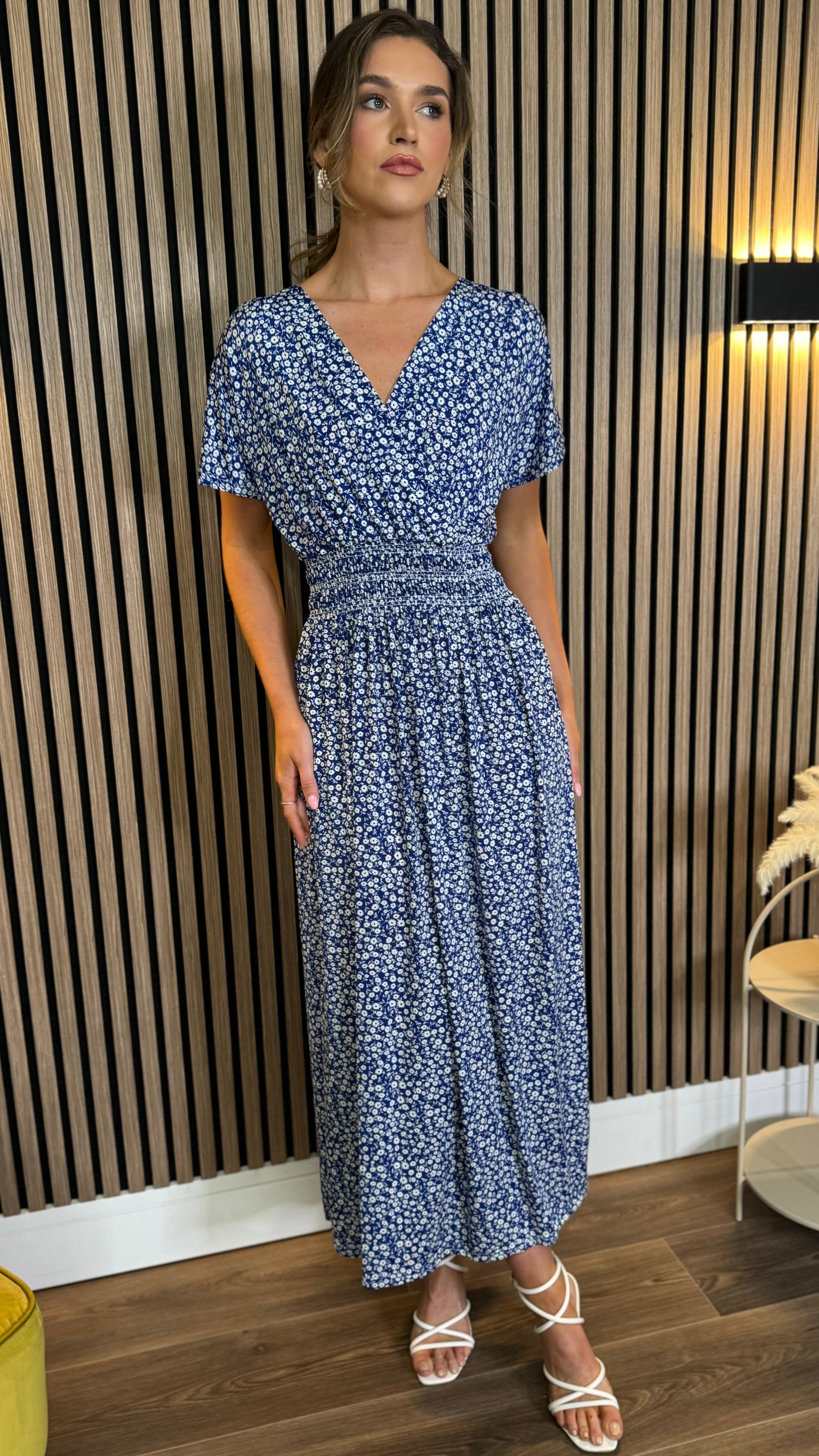 Elowyn Blue & White Floral Wrap Top Cap Sleeve Midi Dress