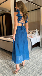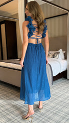 The Elsa Teal Ruffle Details Backless Midi Dress exudes timeless elegance with its flowing silhouette and delicate ruffle accents. Its backless design adds a touch of allure, while the rich navy colour ensures a sophisticated look. Perfect for formal events or evening occasions, this midi dress combines graceful style with refined charm.