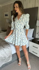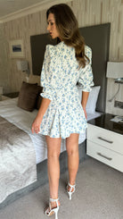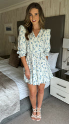 Emma White & Blue Ditsy Floral Print Skater Mini Dress