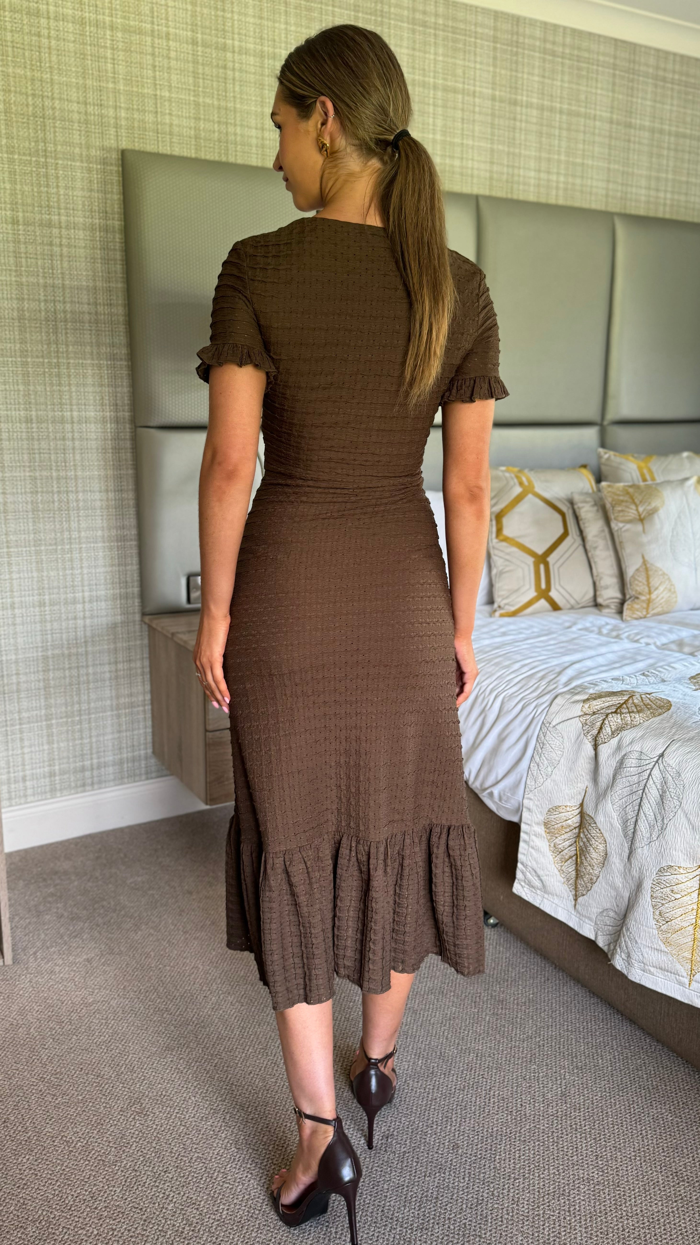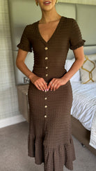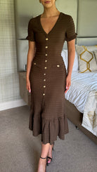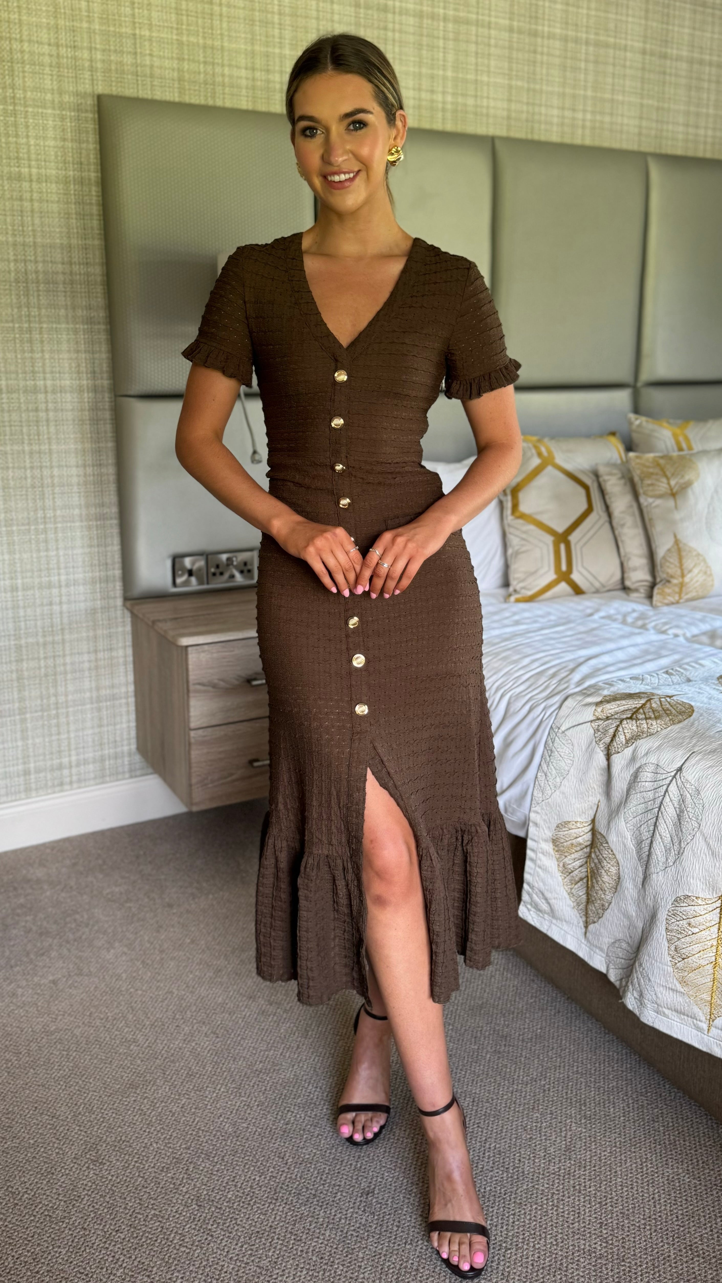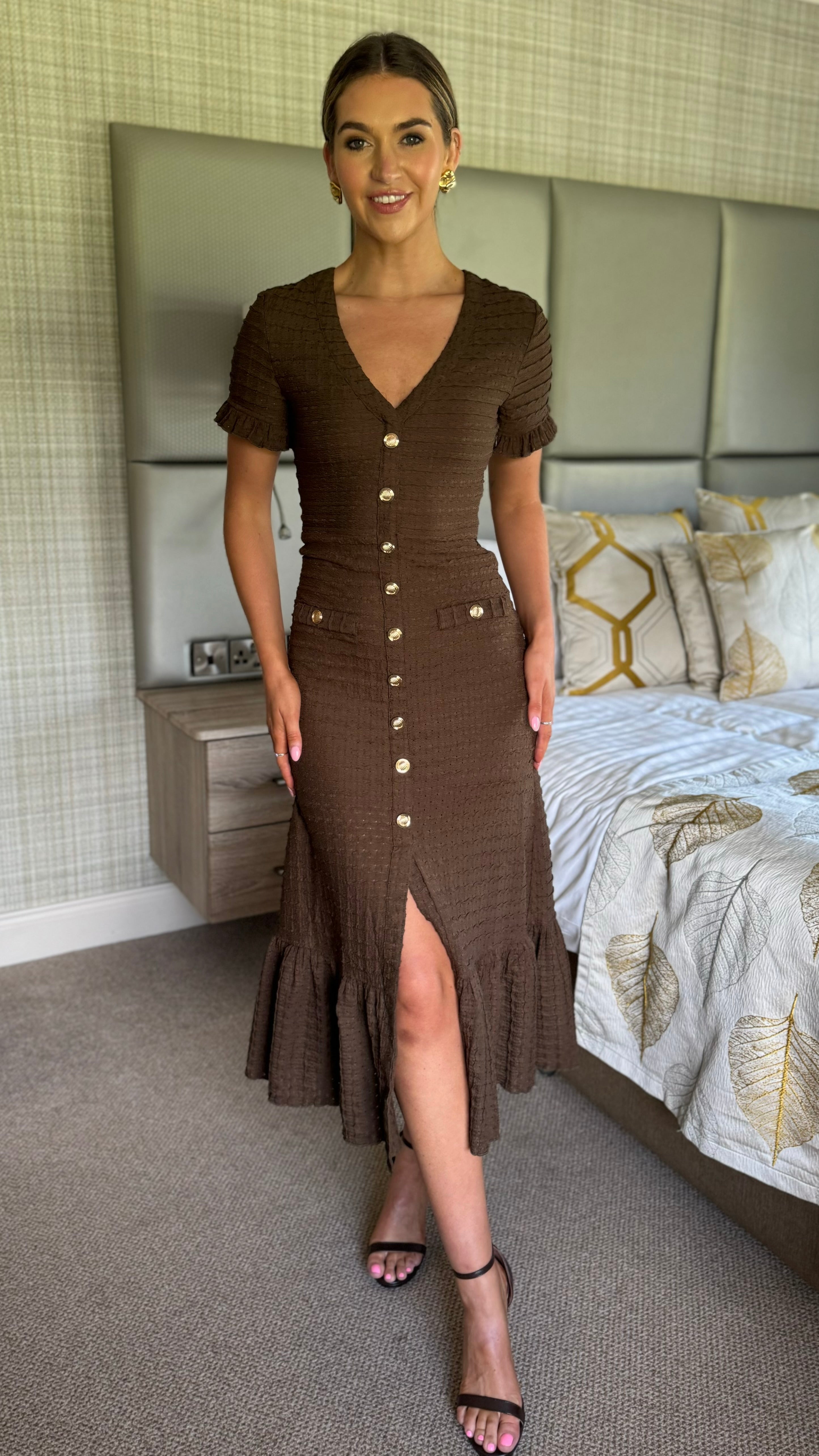 Evangeline Brown Frill Gold Button Up Waffle Detail Midi Dress