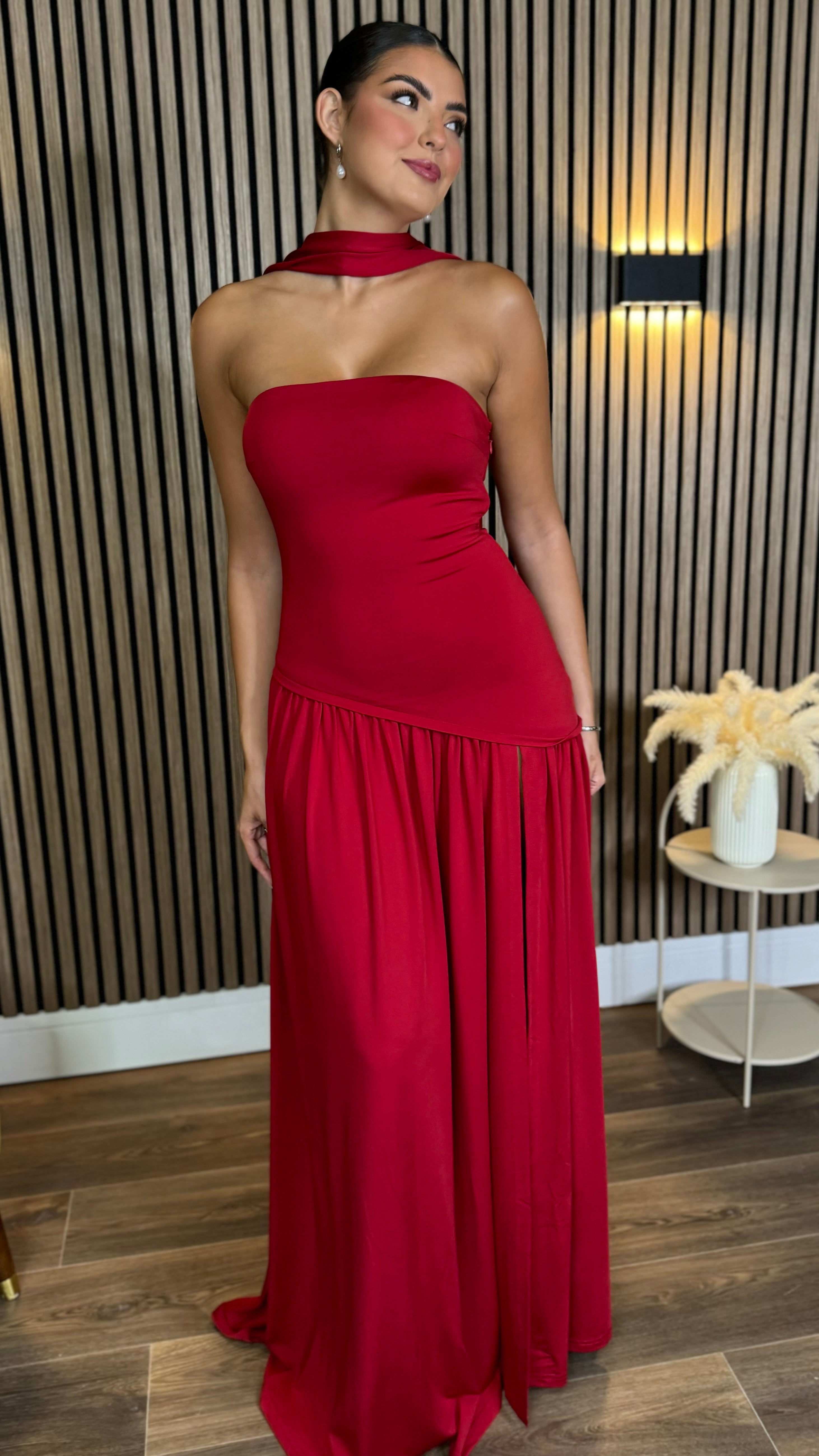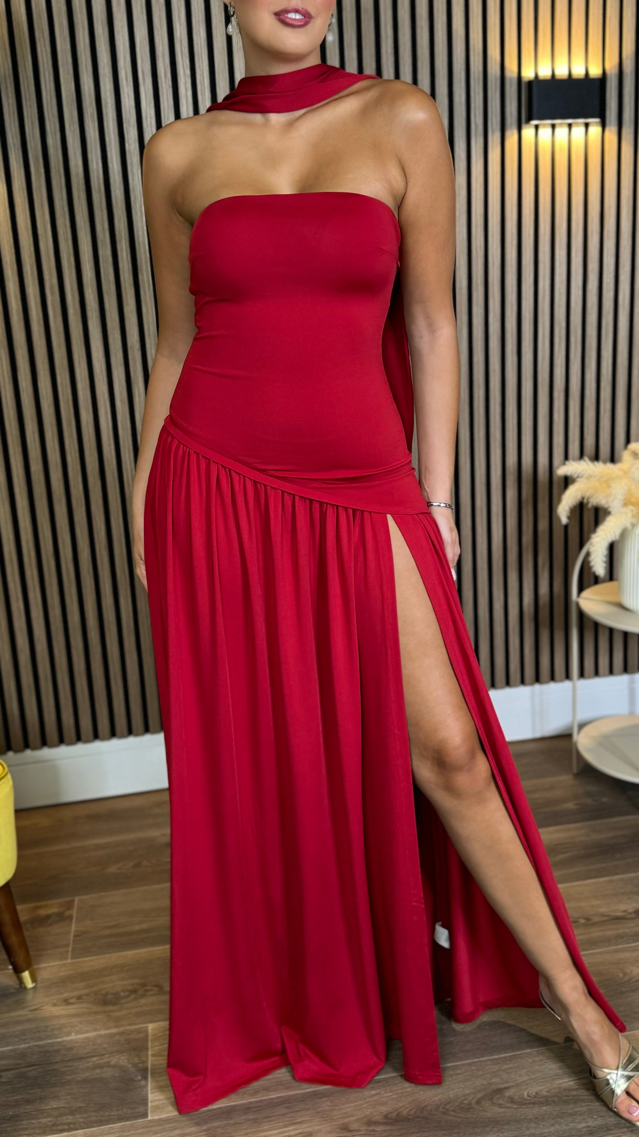 Haisley Red Strapless Asymmetrical Midaxi Dress