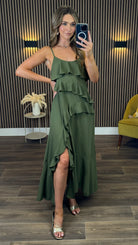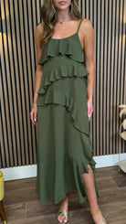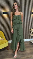 Harlow Khaki Cami Strap Ruffle Asymmetrical Detail Midaxi Dress