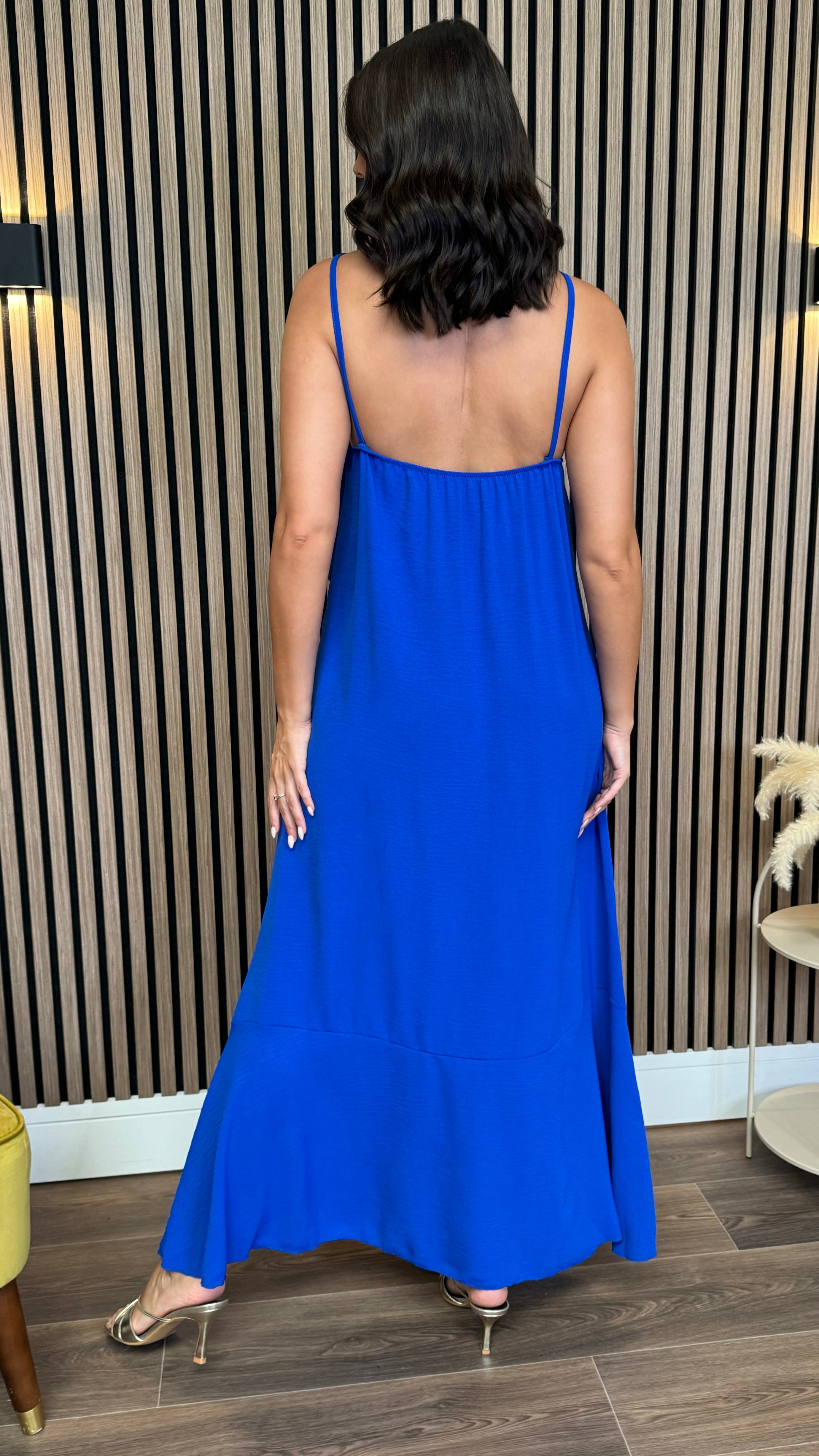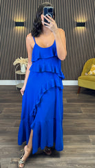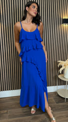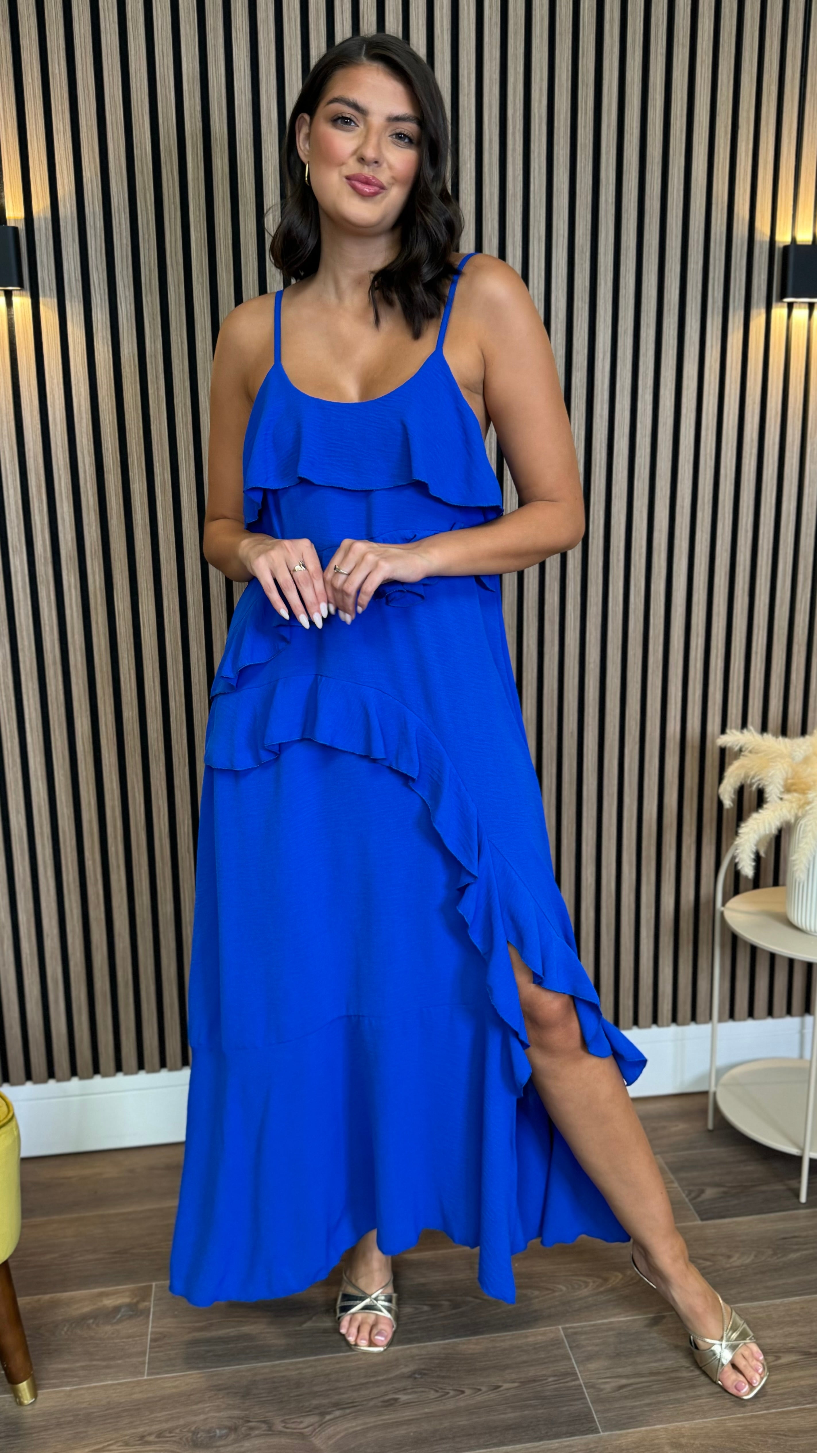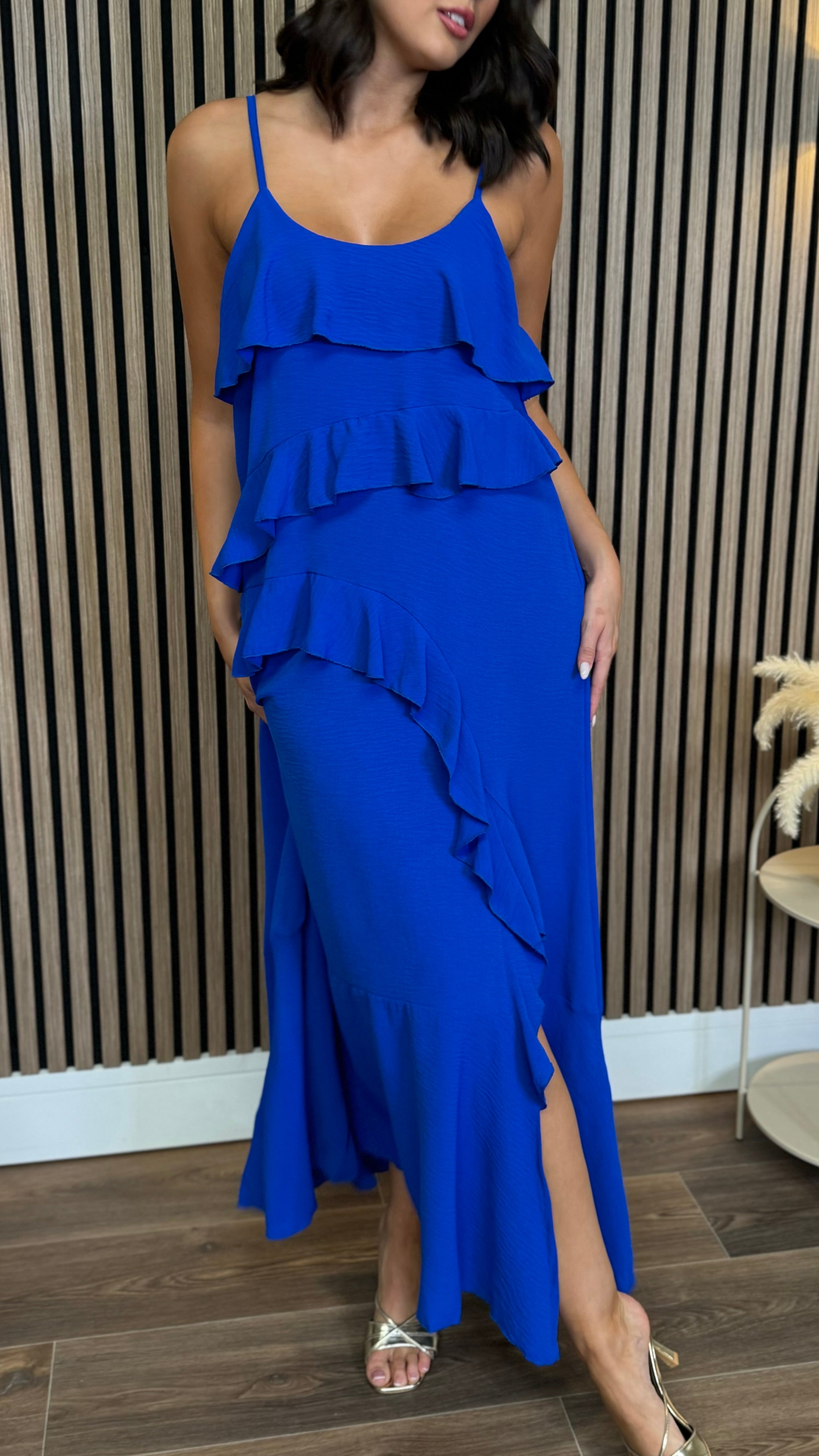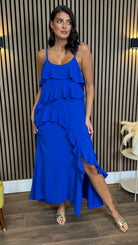 Harlow Royal Blue Cami Strap Ruffle Asymmetrical Detail Midaxi Dress