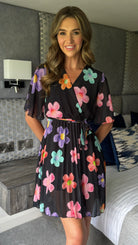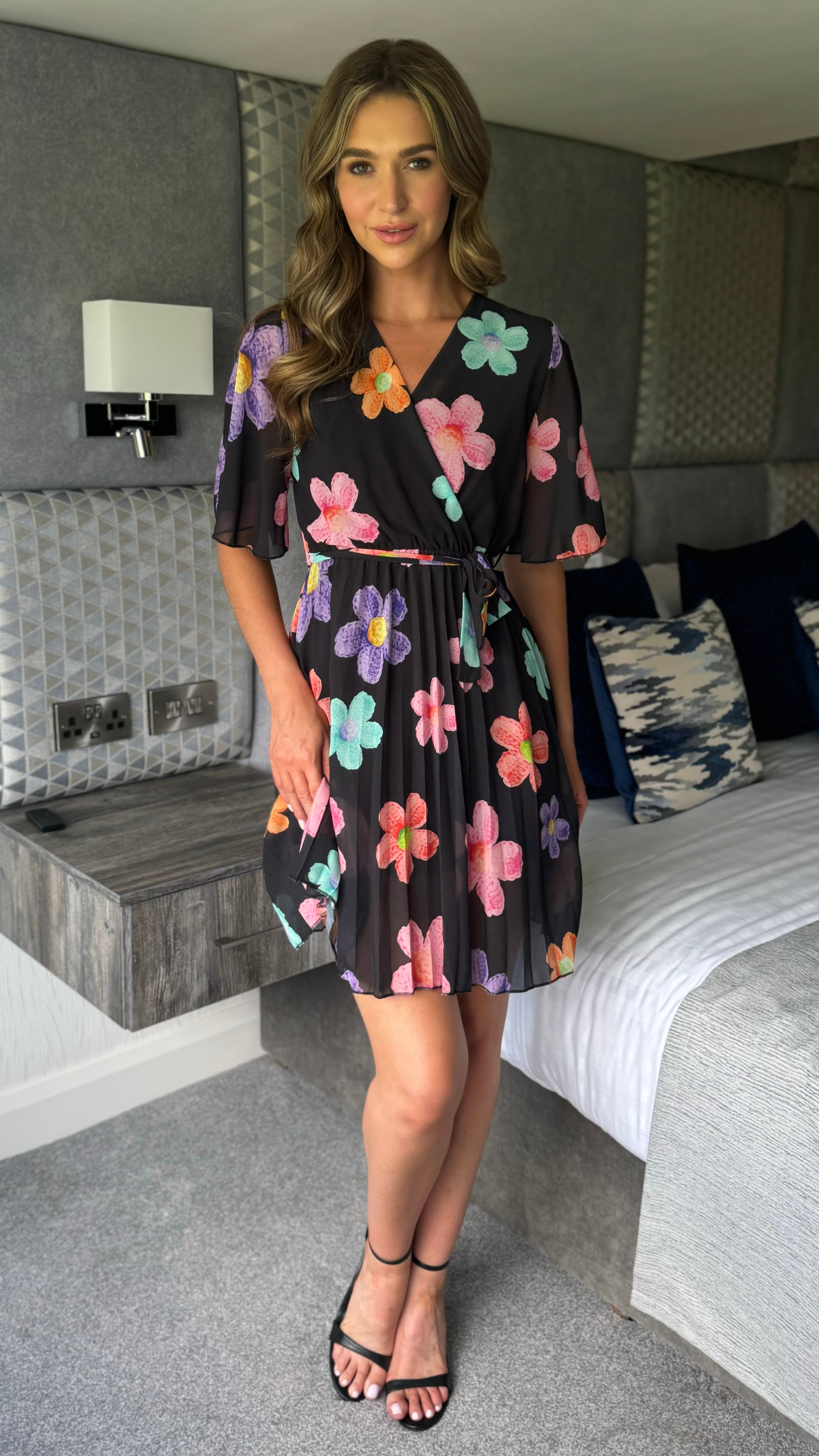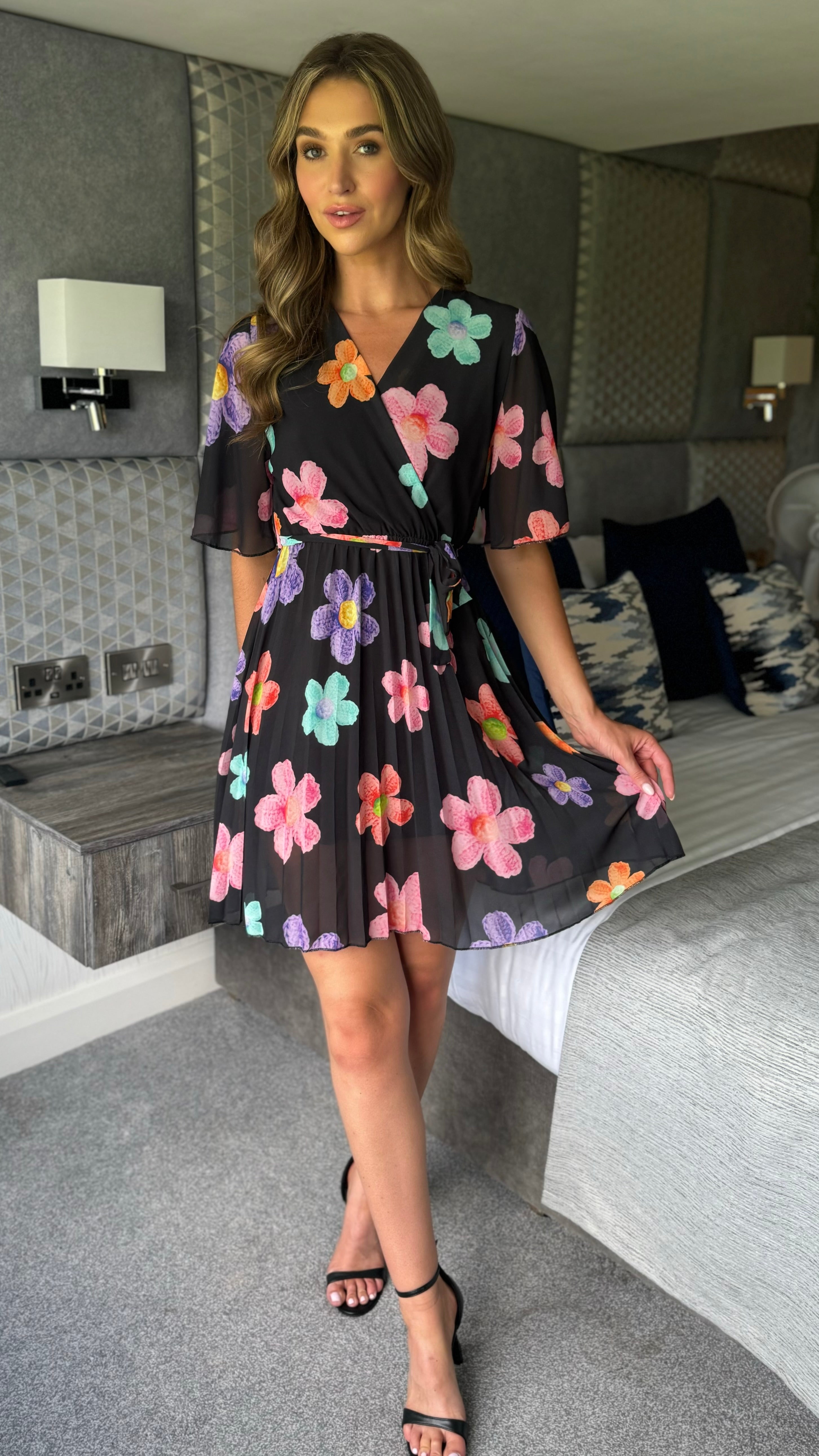 Hattie Black & Multi Flower Tie Detail Short Sleeve Pleated Mini Dress