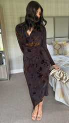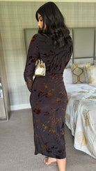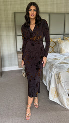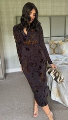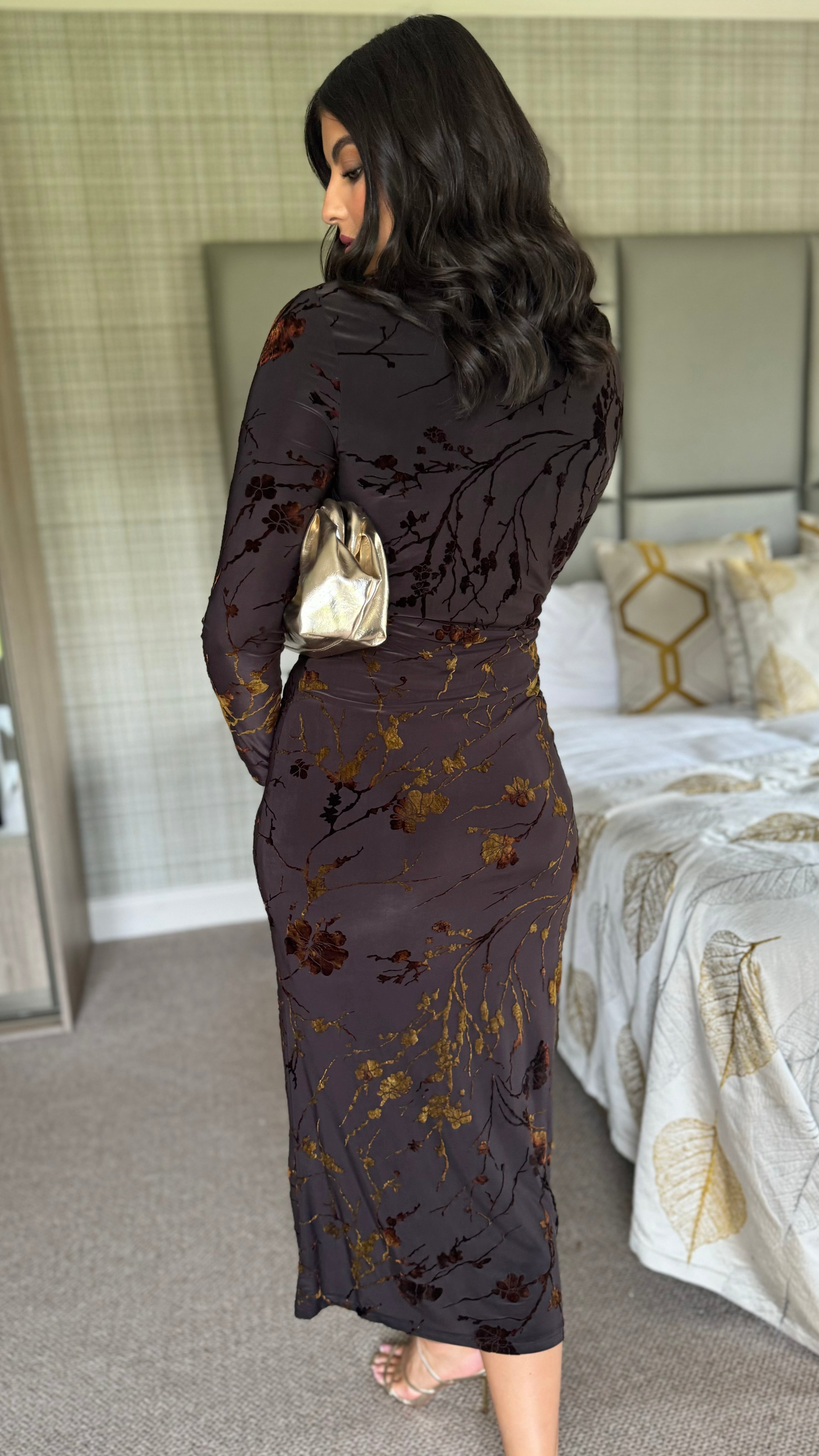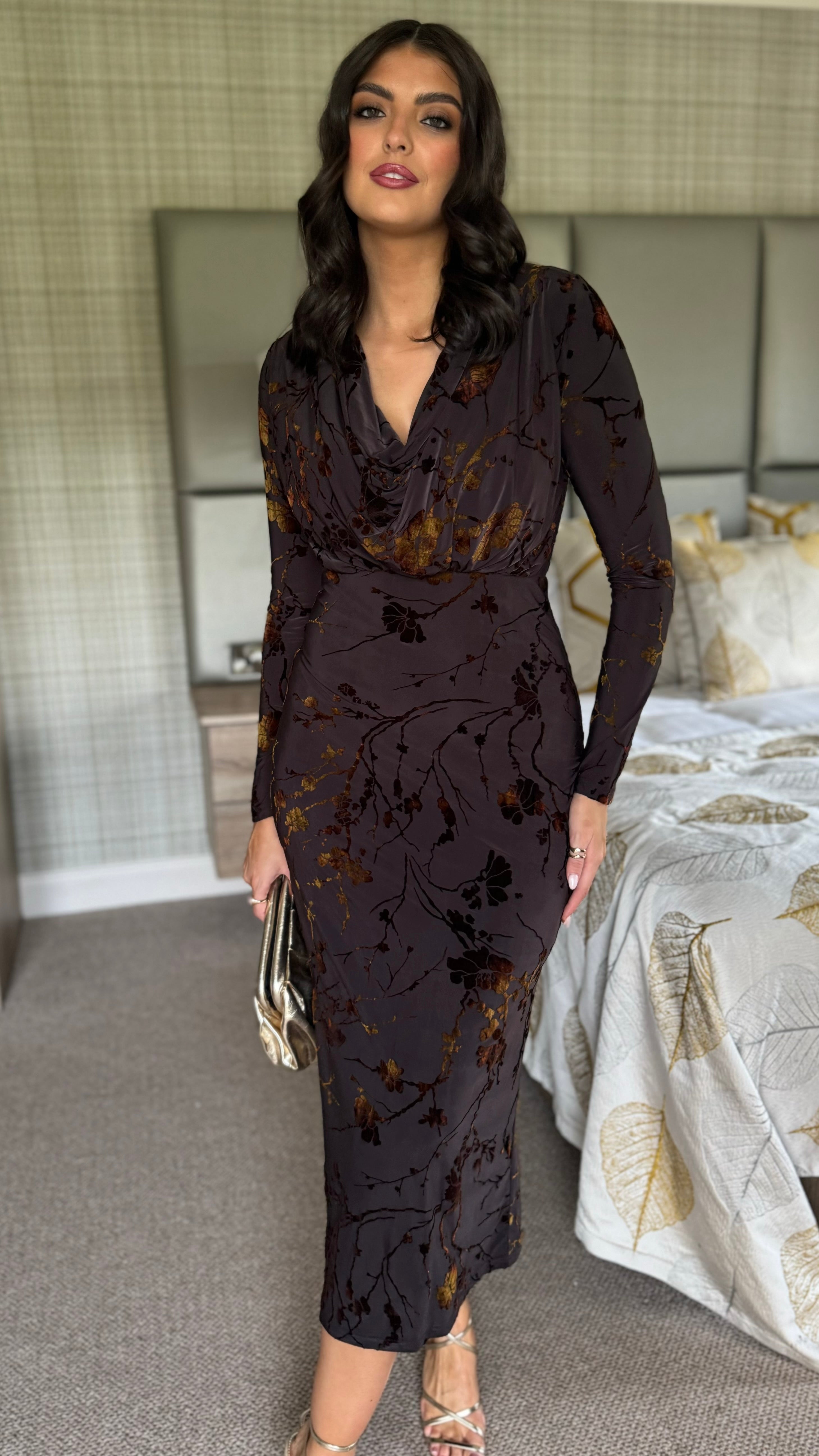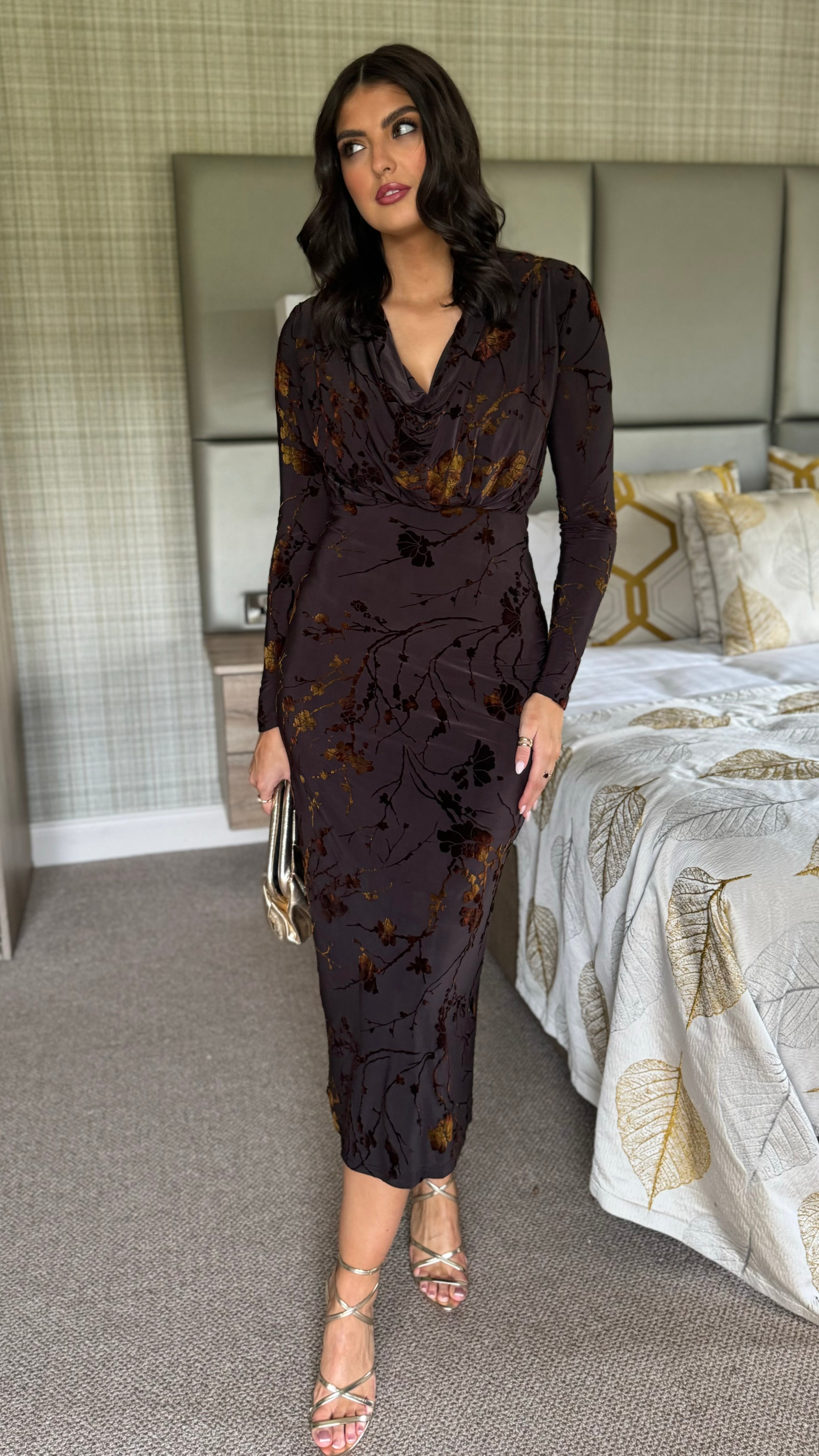 Havana Brown Floral Embossed Cowl Neck Midi Dress
