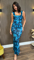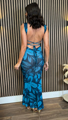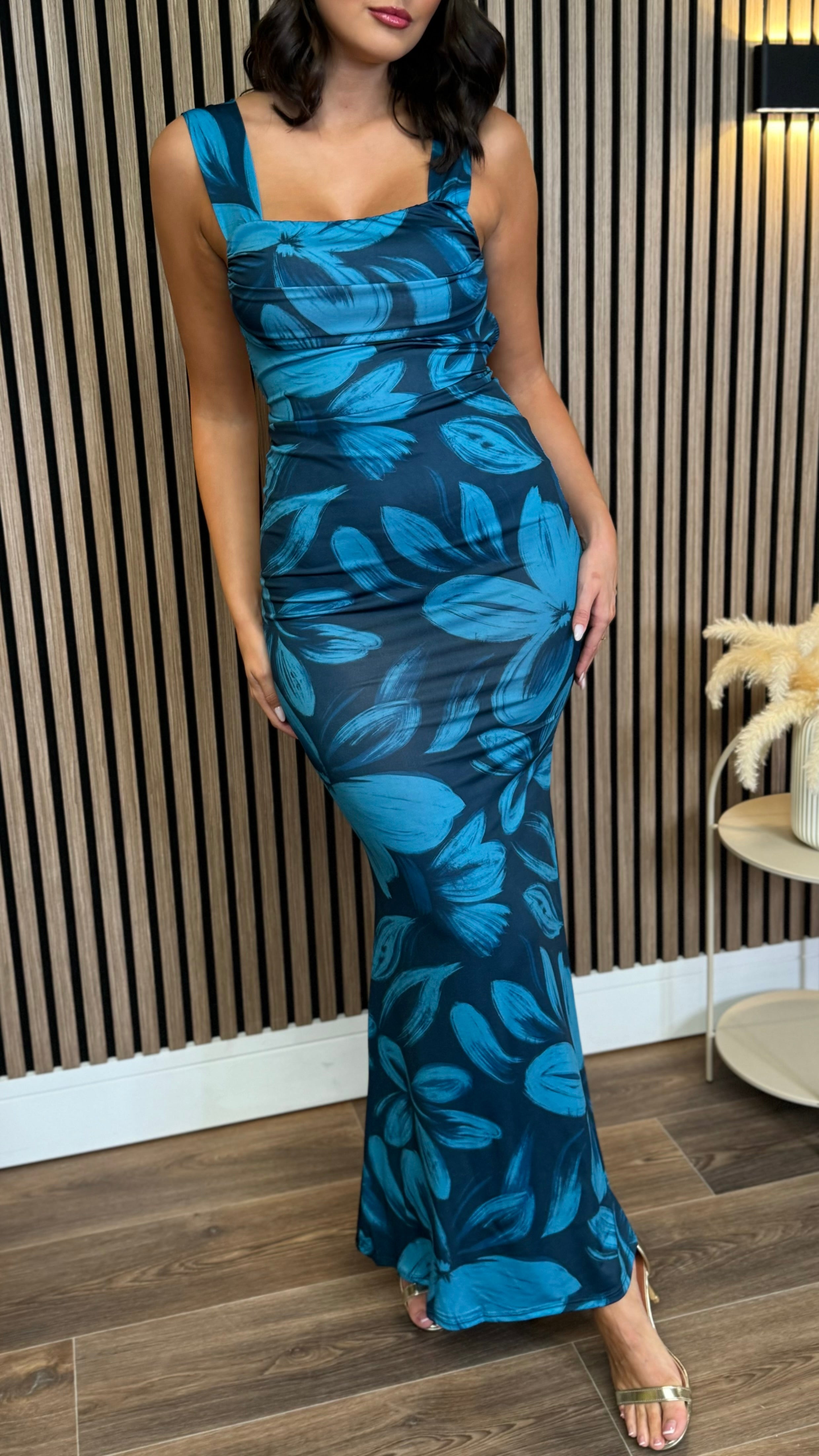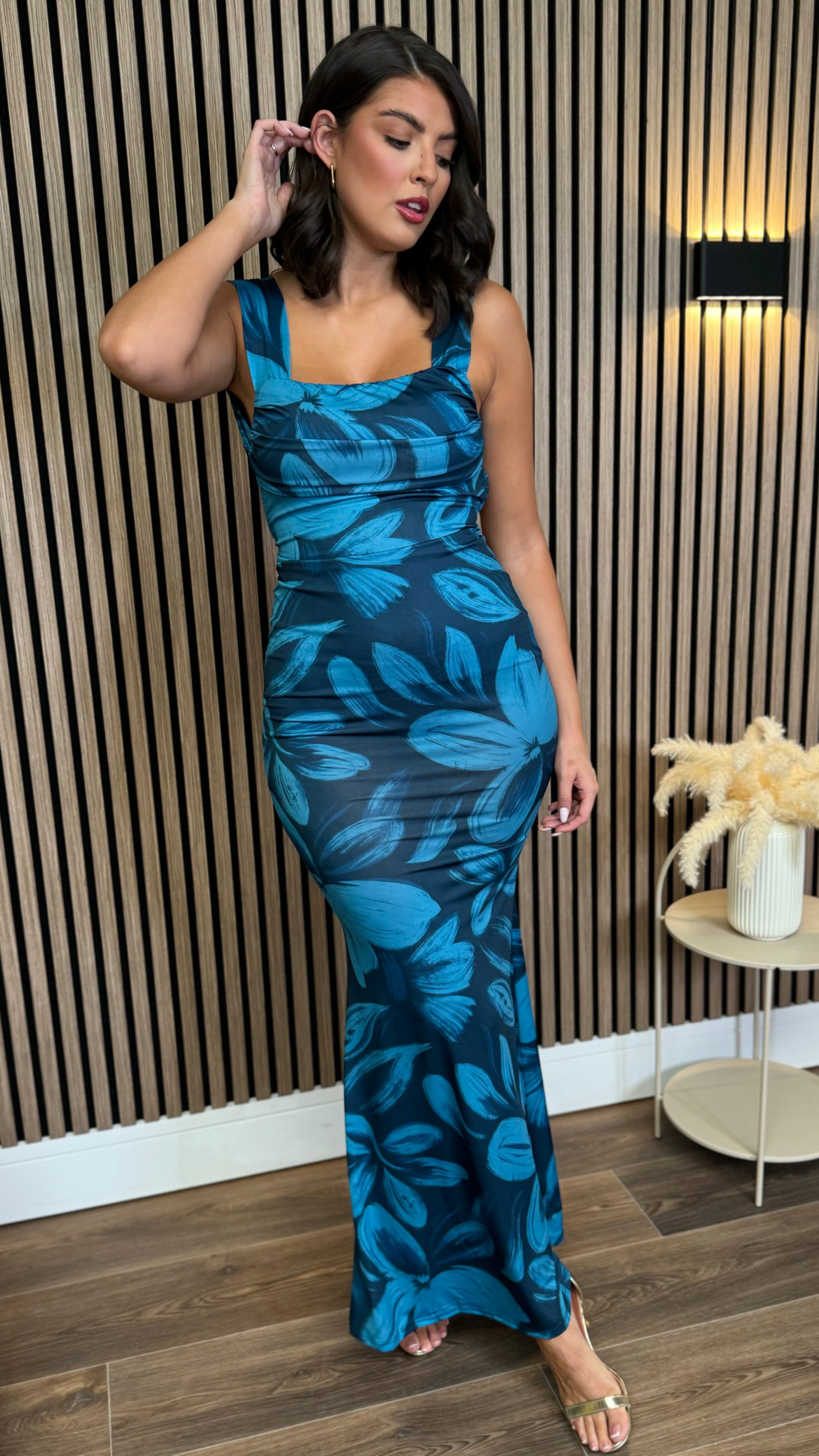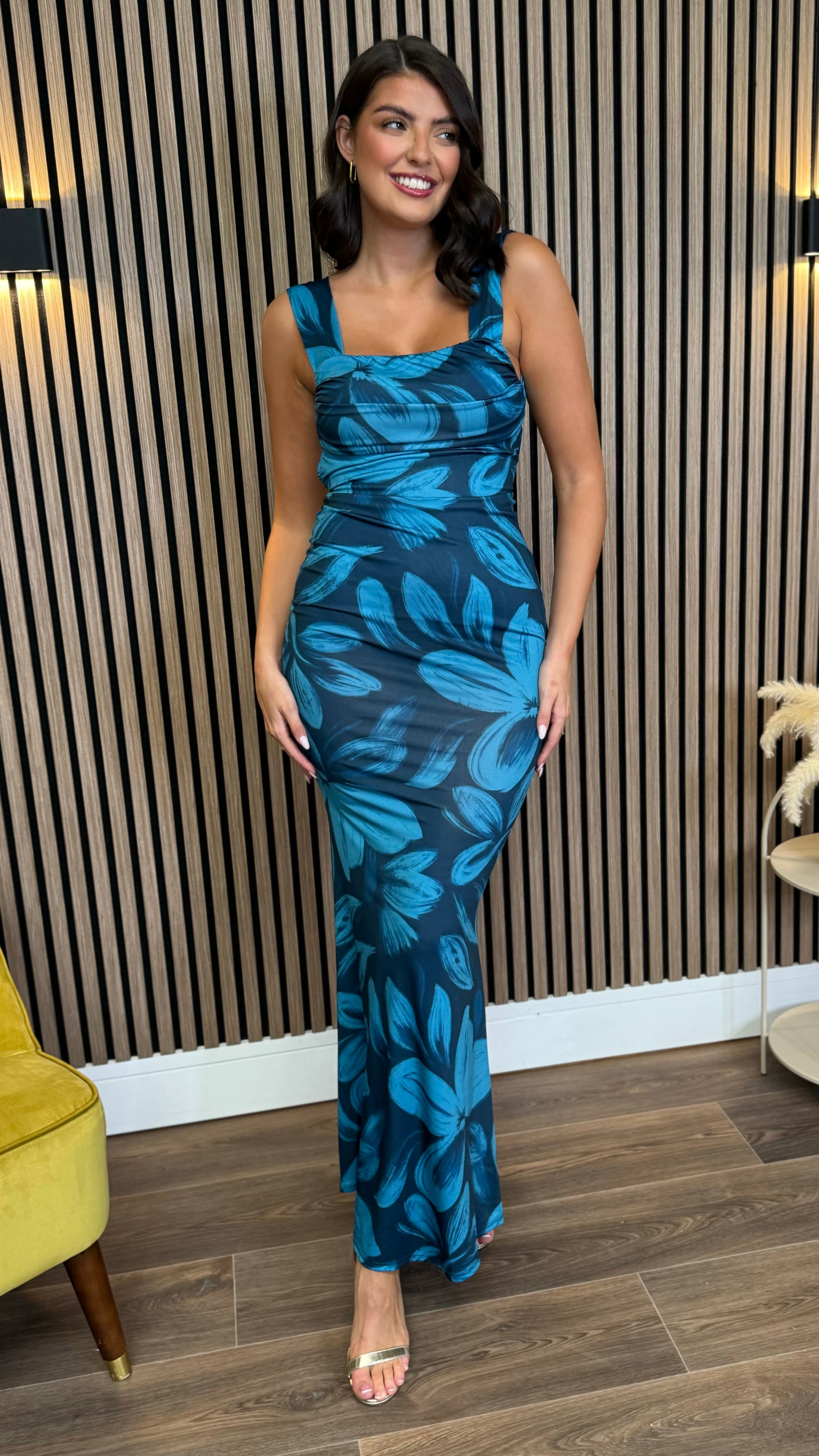 Jade Petrol Blue Floral Square Neck Tie Back Detail Midaxi Dress