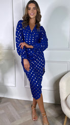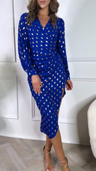 Jasper Cobalt Blue & Gold Foil Wrap Asymmetric Dress