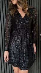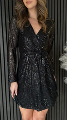 Add some sparkle to your wardrobe with the Jess Black sequin Belted Mini Dress! With a v neckline and wrap style top, this dress will have you shining all night long. Perfect for a night out or special occasion.