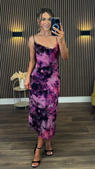 This Julia Black & Purple Abstract Floral Print Cami Strap Midi Dress combines delicate floral patterns with a graceful silhouette. The soft cami straps and flowing midi length create a charming look perfect for sunny days or special occasions. Feel confident and radiant in this lovely dress that brings a touch of artful elegance to your wardrobe. 🌸✨