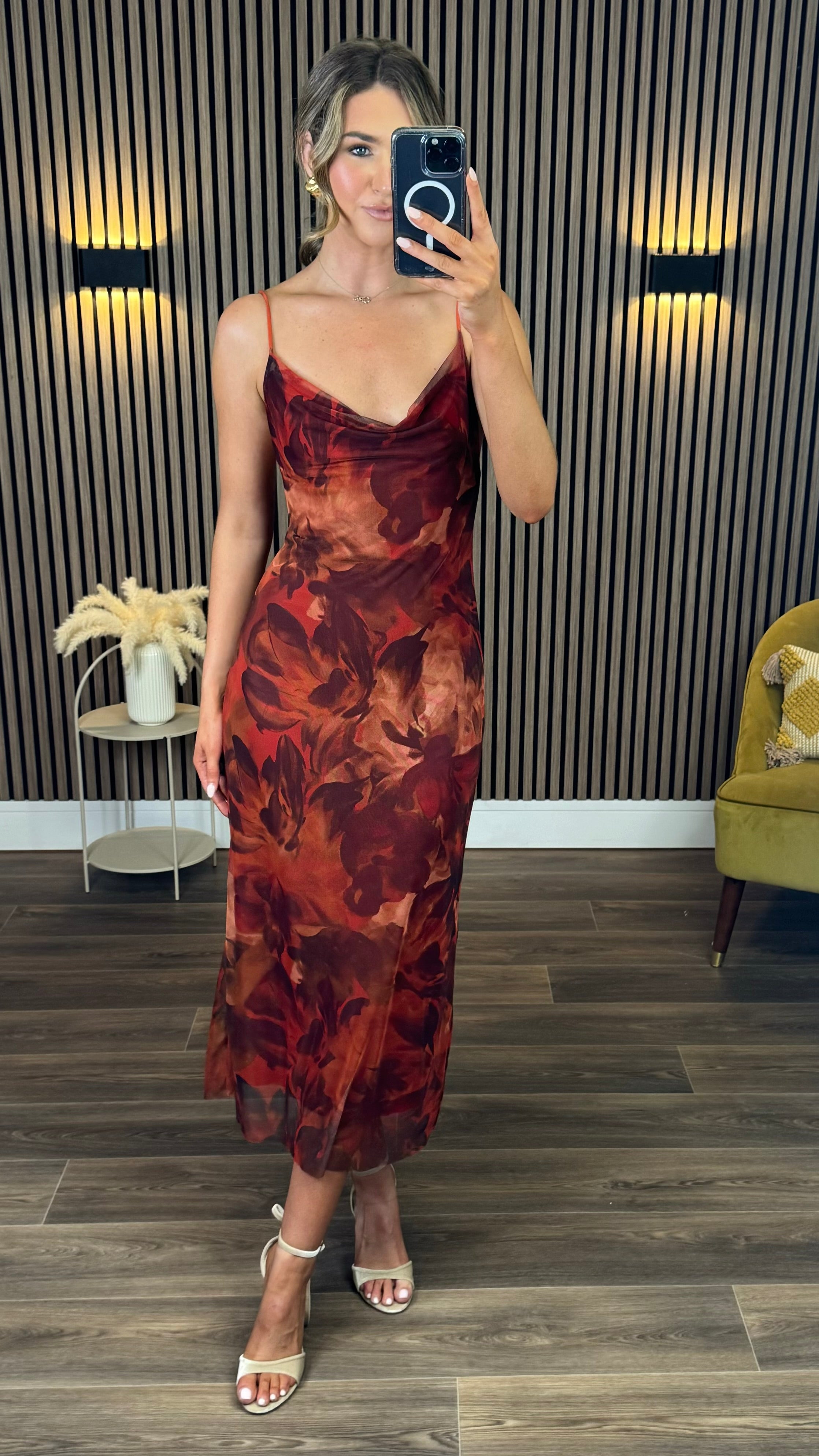 Julia Orange & Rust Abstract Floral Print Cami Strap Midi Dress