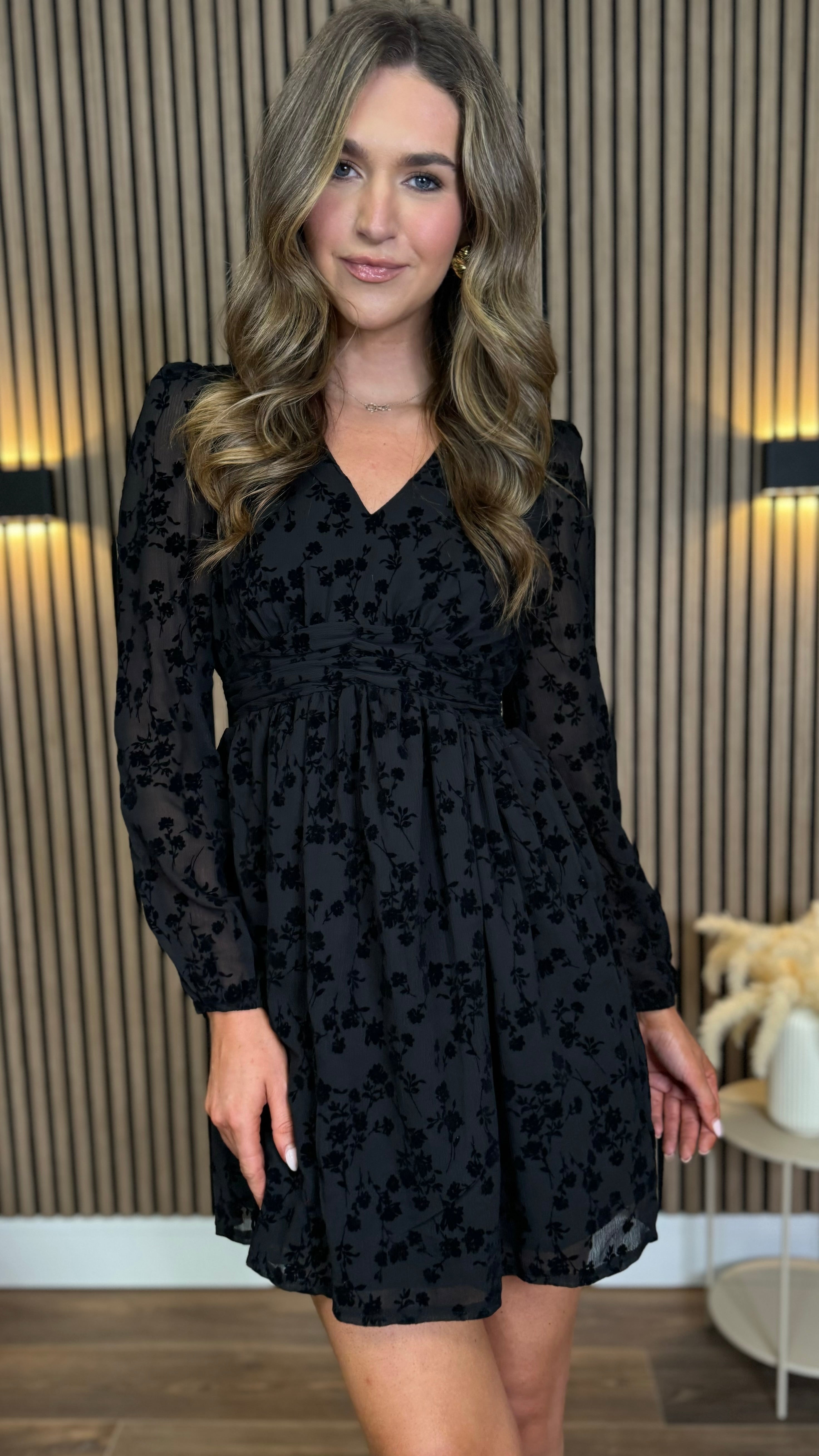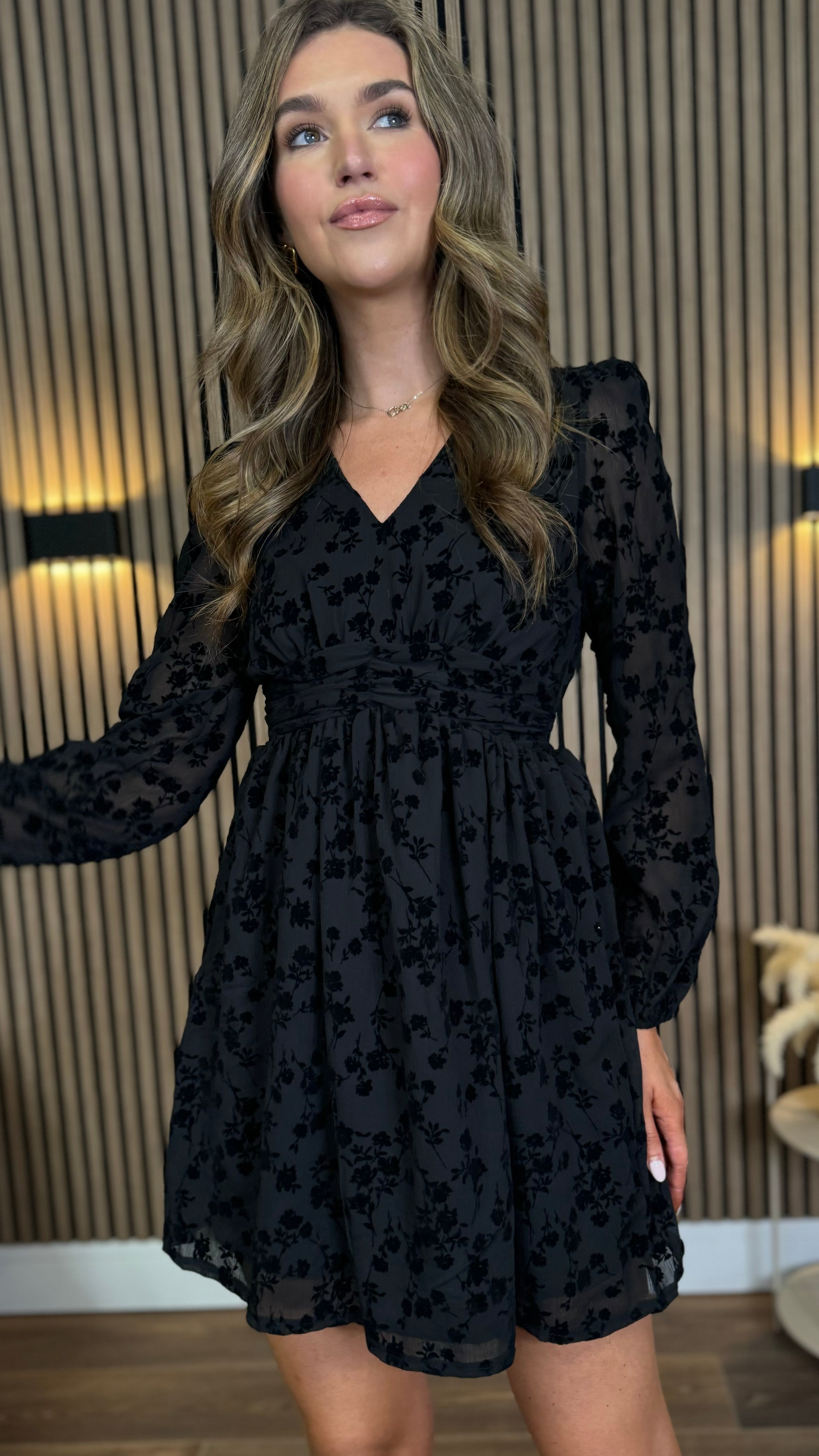 Keava Black Floral Detail Long Sleeve Mini Dress