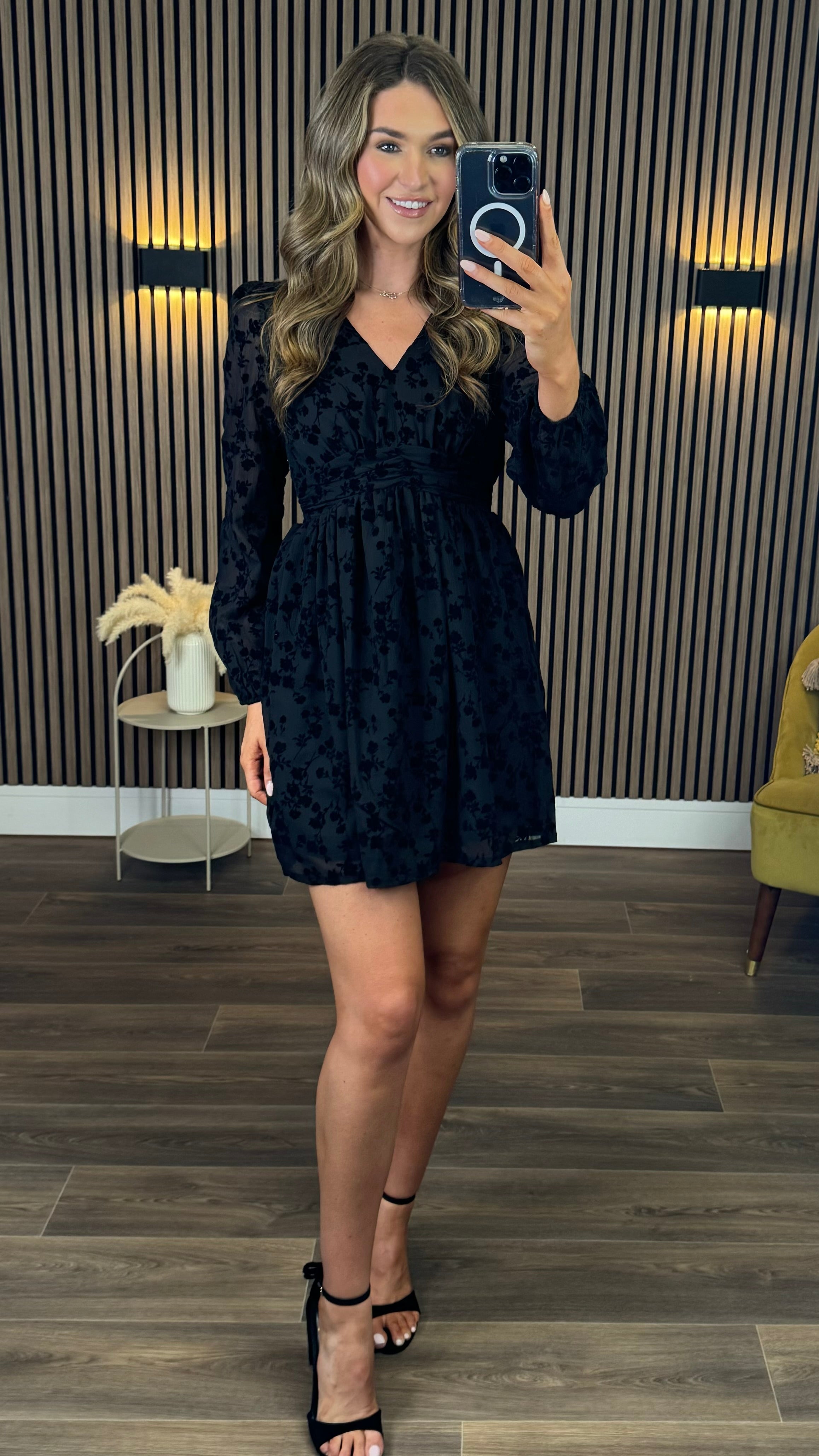 Step out in style with the Keava Black Floral Detail Long Sleeve Mini Dress! 🌸 This playful mini combines elegant floral details with comfy long sleeves, perfect for twirling through day or night. The flattering silhouette highlights your legs while keeping you cosy, making it an irresistible choice for any occasion. Add some sparkle to your wardrobe and let your fun side bloom! ✨💃