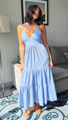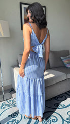 Feel confident and comfortable in the Keily Blue & White Pinstripe Cami Strap Midi Dress! 💙 Its breathable fabric and classic pinstripe design make it perfect for any occasion. Adjustable straps provide a personalized fit, helping you look and feel your best all day long. 🌿✨