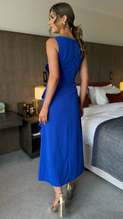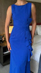 The Kendra Royal Blue Ruffled Midaxi Dress combines elegance with playful design. Its royal blue shade enhances any occasion, featuring a comfortable round neckline and sleeveless cut for ease of movement. Delicate ruffle details and asymmetric panels add a unique flair, while the diamanté neckline brings subtle sparkle.