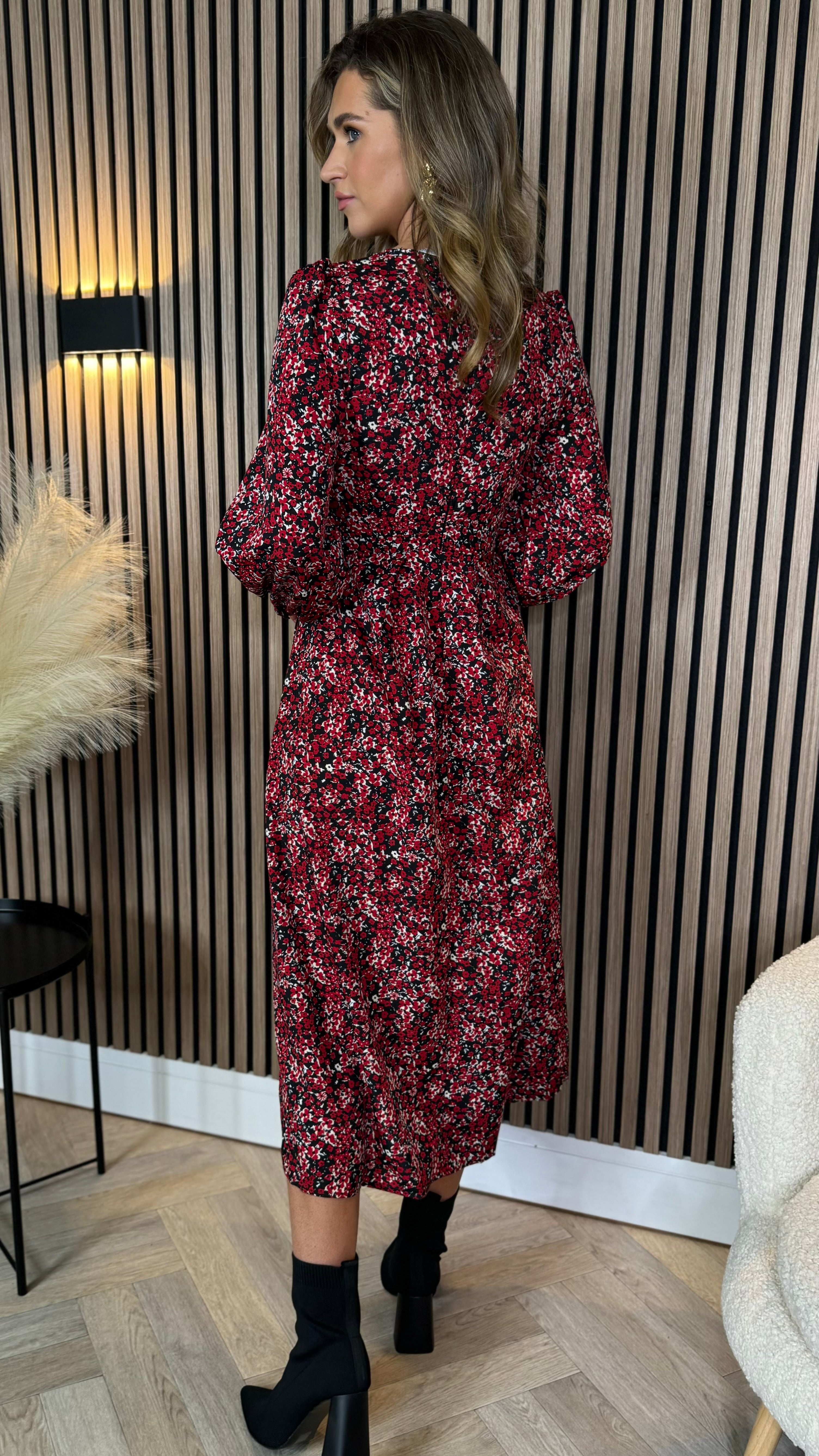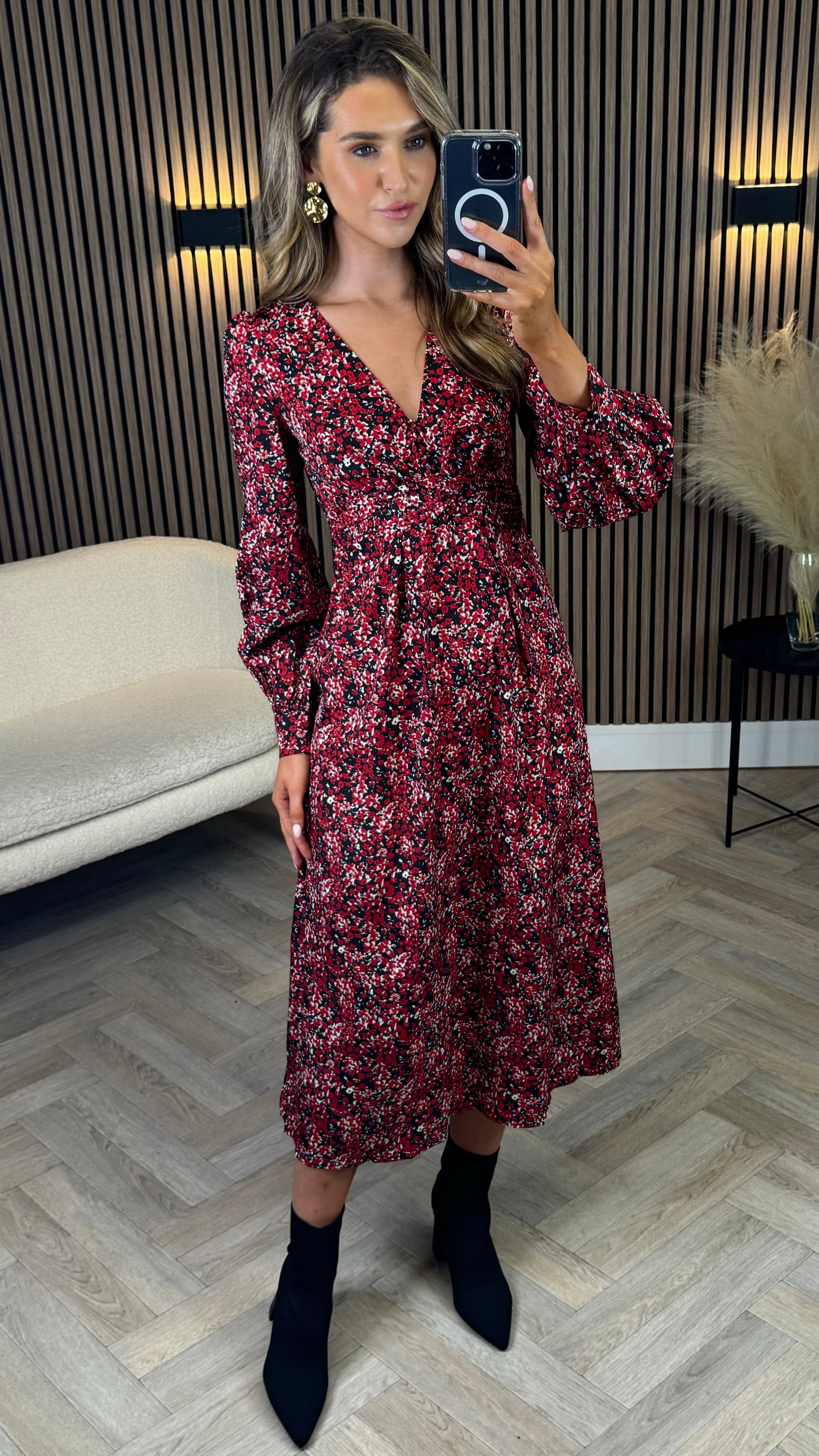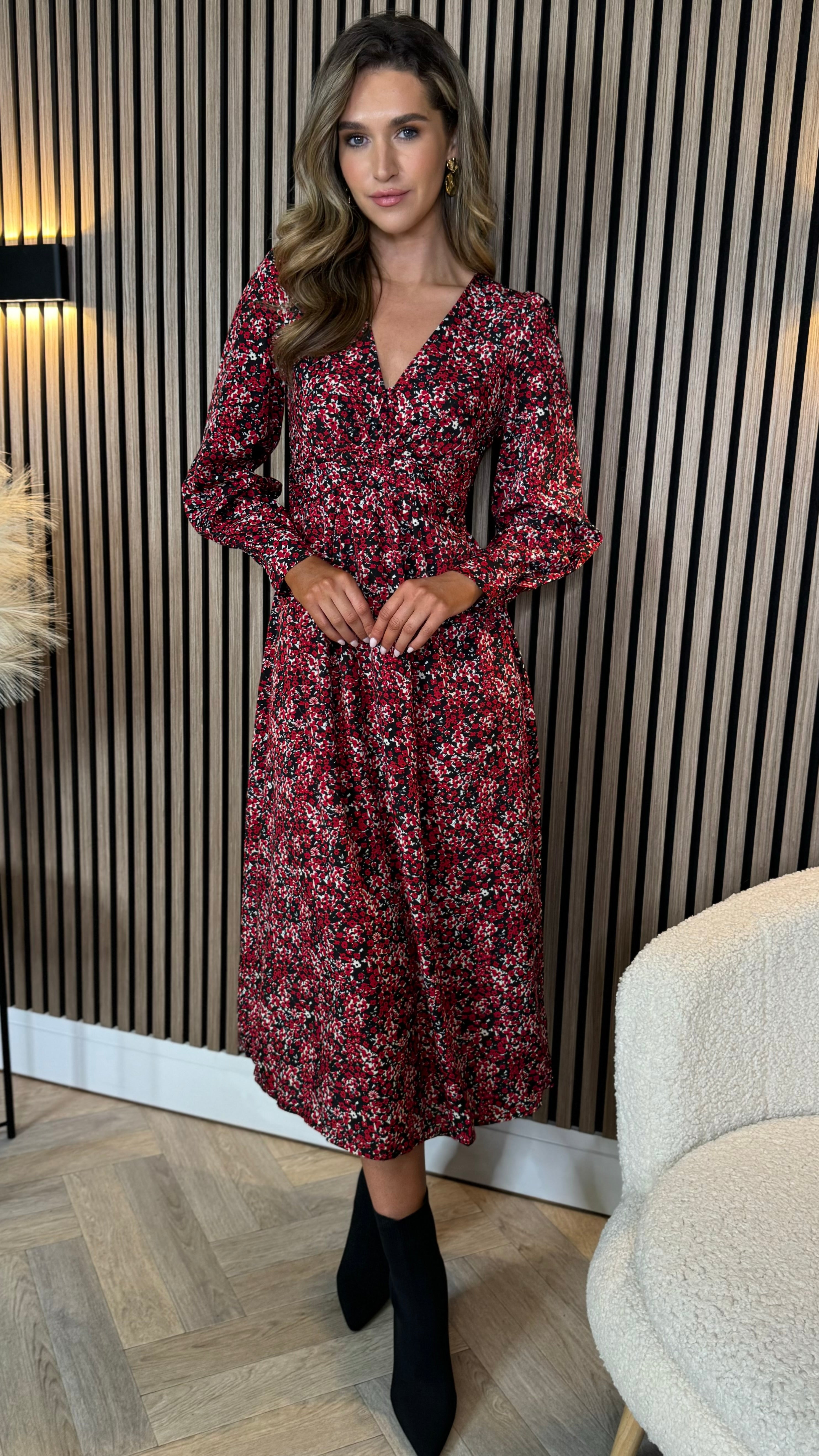 Introducing Lalika Black & Red Floral Print Midi Dress! This dress boasts long sleeves, a flattering v neckline, and waist definition for the perfect fit. Get ready to turn heads with its bold and vibrant floral print. Perfect for any occasion! 🌺👗