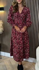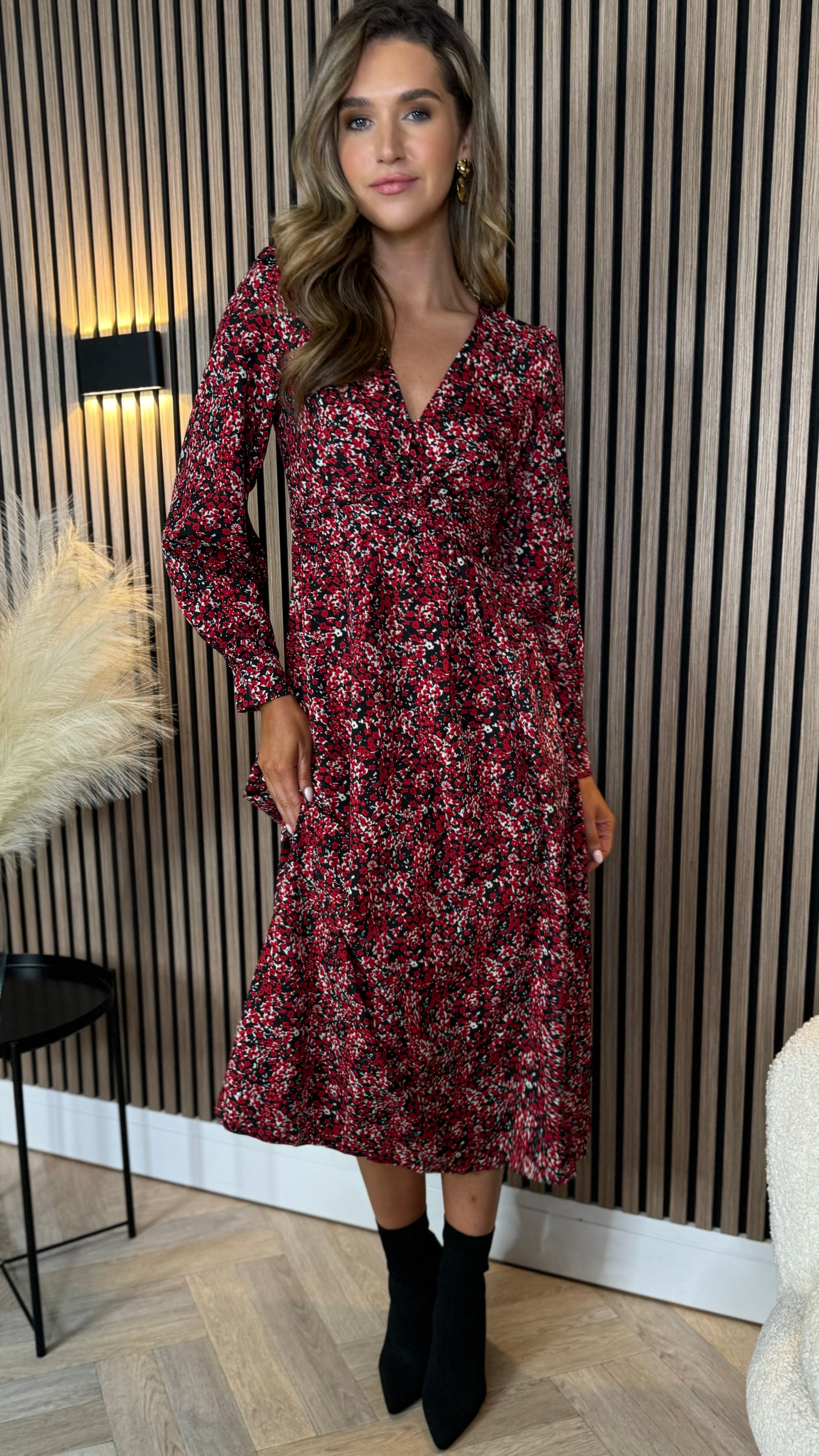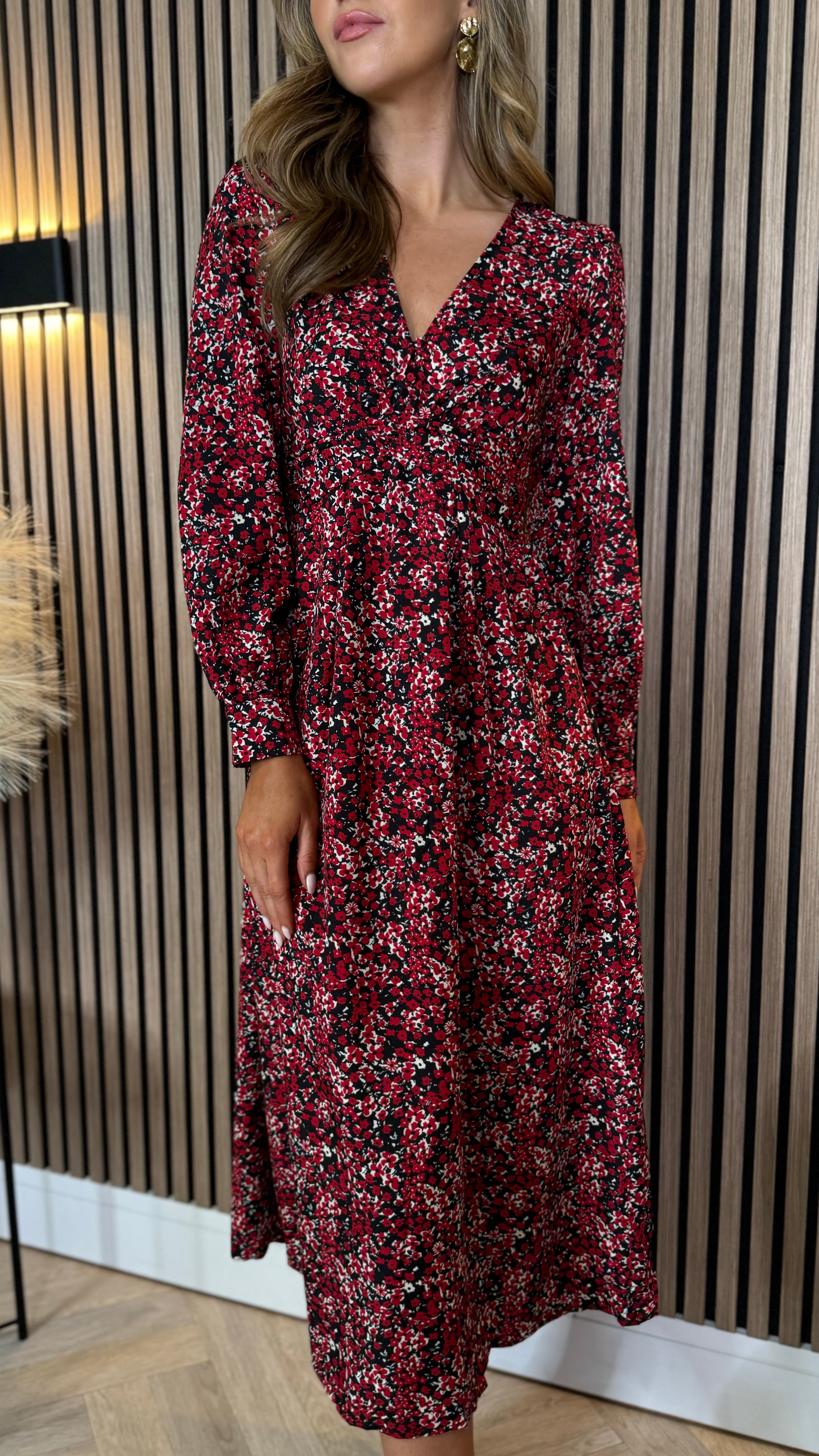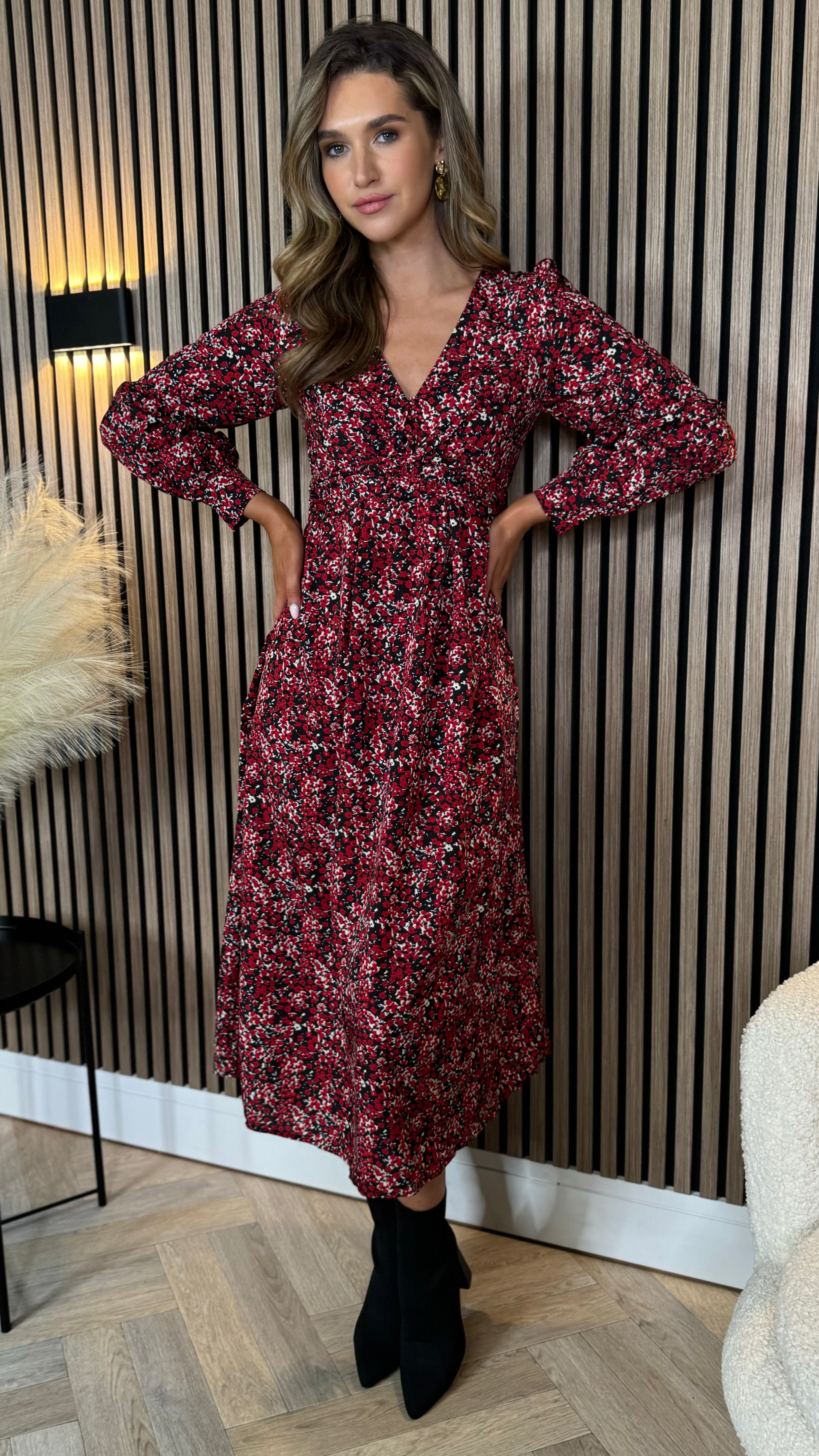 Introducing Lalika Black & Red Floral Print Midi Dress! This dress boasts long sleeves, a flattering v neckline, and waist definition for the perfect fit. Get ready to turn heads with its bold and vibrant floral print. Perfect for any occasion! 🌺👗