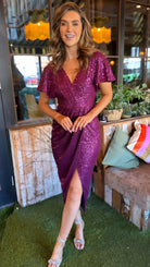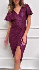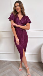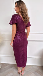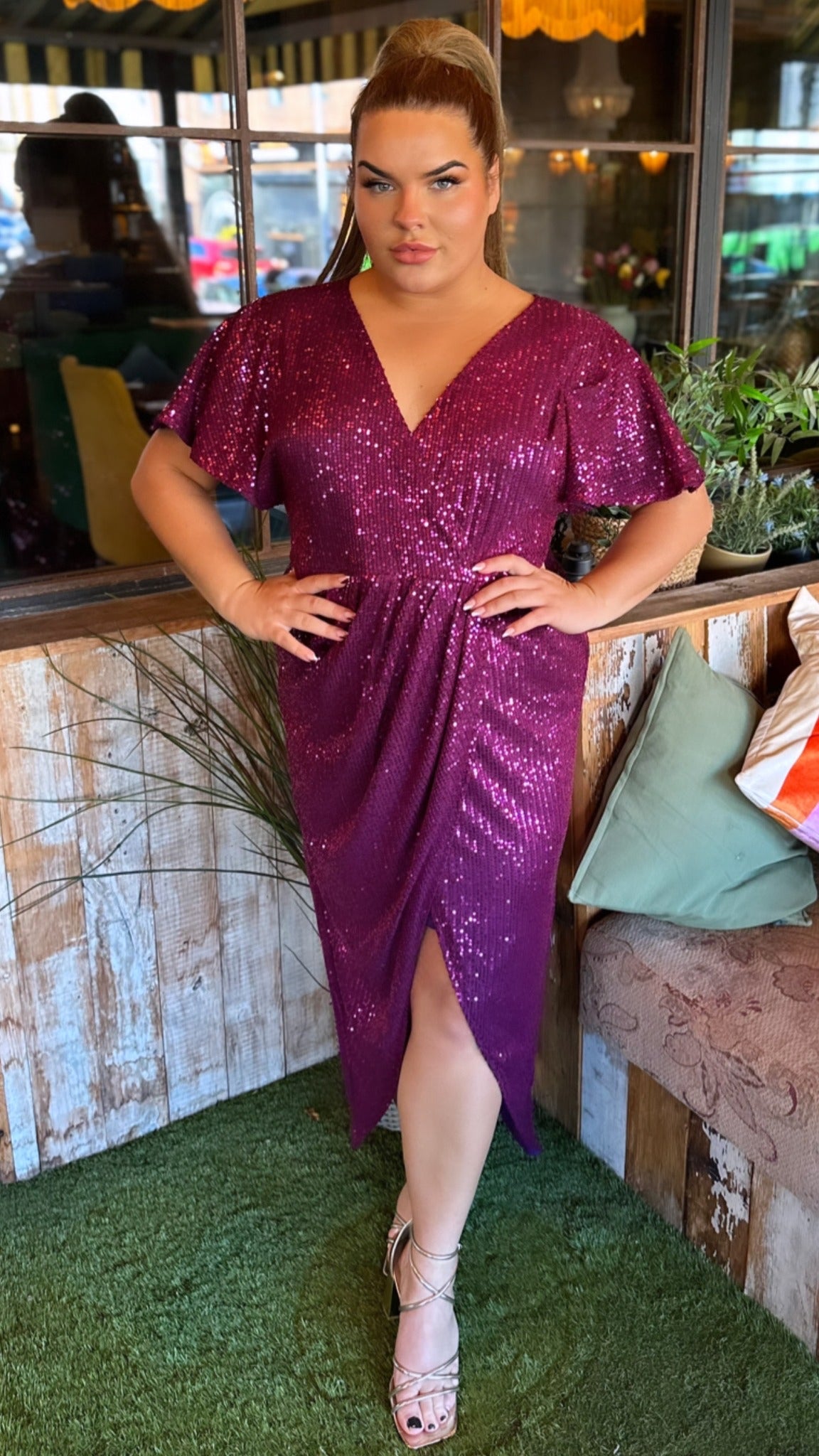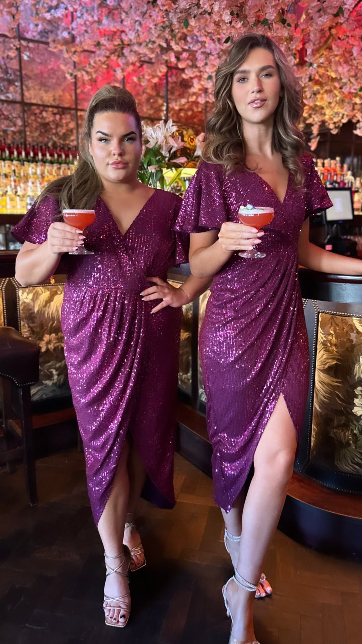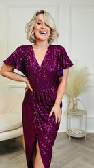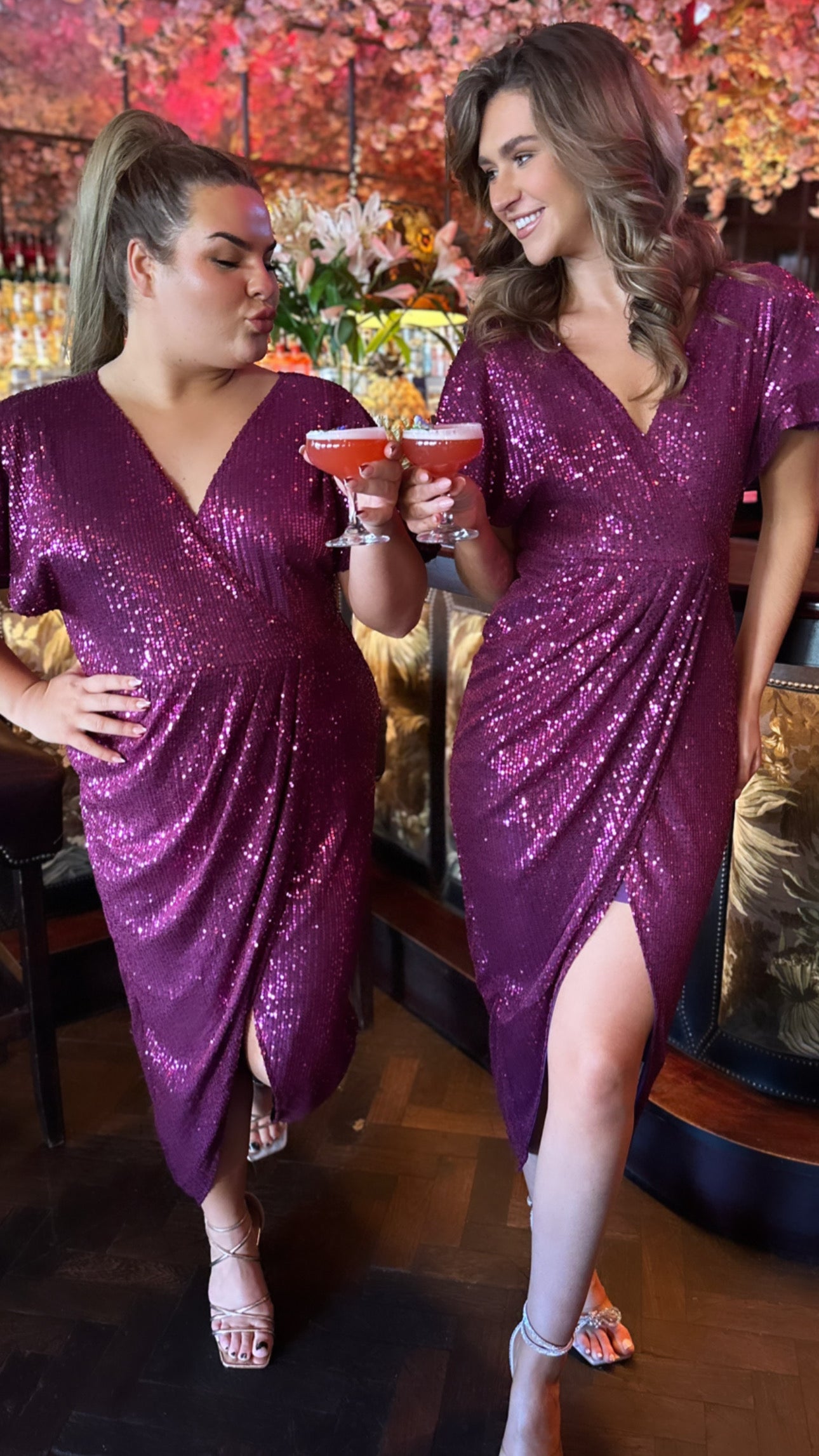 Embellished head to toe in sequins in a comfortable fabric that stretches as you move, this party dress will ensure all eyes are on you! This gorgeous Landan Purple Sequin Wrap Over Maxi Dress, featuring an elasticated waist with ruched detail, a wrap skirt with slit detail, and a wrap front top. Achieve this chic look with your favourite heels and matching clutch.