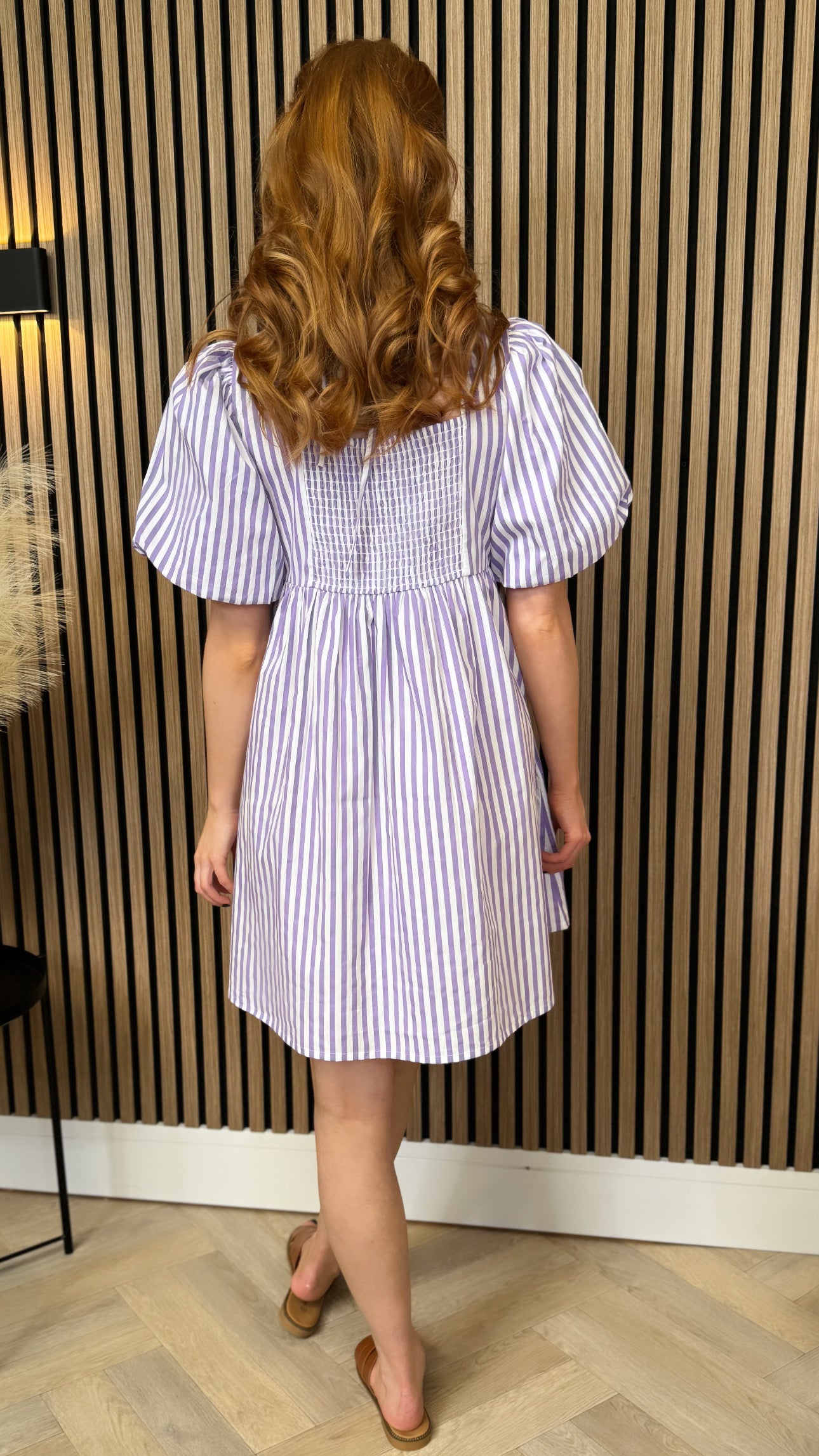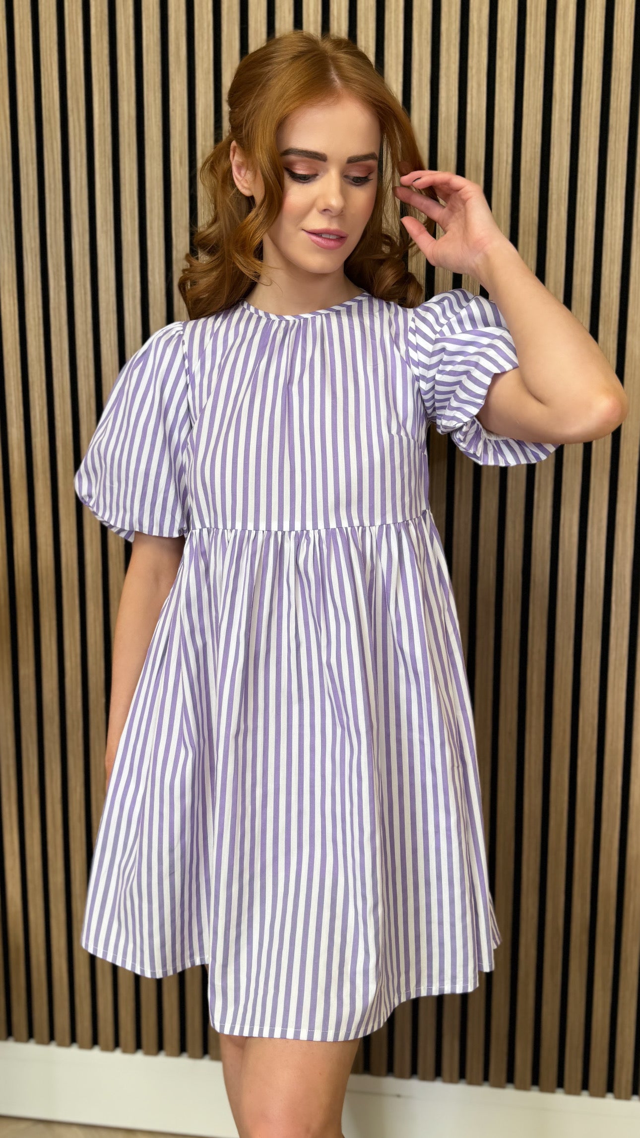 Lee Lilac & White Striped Puff Sleeve Smock Mini Dress