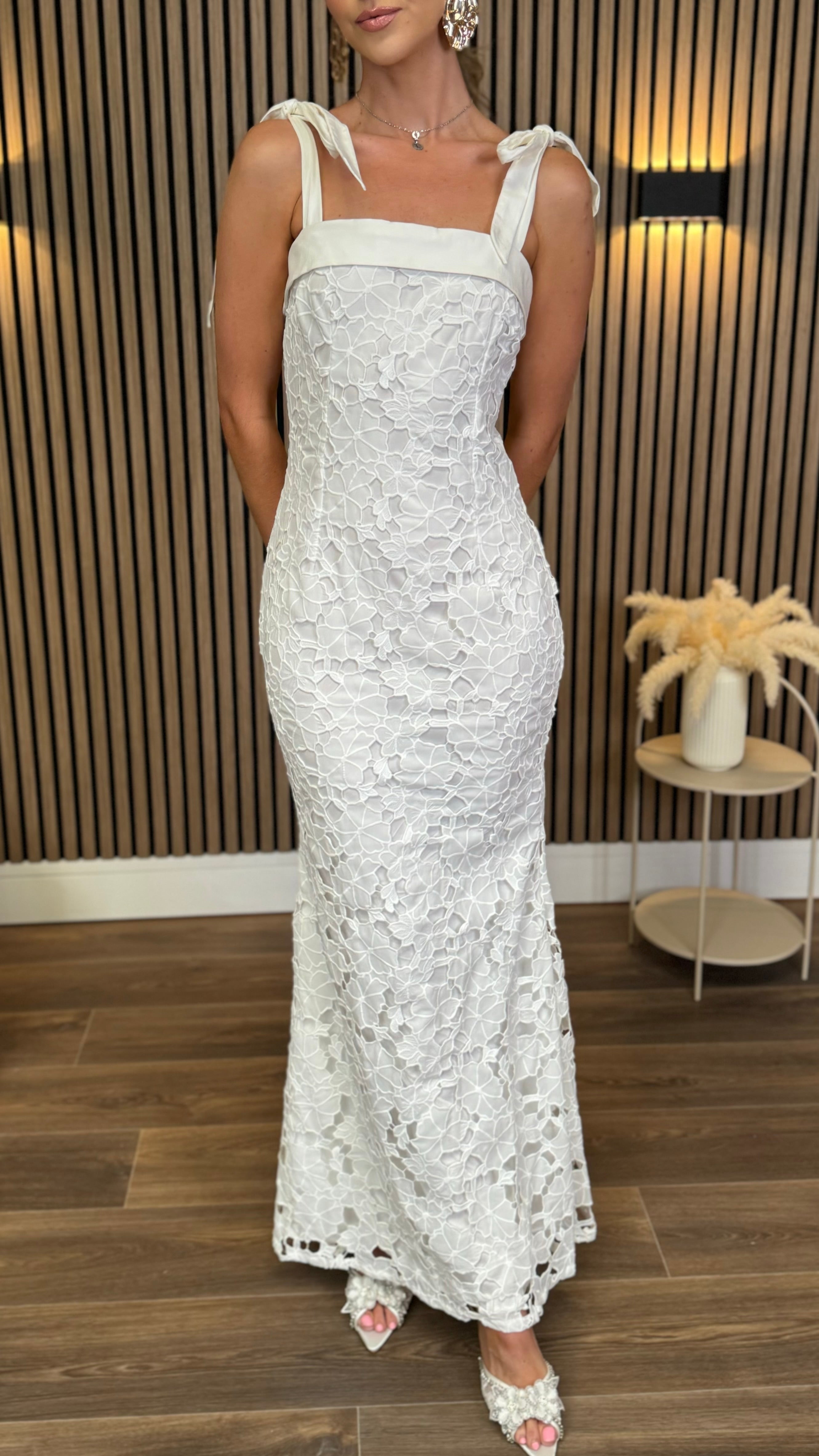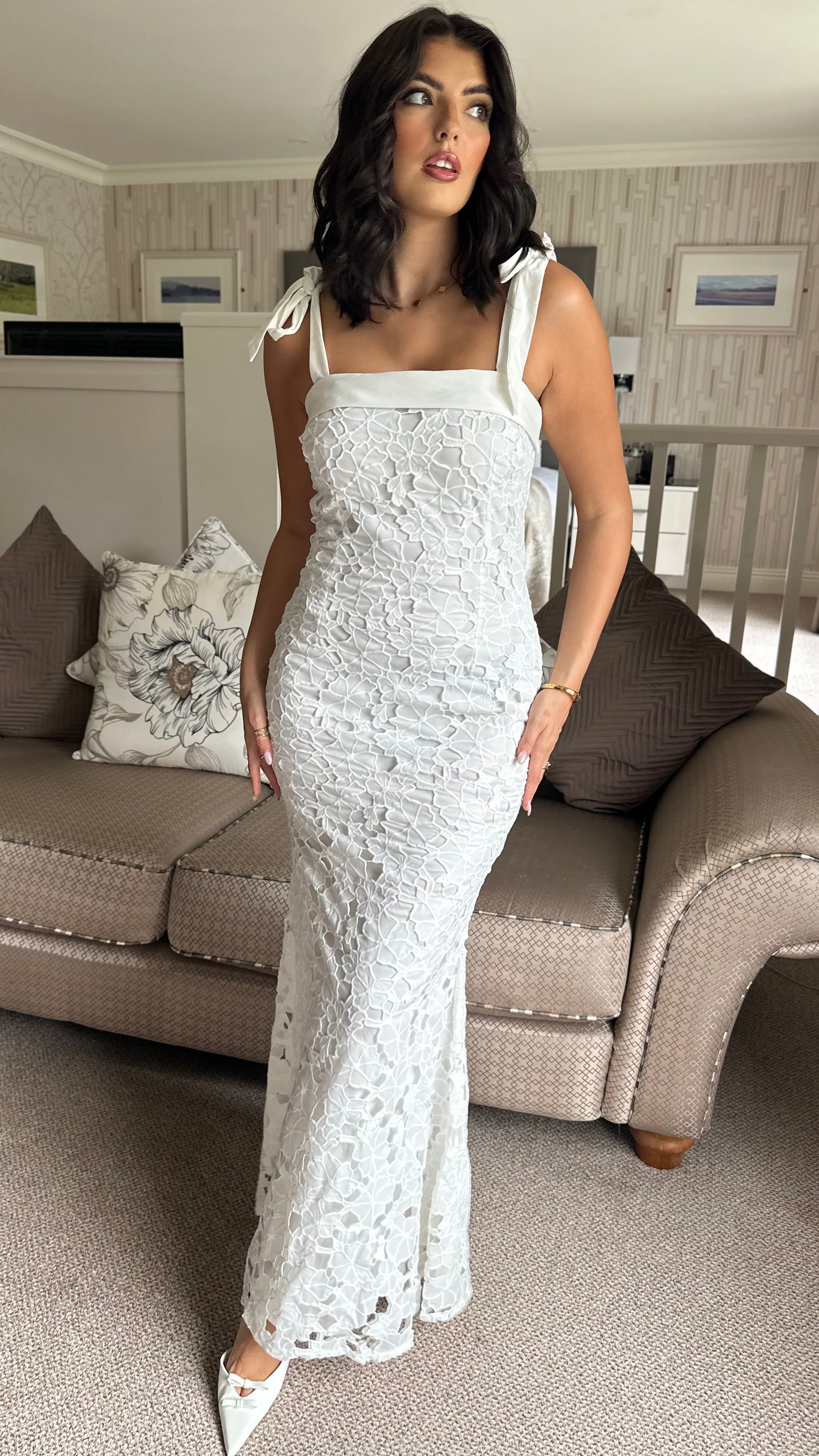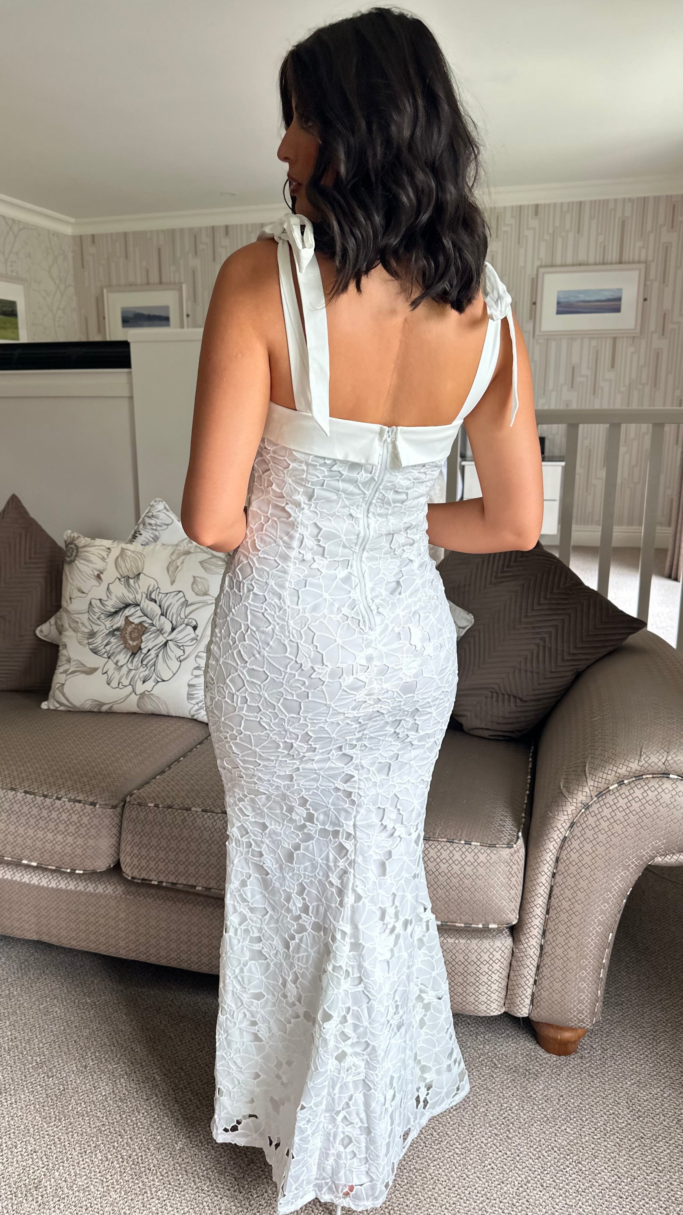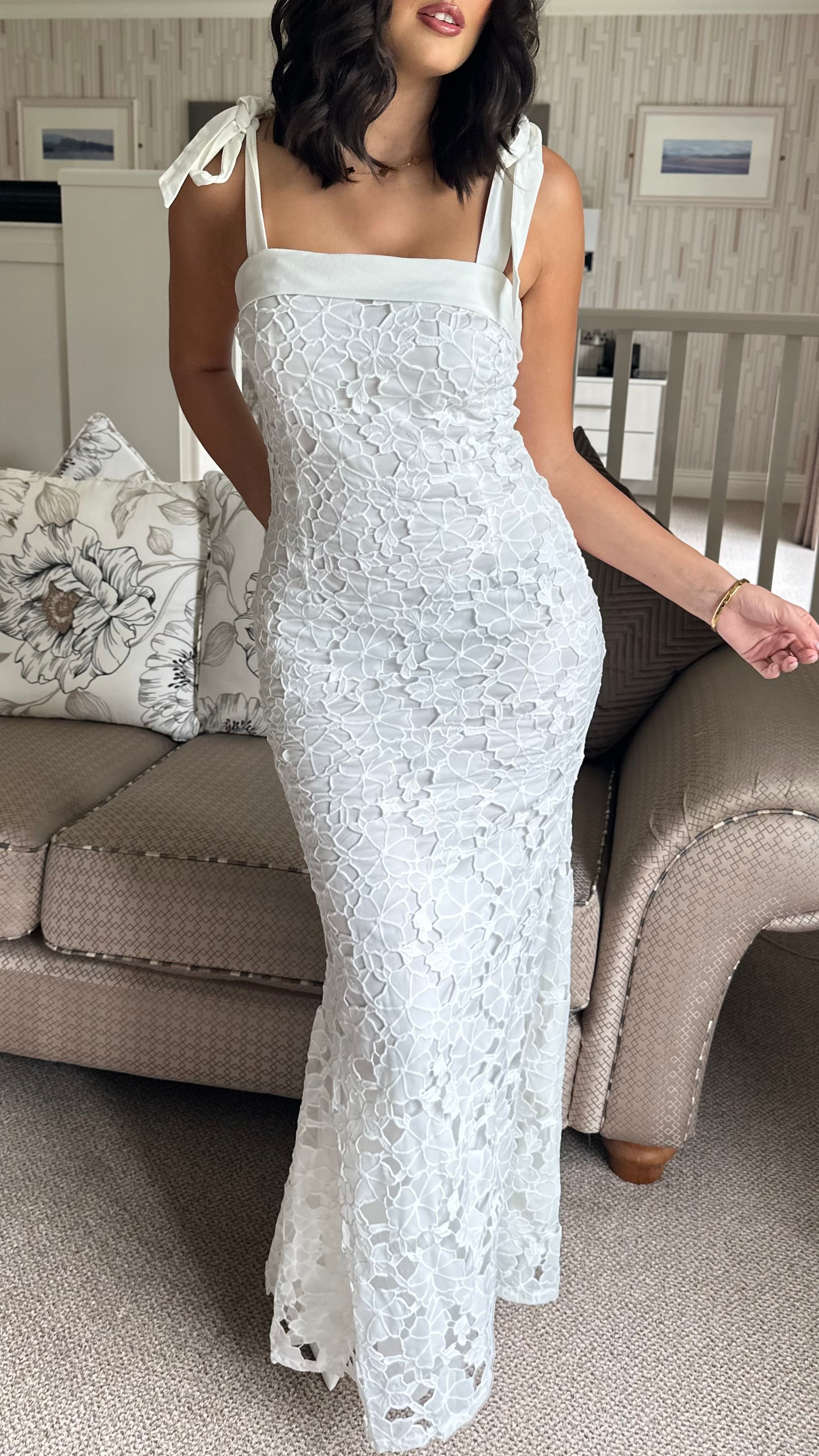 Lena White Embroidered Floral Detail Tie Strap Midi Dress