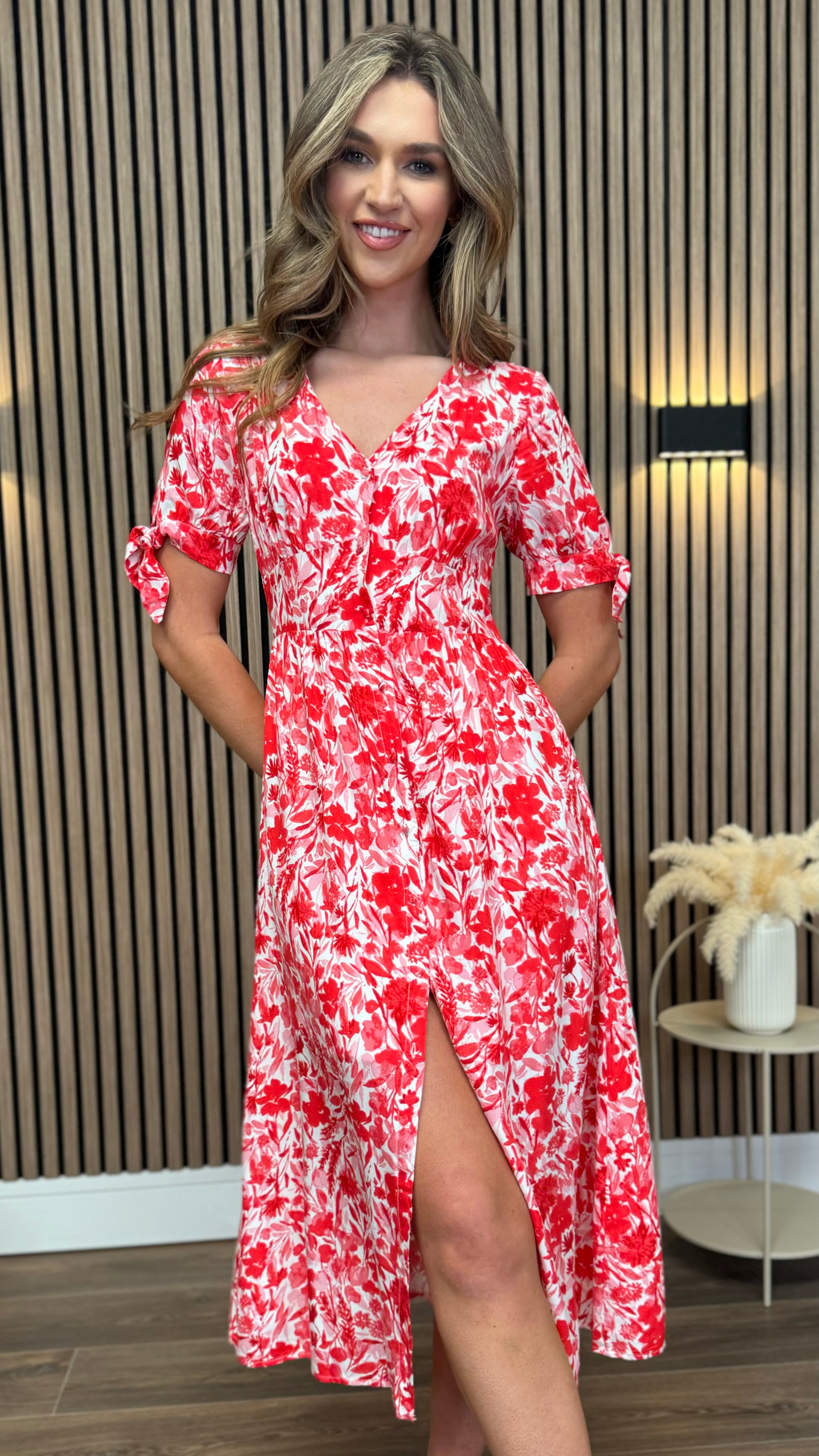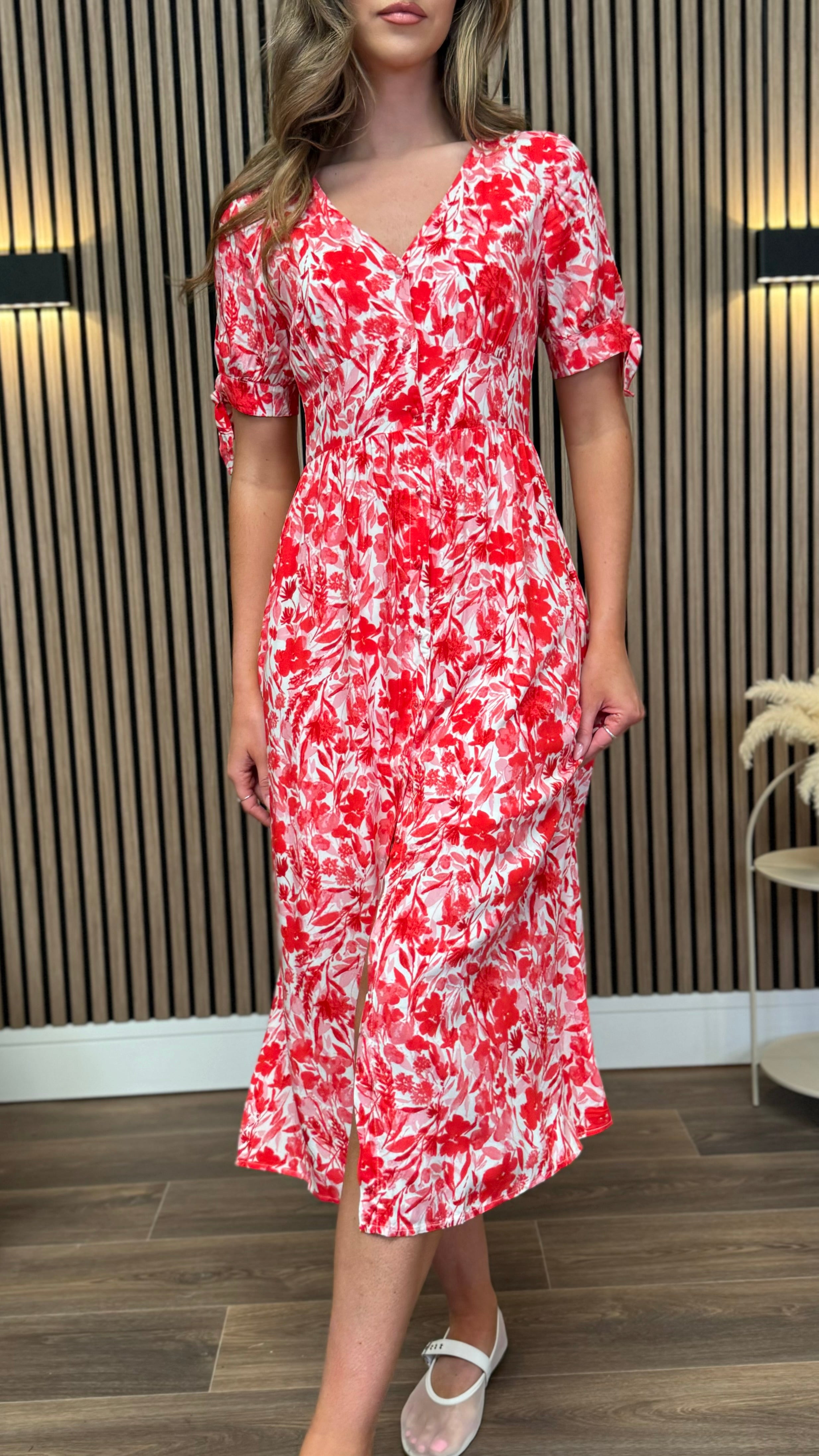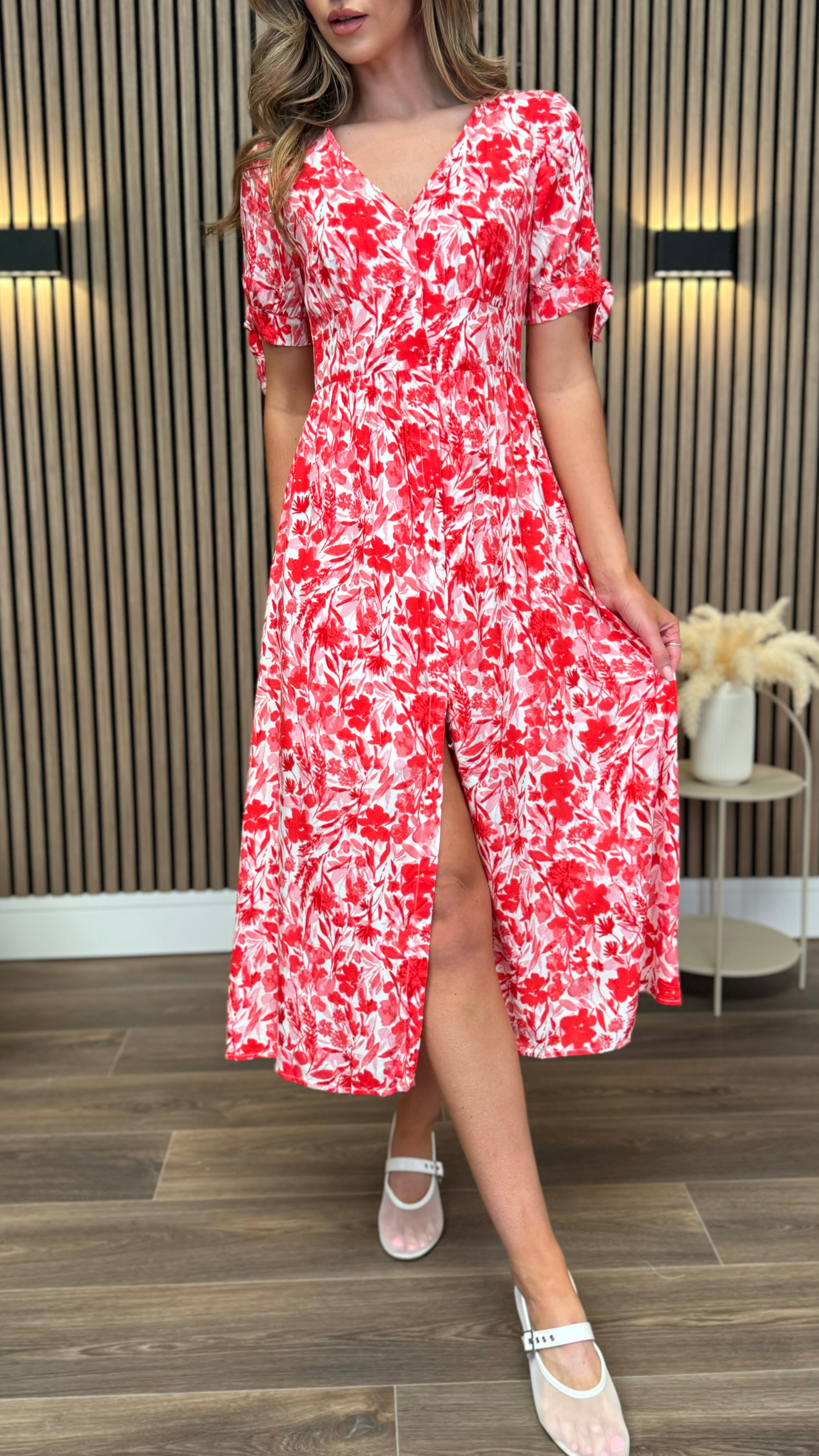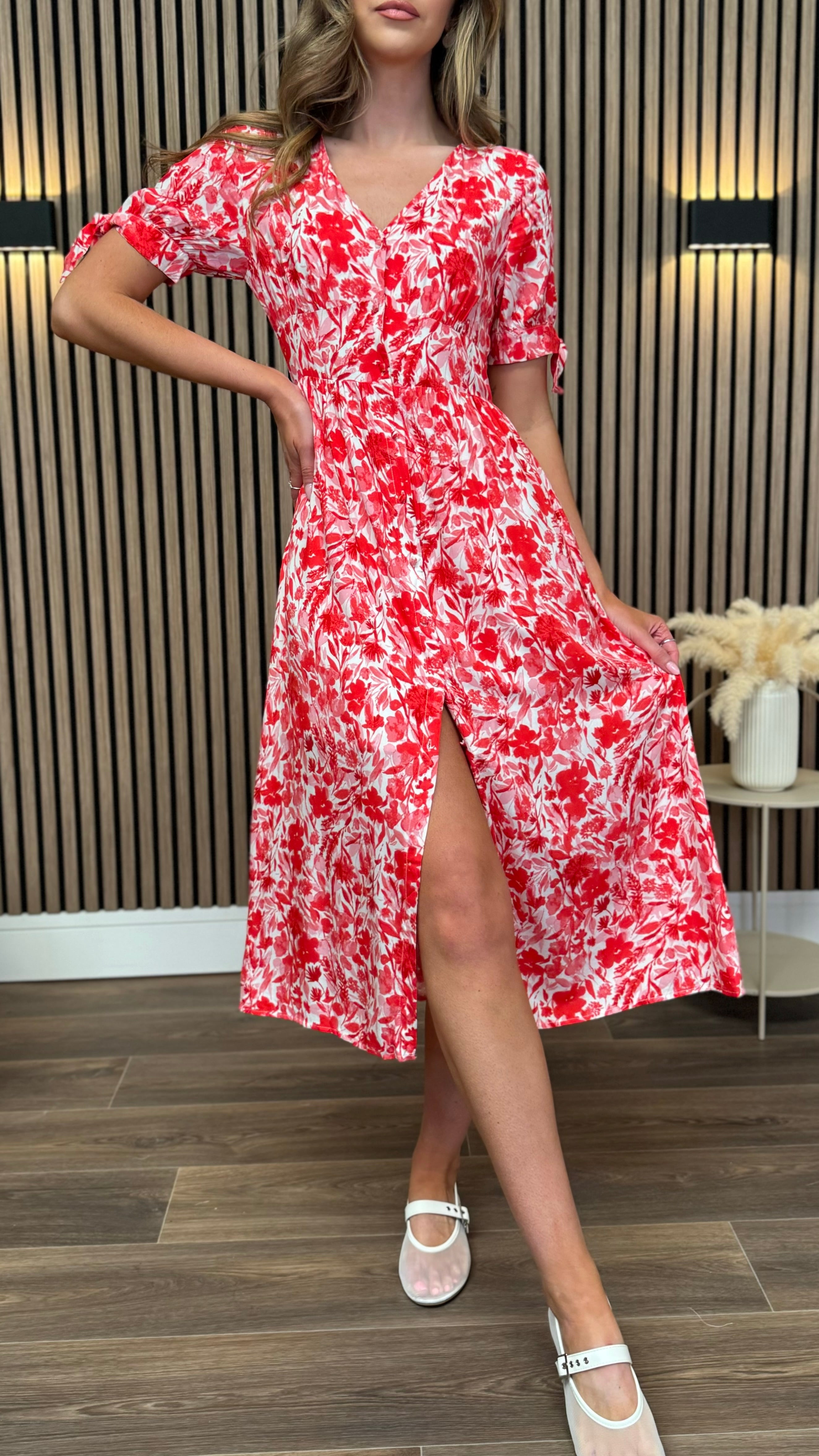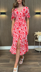 Step into sunshine with the Lilith Red & White Floral Button Up Midi Dress! 🌸 This playful dress features a charming floral print and easy button-up front, perfect for twirling through your day. Its midi length offers a flirty yet comfortable fit, making it ideal for brunch dates or garden parties. Add a splash of fun and freshness to your wardrobe with this delightful dress! 🌺✨