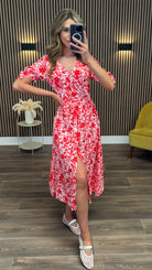 Lilith Red & White Floral Button Up Midi Dress