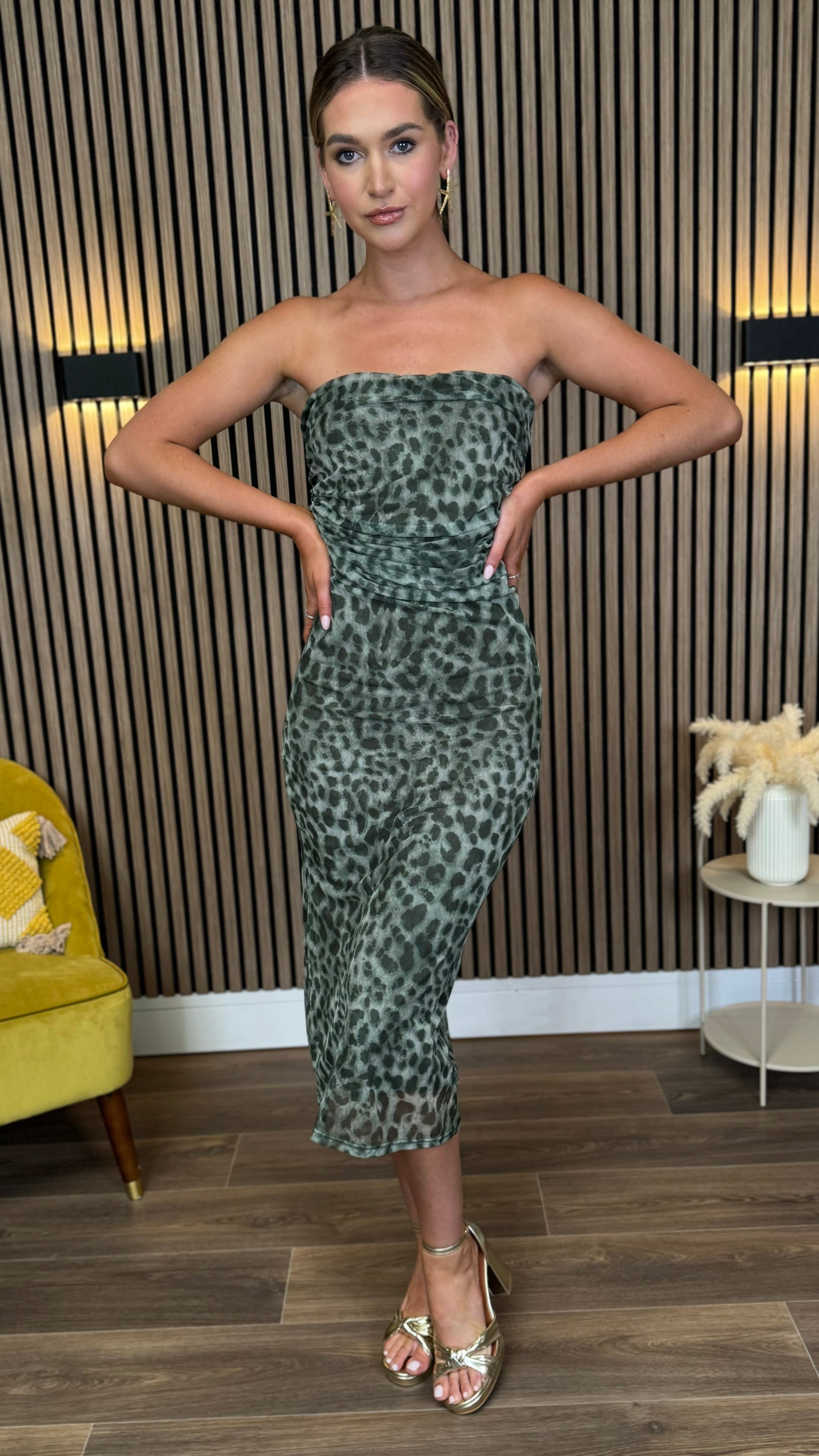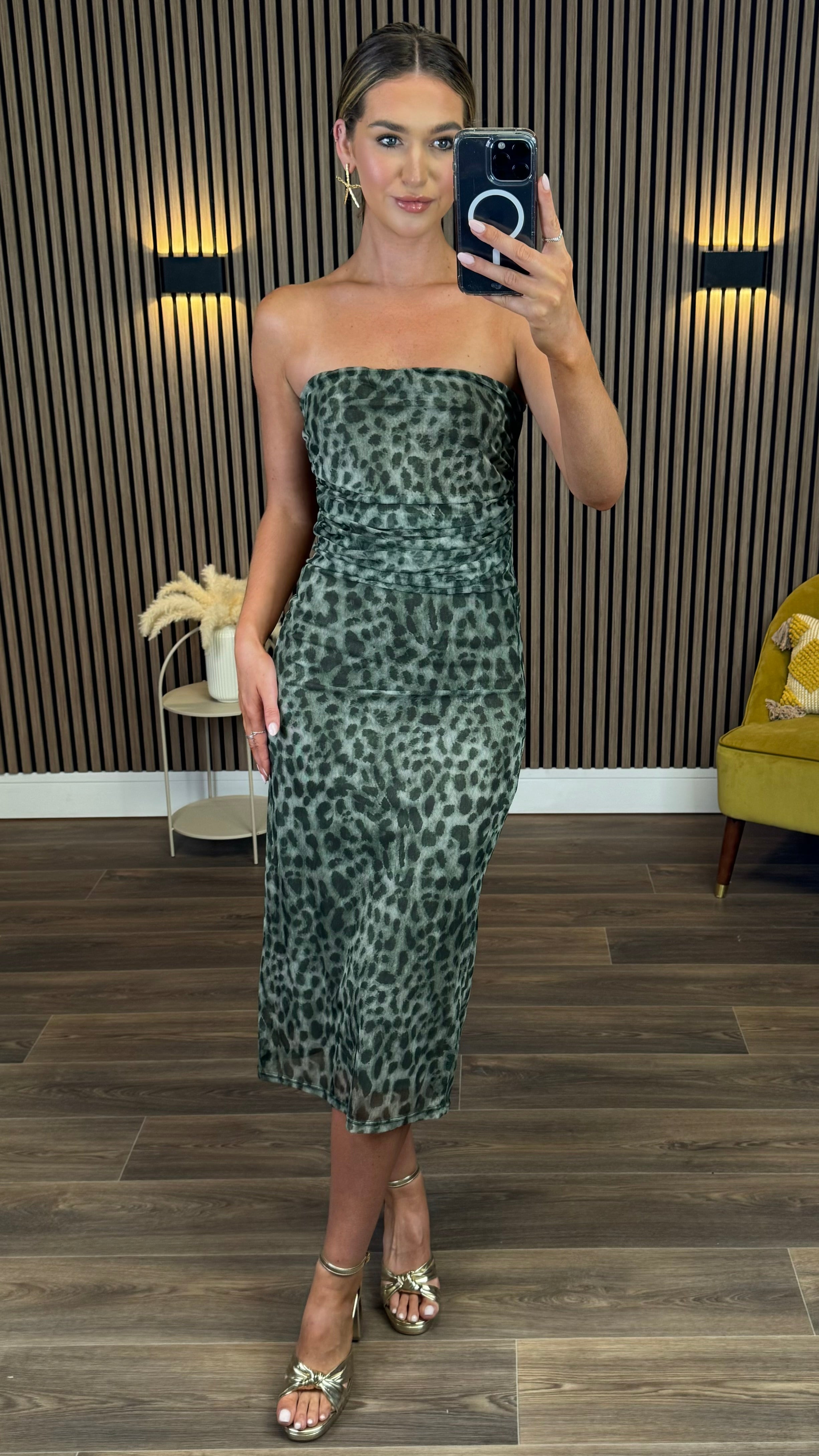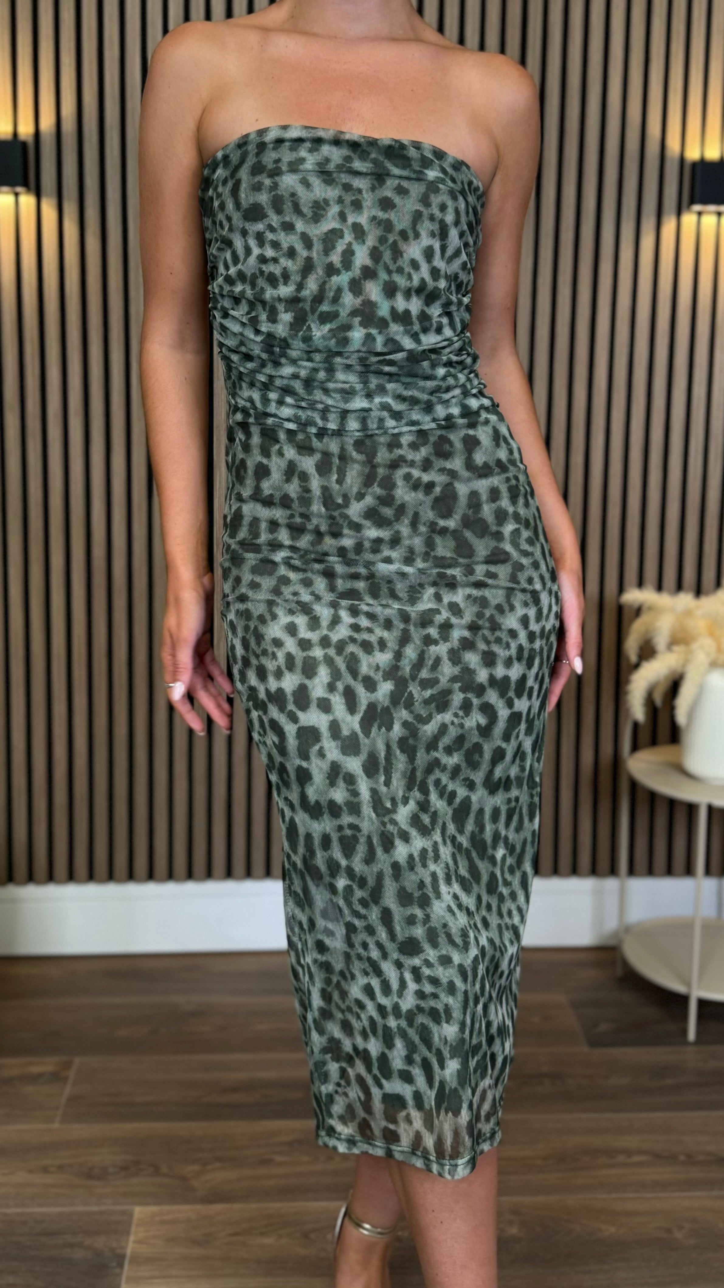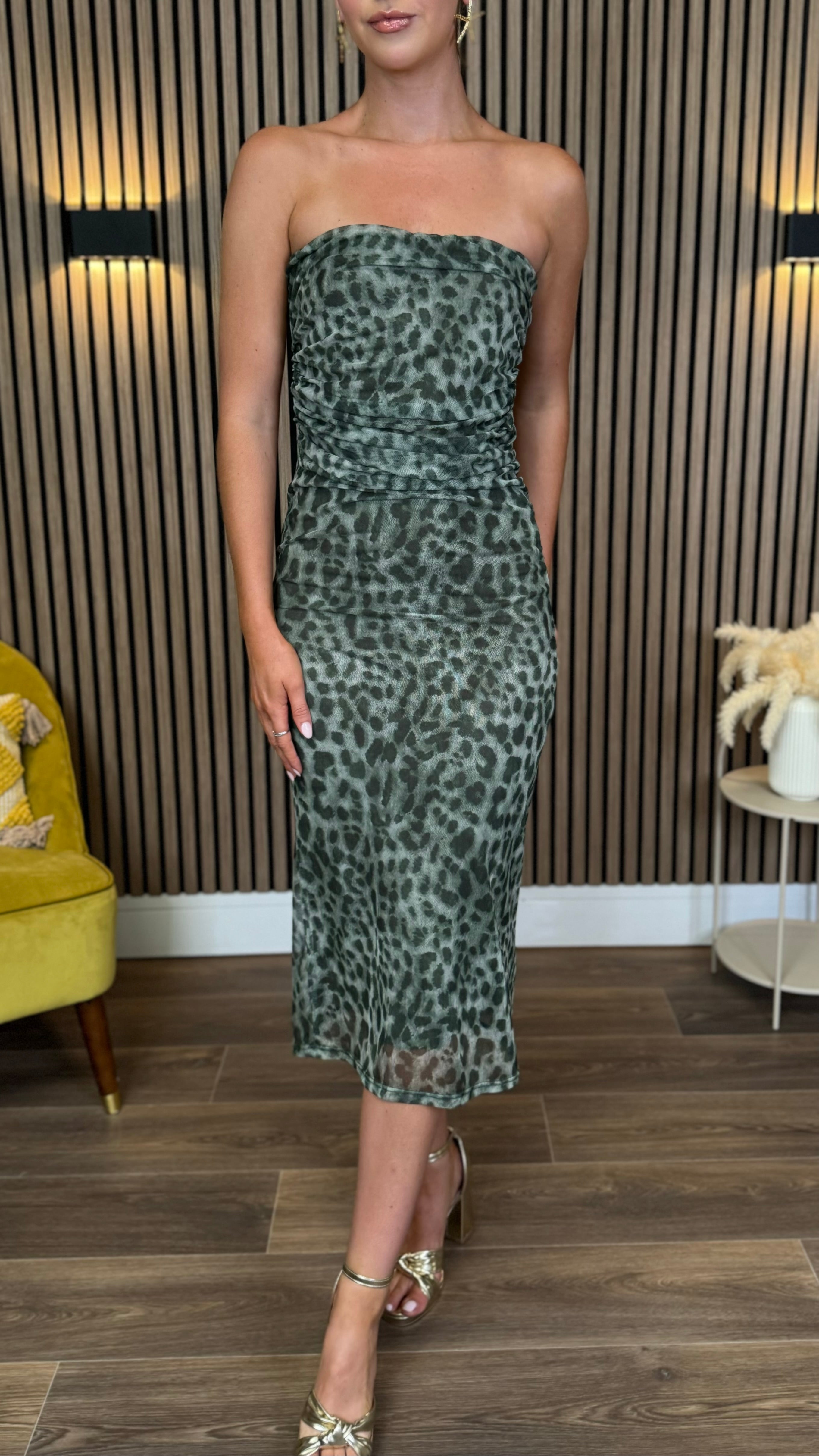 Lilo Khaki Animal Printed Strapless Midi Dress