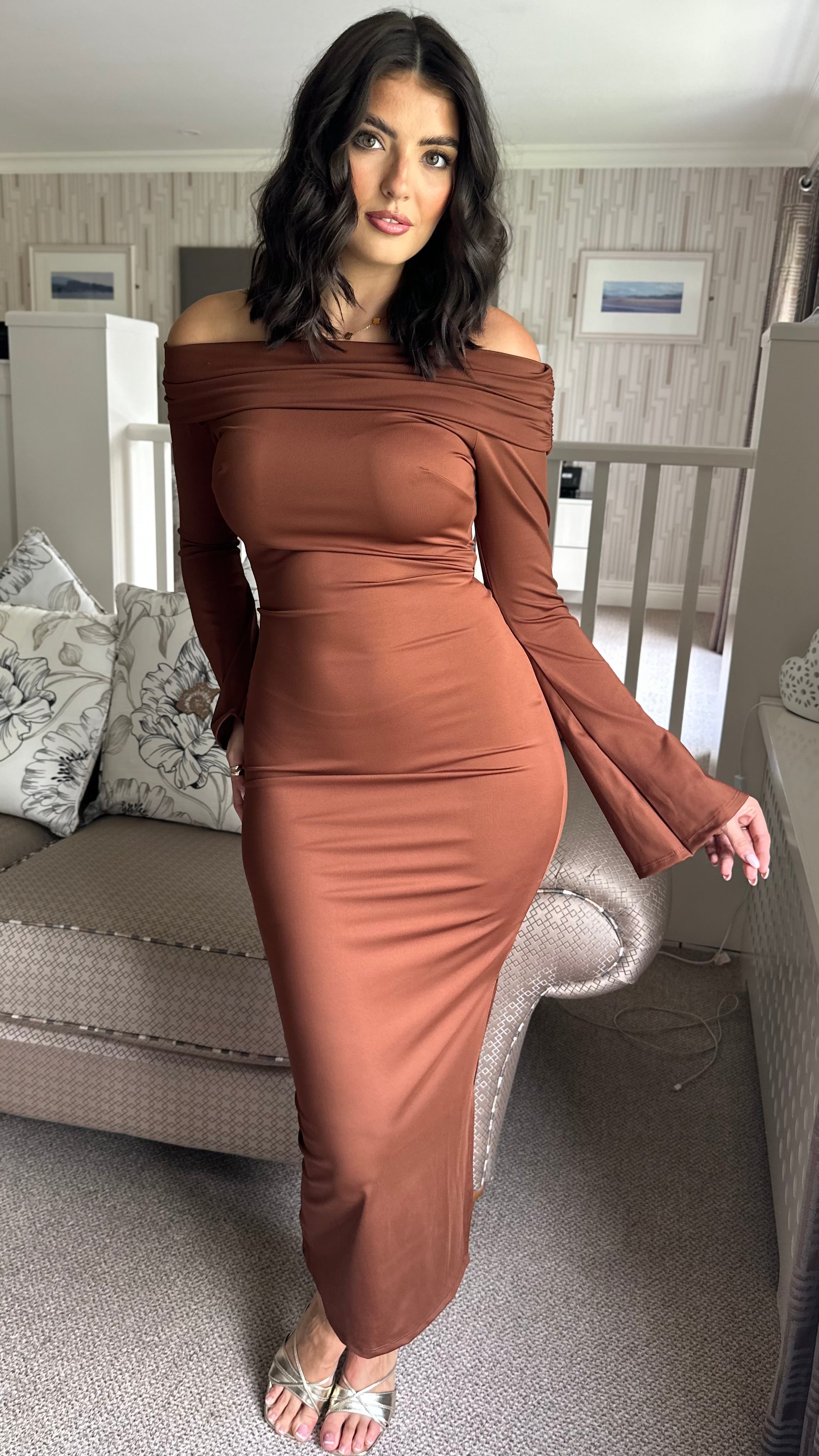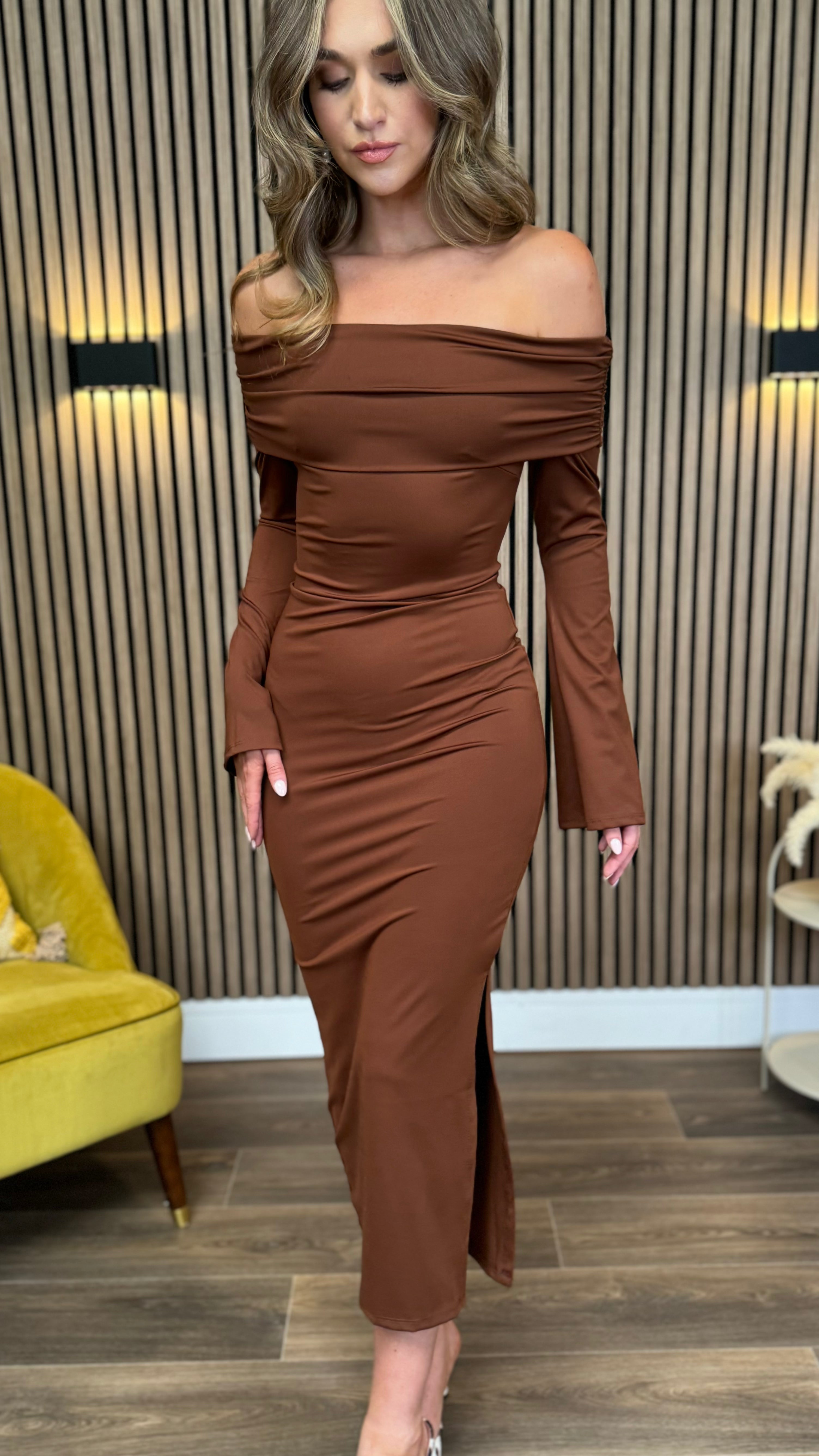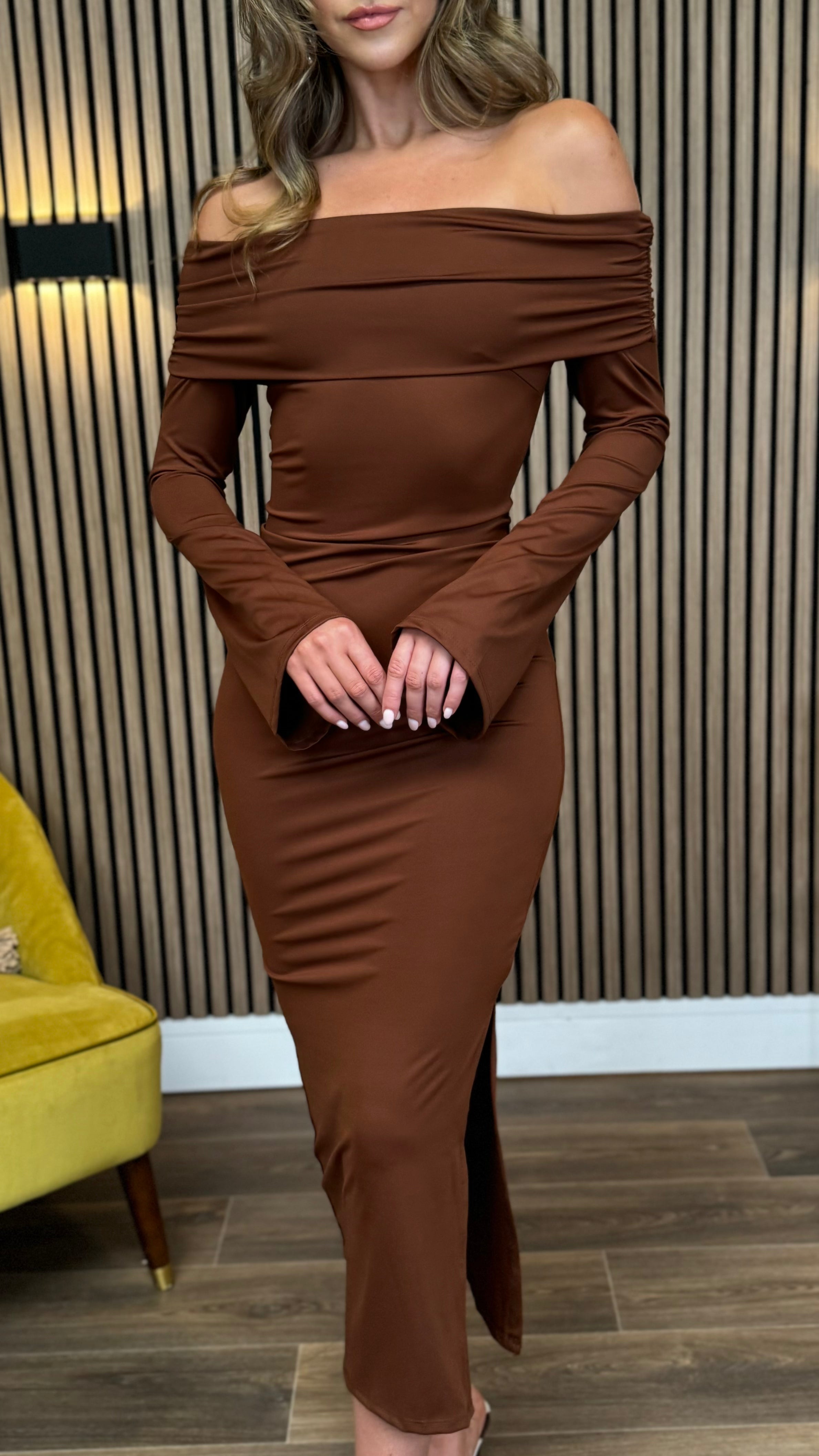 Lisbeth Chocolate Brown Off Shoulder Long Sleeve Midi Dress