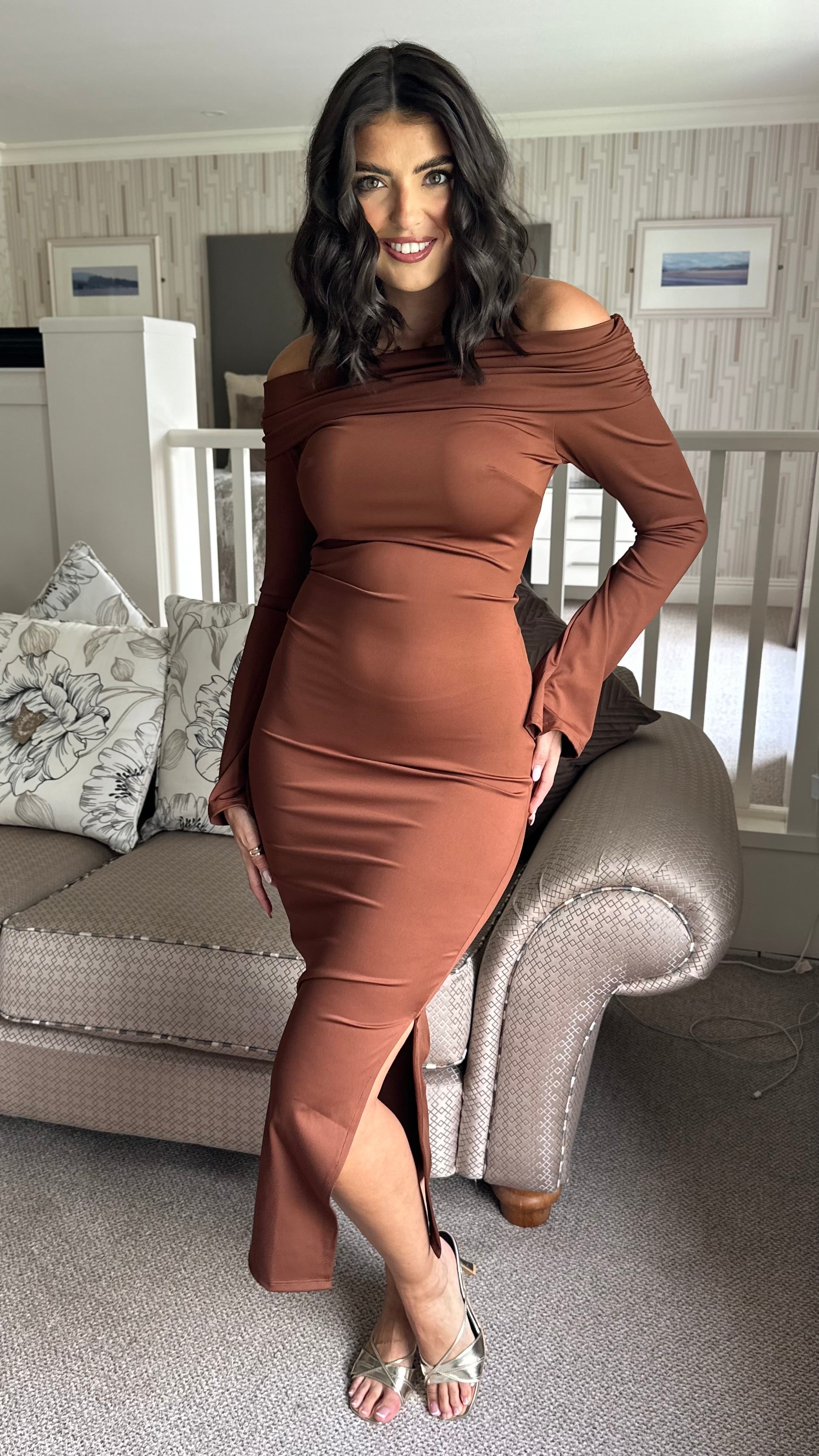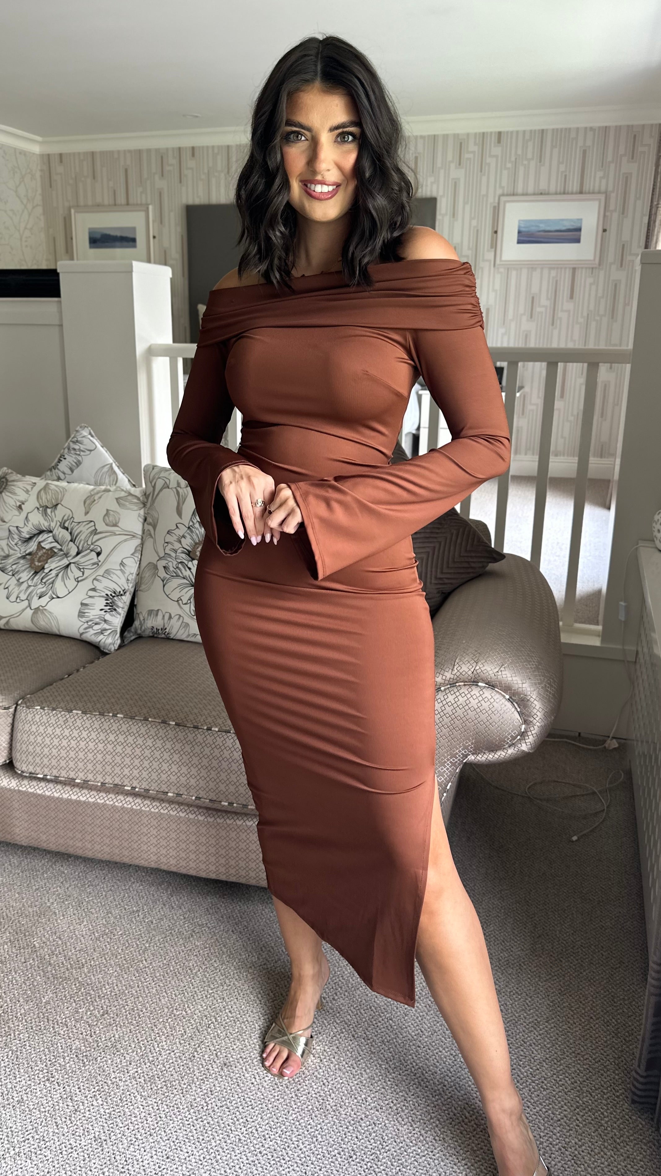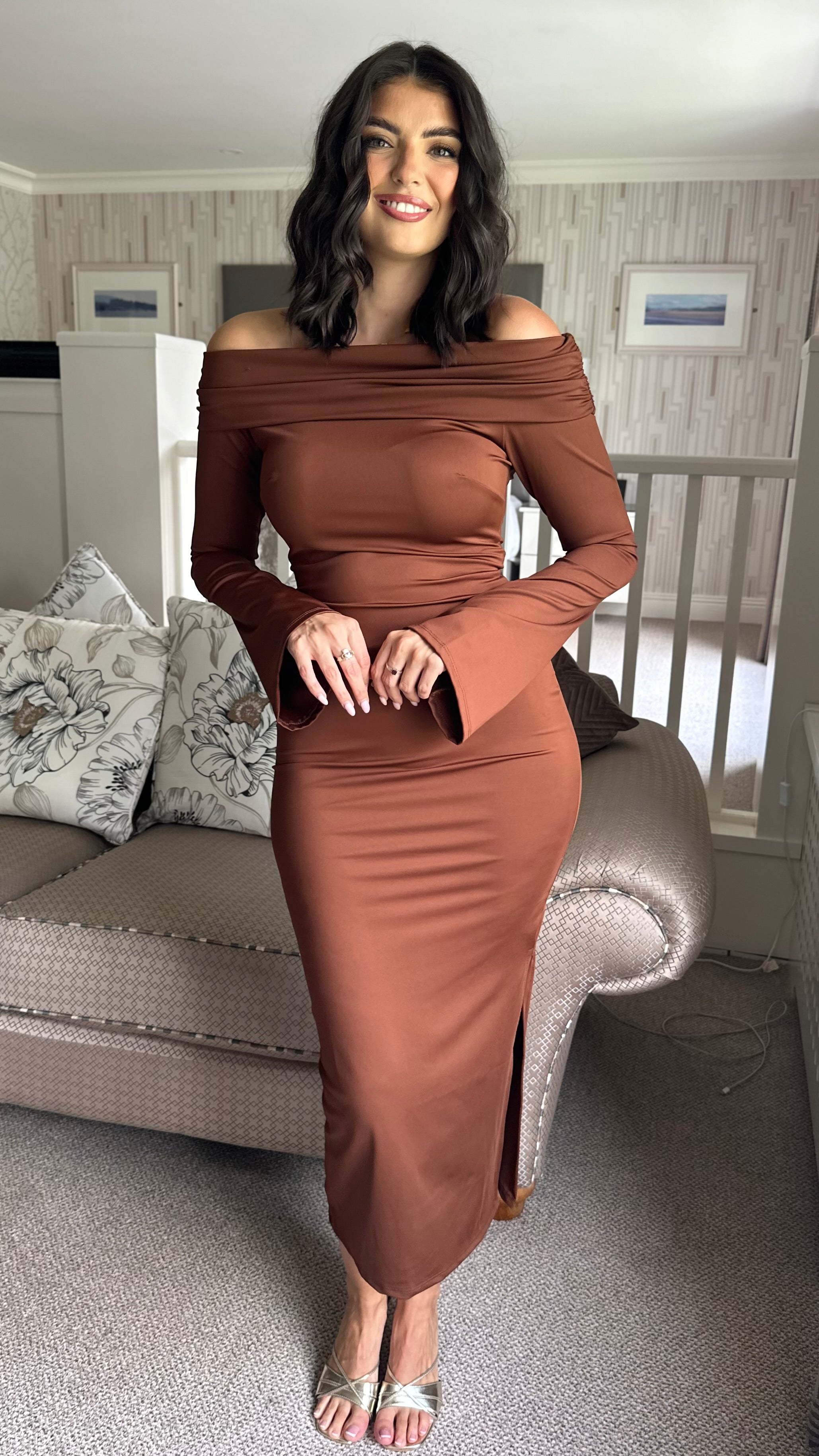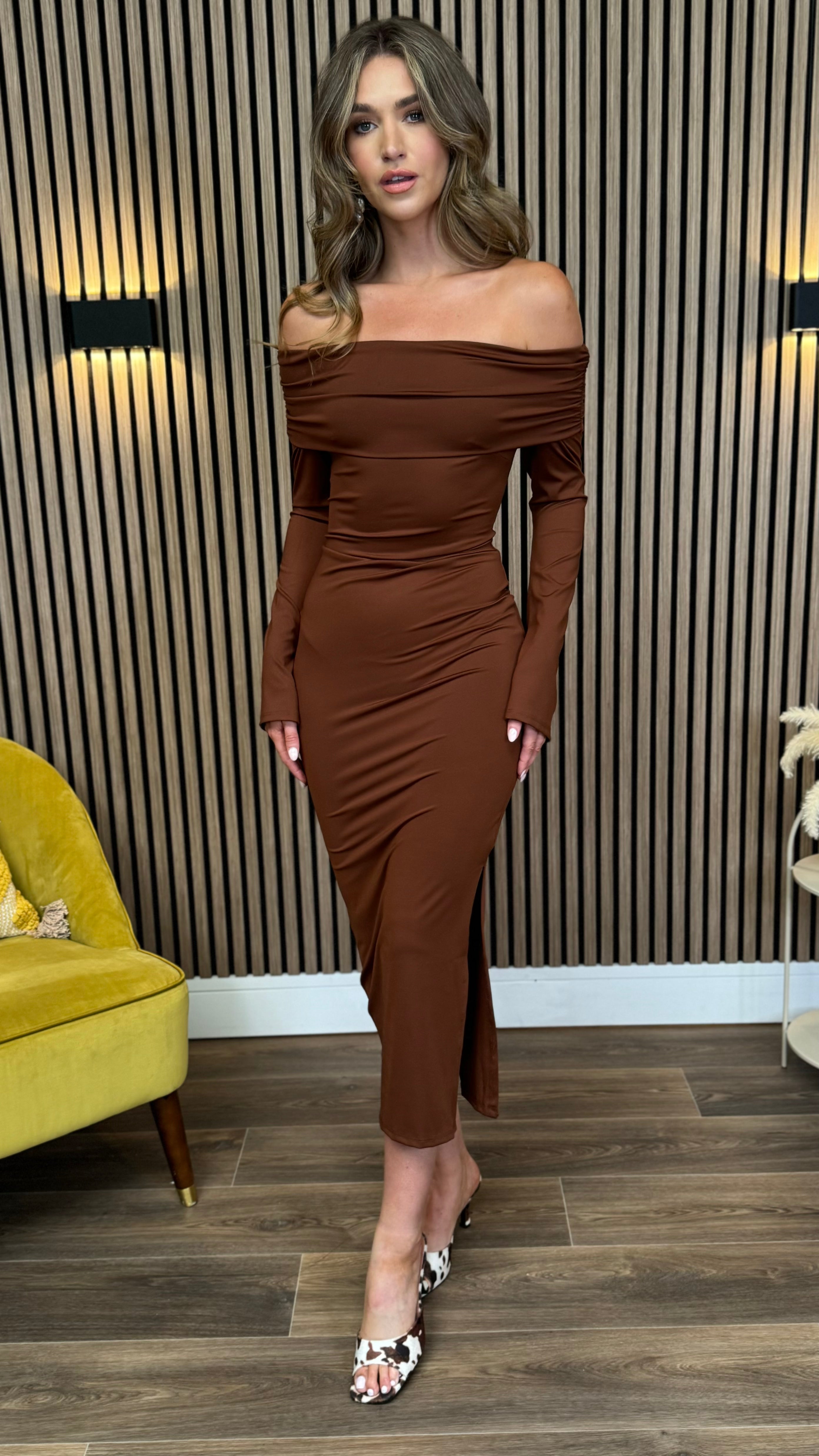 Lisbeth Chocolate Brown Off Shoulder Long Sleeve Midi Dress